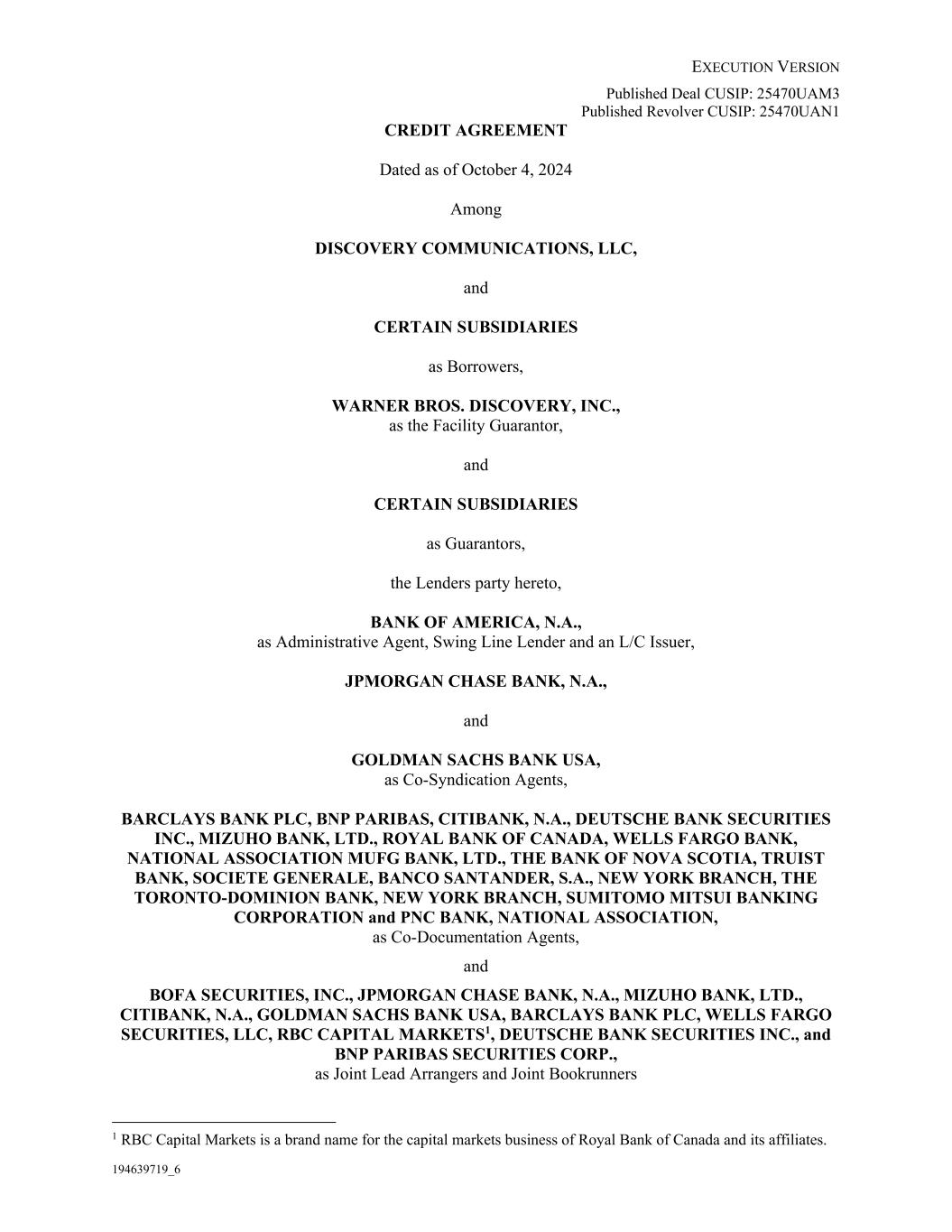 EXECUTION VERSION 194639719_6 Published Deal CUSIP: 25470UAM3 Published Revolver CUSIP: 25470UAN1 CREDIT AGREEMENT Dated as of October 4, 2024 Among DISCOVERY COMMUNICATIONS, LLC, and CERTAIN SUBSIDIARIES as Borrowers, WARNER BROS. DISCOVERY, INC., as the Facility Guarantor, and CERTAIN SUBSIDIARIES as Guarantors, the Lenders party hereto, BANK OF AMERICA, N.A., as Administrative Agent, Swing Line Lender and an L/C Issuer, JPMORGAN CHASE BANK, N.A., and GOLDMAN SACHS BANK USA, as Co-Syndication Agents, BARCLAYS BANK PLC, BNP PARIBAS, CITIBANK, N.A., DEUTSCHE BANK SECURITIES INC., MIZUHO BANK, LTD., ROYAL BANK OF CANADA, WELLS FARGO BANK, NATIONAL ASSOCIATION MUFG BANK, LTD., THE BANK OF NOVA SCOTIA, TRUIST BANK, SOCIETE GENERALE, BANCO SANTANDER, S.A., NEW YORK BRANCH, THE TORONTO-DOMINION BANK, NEW YORK BRANCH, SUMITOMO MITSUI BANKING CORPORATION and PNC BANK, NATIONAL ASSOCIATION, as Co-Documentation Agents, and BOFA SECURITIES, INC., JPMORGAN CHASE BANK, N.A., MIZUHO BANK, LTD., CITIBANK, N.A., GOLDMAN SACHS BANK USA, BARCLAYS BANK PLC, WELLS FARGO SECURITIES, LLC, RBC CAPITAL MARKETS1, DEUTSCHE BANK SECURITIES INC., and BNP PARIBAS SECURITIES CORP., as Joint Lead Arrangers and Joint Bookrunners 1 RBC Capital Markets is a brand name for the capital markets business of Royal Bank of Canada and its affiliates.