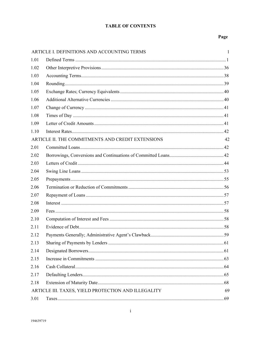 TABLE OF CONTENTS Page i 194639719 ARTICLE I. DEFINITIONS AND ACCOUNTING TERMS 1  1.01  Defined Terms ................................................................................................................................ 1  1.02  Other Interpretive Provisions ........................................................................................................ 36  1.03  Accounting Terms ......................................................................................................................... 38  1.04  Rounding ....................................................................................................................................... 39  1.05  Exchange Rates; Currency Equivalents ........................................................................................ 40  1.06  Additional Alternative Currencies ................................................................................................ 40  1.07  Change of Currency ...................................................................................................................... 41  1.08  Times of Day ................................................................................................................................ 41  1.09  Letter of Credit Amounts .............................................................................................................. 41  1.10  Interest Rates ................................................................................................................................. 42  ARTICLE II. THE COMMITMENTS AND CREDIT EXTENSIONS 42  2.01  Committed Loans .......................................................................................................................... 42  2.02  Borrowings, Conversions and Continuations of Committed Loans .............................................. 42  2.03  Letters of Credit ............................................................................................................................ 44  2.04  Swing Line Loans ......................................................................................................................... 53  2.05  Prepayments .................................................................................................................................. 55  2.06  Termination or Reduction of Commitments ................................................................................. 56  2.07  Repayment of Loans ..................................................................................................................... 57  2.08  Interest .......................................................................................................................................... 57  2.09  Fees ............................................................................................................................................... 58  2.10  Computation of Interest and Fees ................................................................................................. 58  2.11  Evidence of Debt........................................................................................................................... 58  2.12  Payments Generally; Administrative Agent’s Clawback .............................................................. 59  2.13  Sharing of Payments by Lenders .................................................................................................. 61  2.14  Designated Borrowers ................................................................................................................... 61  2.15  Increase in Commitments ............................................................................................................. 63  2.16  Cash Collateral .............................................................................................................................. 64  2.17  Defaulting Lenders........................................................................................................................ 65  2.18  Extension of Maturity Date ........................................................................................................... 68  ARTICLE III. TAXES, YIELD PROTECTION AND ILLEGALITY 69  3.01  Taxes ............................................................................................................................................. 69