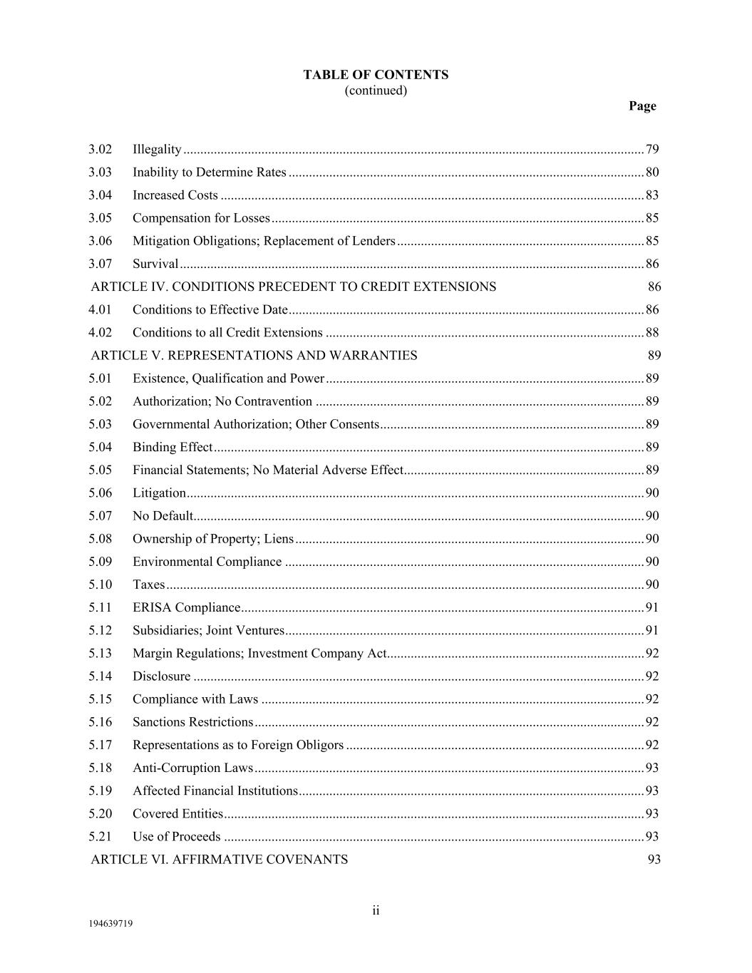 TABLE OF CONTENTS (continued) Page ii 194639719 3.02  Illegality ........................................................................................................................................ 79  3.03  Inability to Determine Rates ......................................................................................................... 80  3.04  Increased Costs ............................................................................................................................. 83  3.05  Compensation for Losses .............................................................................................................. 85  3.06  Mitigation Obligations; Replacement of Lenders ......................................................................... 85  3.07  Survival ......................................................................................................................................... 86  ARTICLE IV. CONDITIONS PRECEDENT TO CREDIT EXTENSIONS 86  4.01  Conditions to Effective Date ......................................................................................................... 86  4.02  Conditions to all Credit Extensions .............................................................................................. 88  ARTICLE V. REPRESENTATIONS AND WARRANTIES 89  5.01  Existence, Qualification and Power .............................................................................................. 89  5.02  Authorization; No Contravention ................................................................................................. 89  5.03  Governmental Authorization; Other Consents .............................................................................. 89  5.04  Binding Effect ............................................................................................................................... 89  5.05  Financial Statements; No Material Adverse Effect ....................................................................... 89  5.06  Litigation ....................................................................................................................................... 90  5.07  No Default ..................................................................................................................................... 90  5.08  Ownership of Property; Liens ....................................................................................................... 90  5.09  Environmental Compliance .......................................................................................................... 90  5.10  Taxes ............................................................................................................................................. 90  5.11  ERISA Compliance ....................................................................................................................... 91  5.12  Subsidiaries; Joint Ventures .......................................................................................................... 91  5.13  Margin Regulations; Investment Company Act ............................................................................ 92  5.14  Disclosure ..................................................................................................................................... 92  5.15  Compliance with Laws ................................................................................................................. 92  5.16  Sanctions Restrictions ................................................................................................................... 92  5.17  Representations as to Foreign Obligors ........................................................................................ 92  5.18  Anti-Corruption Laws ................................................................................................................... 93  5.19  Affected Financial Institutions ...................................................................................................... 93  5.20  Covered Entities ............................................................................................................................ 93  5.21  Use of Proceeds ............................................................................................................................ 93  ARTICLE VI. AFFIRMATIVE COVENANTS 93