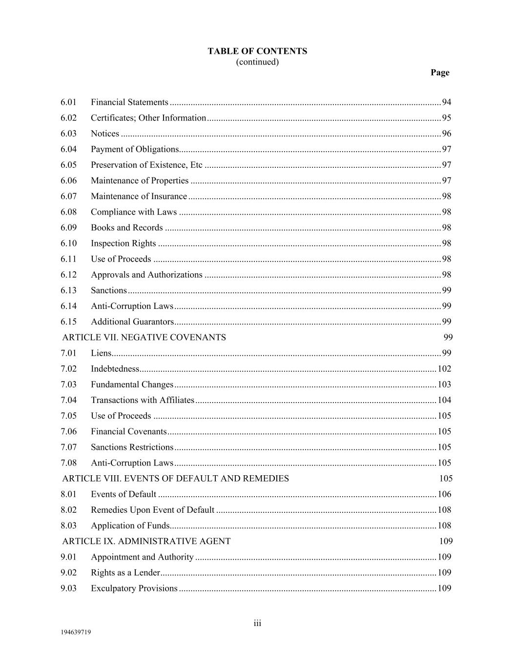 TABLE OF CONTENTS (continued) Page iii 194639719 6.01  Financial Statements ..................................................................................................................... 94  6.02  Certificates; Other Information ..................................................................................................... 95  6.03  Notices .......................................................................................................................................... 96  6.04  Payment of Obligations ................................................................................................................. 97  6.05  Preservation of Existence, Etc ...................................................................................................... 97  6.06  Maintenance of Properties ............................................................................................................ 97  6.07  Maintenance of Insurance ............................................................................................................. 98  6.08  Compliance with Laws ................................................................................................................. 98  6.09  Books and Records ....................................................................................................................... 98  6.10  Inspection Rights .......................................................................................................................... 98  6.11  Use of Proceeds ............................................................................................................................ 98  6.12  Approvals and Authorizations ...................................................................................................... 98  6.13  Sanctions ....................................................................................................................................... 99  6.14  Anti-Corruption Laws ................................................................................................................... 99  6.15  Additional Guarantors ................................................................................................................... 99  ARTICLE VII. NEGATIVE COVENANTS 99  7.01  Liens .............................................................................................................................................. 99  7.02  Indebtedness ................................................................................................................................ 102  7.03  Fundamental Changes ................................................................................................................. 103  7.04  Transactions with Affiliates ........................................................................................................ 104  7.05  Use of Proceeds .......................................................................................................................... 105  7.06  Financial Covenants .................................................................................................................... 105  7.07  Sanctions Restrictions ................................................................................................................. 105  7.08  Anti-Corruption Laws ................................................................................................................. 105  ARTICLE VIII. EVENTS OF DEFAULT AND REMEDIES 105  8.01  Events of Default ........................................................................................................................ 106  8.02  Remedies Upon Event of Default ............................................................................................... 108  8.03  Application of Funds................................................................................................................... 108  ARTICLE IX. ADMINISTRATIVE AGENT 109  9.01  Appointment and Authority ........................................................................................................ 109  9.02  Rights as a Lender ....................................................................................................................... 109  9.03  Exculpatory Provisions ............................................................................................................... 109