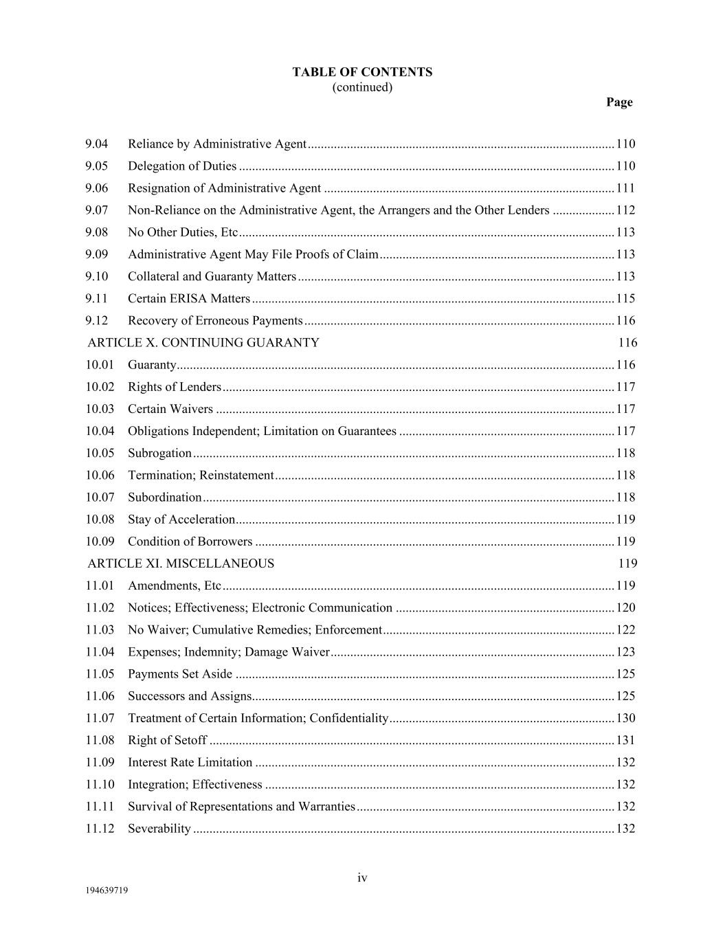 TABLE OF CONTENTS (continued) Page iv 194639719 9.04  Reliance by Administrative Agent .............................................................................................. 110  9.05  Delegation of Duties ................................................................................................................... 110  9.06  Resignation of Administrative Agent ......................................................................................... 111  9.07  Non-Reliance on the Administrative Agent, the Arrangers and the Other Lenders ................... 112  9.08  No Other Duties, Etc ................................................................................................................... 113  9.09  Administrative Agent May File Proofs of Claim ........................................................................ 113  9.10  Collateral and Guaranty Matters ................................................................................................. 113  9.11  Certain ERISA Matters ............................................................................................................... 115  9.12  Recovery of Erroneous Payments ............................................................................................... 116  ARTICLE X. CONTINUING GUARANTY 116  10.01  Guaranty ...................................................................................................................................... 116  10.02  Rights of Lenders ........................................................................................................................ 117  10.03  Certain Waivers .......................................................................................................................... 117  10.04  Obligations Independent; Limitation on Guarantees .................................................................. 117  10.05  Subrogation ................................................................................................................................. 118  10.06  Termination; Reinstatement ........................................................................................................ 118  10.07  Subordination .............................................................................................................................. 118  10.08  Stay of Acceleration .................................................................................................................... 119  10.09  Condition of Borrowers .............................................................................................................. 119  ARTICLE XI. MISCELLANEOUS 119  11.01  Amendments, Etc ........................................................................................................................ 119  11.02  Notices; Effectiveness; Electronic Communication ................................................................... 120  11.03  No Waiver; Cumulative Remedies; Enforcement ....................................................................... 122  11.04  Expenses; Indemnity; Damage Waiver ....................................................................................... 123  11.05  Payments Set Aside .................................................................................................................... 125  11.06  Successors and Assigns ............................................................................................................... 125  11.07  Treatment of Certain Information; Confidentiality ..................................................................... 130  11.08  Right of Setoff ............................................................................................................................ 131  11.09  Interest Rate Limitation .............................................................................................................. 132  11.10  Integration; Effectiveness ........................................................................................................... 132  11.11  Survival of Representations and Warranties ............................................................................... 132  11.12  Severability ................................................................................................................................. 132