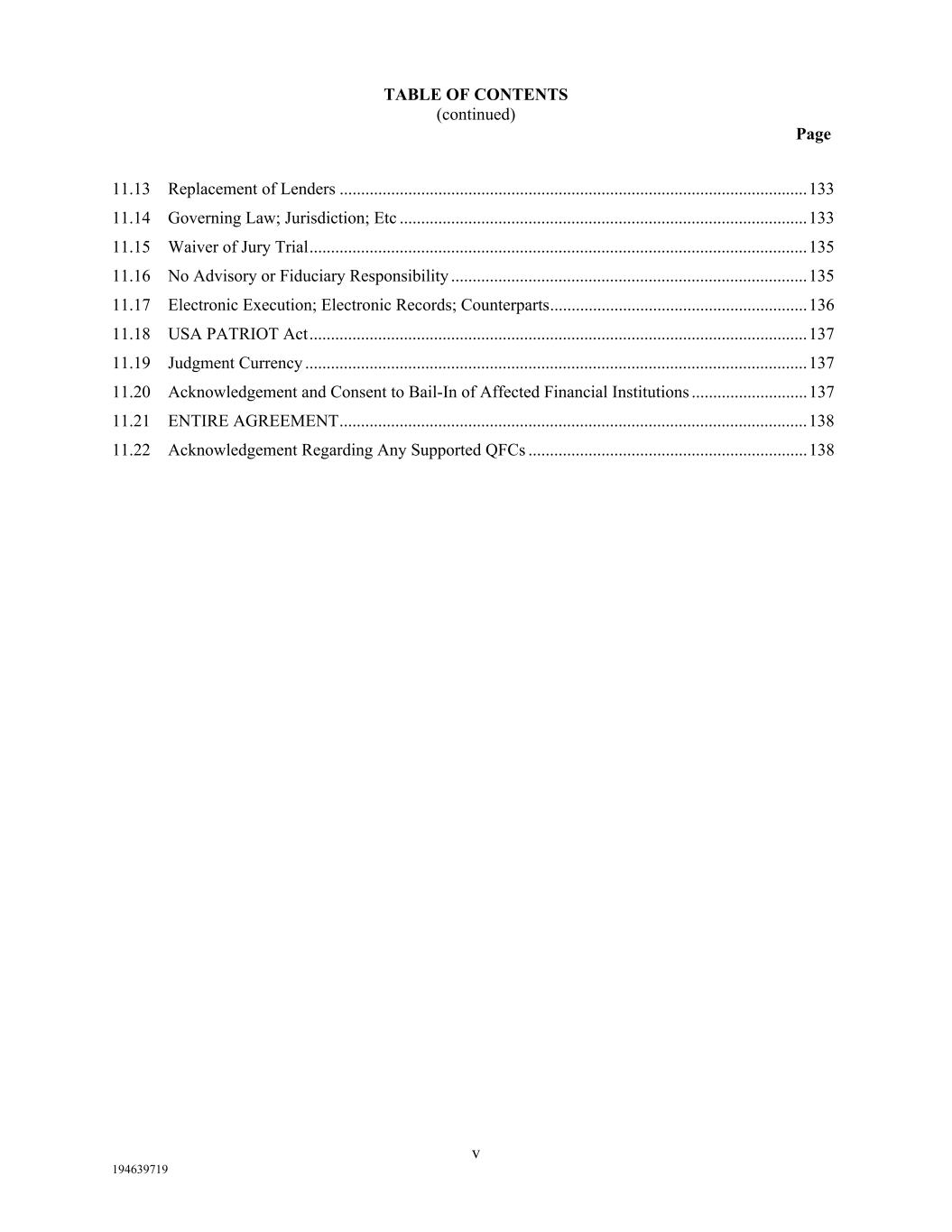 TABLE OF CONTENTS (continued) Page v 194639719 11.13  Replacement of Lenders ............................................................................................................. 133  11.14  Governing Law; Jurisdiction; Etc ............................................................................................... 133  11.15  Waiver of Jury Trial .................................................................................................................... 135  11.16  No Advisory or Fiduciary Responsibility ................................................................................... 135  11.17  Electronic Execution; Electronic Records; Counterparts ............................................................ 136  11.18  USA PATRIOT Act .................................................................................................................... 137  11.19  Judgment Currency ..................................................................................................................... 137  11.20  Acknowledgement and Consent to Bail-In of Affected Financial Institutions ........................... 137  11.21  ENTIRE AGREEMENT ............................................................................................................. 138  11.22  Acknowledgement Regarding Any Supported QFCs ................................................................. 138