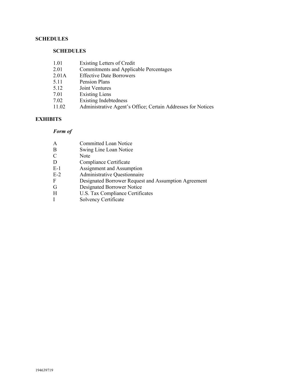 194639719 SCHEDULES SCHEDULES 1.01 Existing Letters of Credit 2.01 Commitments and Applicable Percentages 2.01A Effective Date Borrowers 5.11 Pension Plans 5.12 Joint Ventures 7.01 Existing Liens 7.02 Existing Indebtedness 11.02 Administrative Agent’s Office; Certain Addresses for Notices EXHIBITS Form of A Committed Loan Notice B Swing Line Loan Notice C Note D Compliance Certificate E-1 Assignment and Assumption E-2 Administrative Questionnaire F Designated Borrower Request and Assumption Agreement G Designated Borrower Notice H U.S. Tax Compliance Certificates I Solvency Certificate