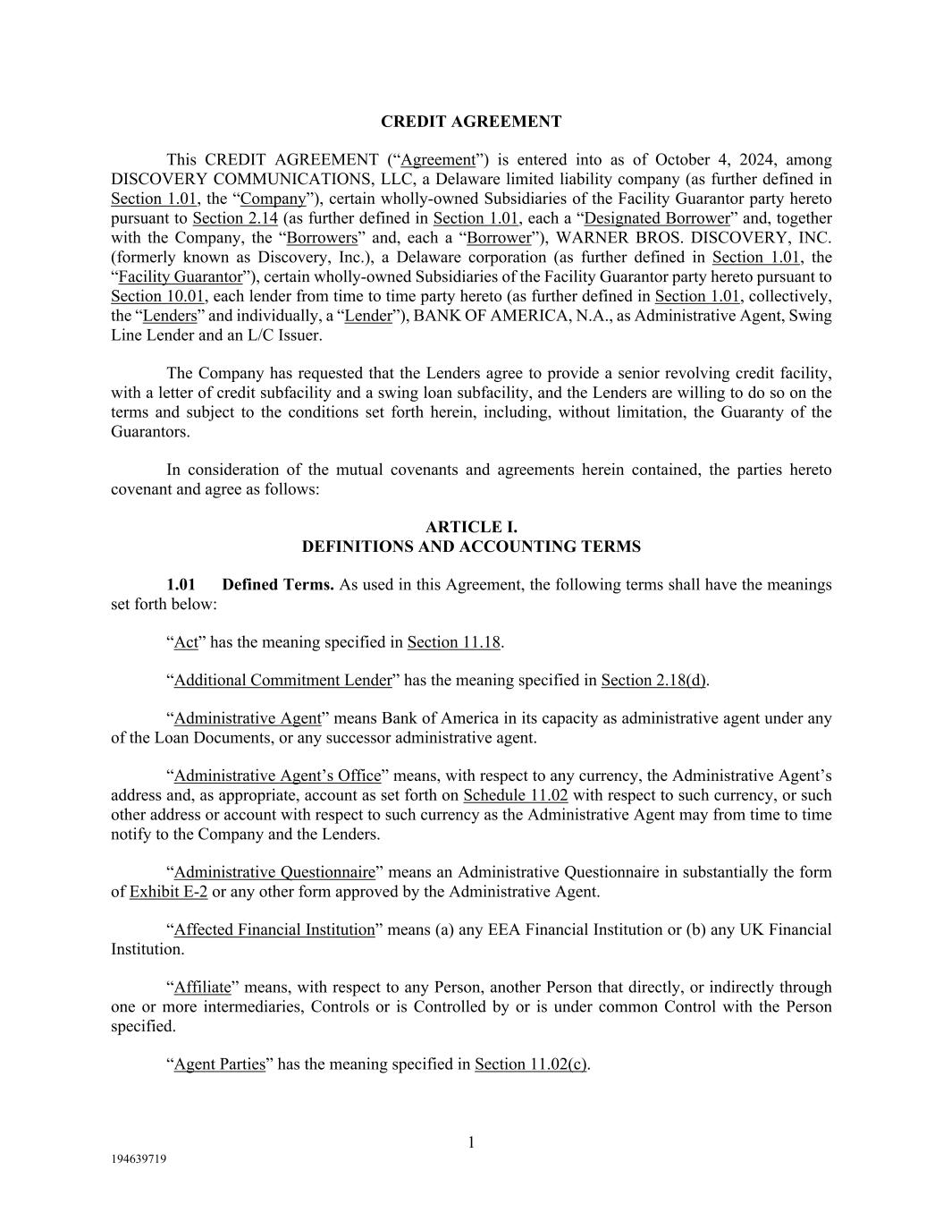 1 194639719 CREDIT AGREEMENT This CREDIT AGREEMENT (“Agreement”) is entered into as of October 4, 2024, among DISCOVERY COMMUNICATIONS, LLC, a Delaware limited liability company (as further defined in Section 1.01, the “Company”), certain wholly-owned Subsidiaries of the Facility Guarantor party hereto pursuant to Section 2.14 (as further defined in Section 1.01, each a “Designated Borrower” and, together with the Company, the “Borrowers” and, each a “Borrower”), WARNER BROS. DISCOVERY, INC. (formerly known as Discovery, Inc.), a Delaware corporation (as further defined in Section 1.01, the “Facility Guarantor”), certain wholly-owned Subsidiaries of the Facility Guarantor party hereto pursuant to Section 10.01, each lender from time to time party hereto (as further defined in Section 1.01, collectively, the “Lenders” and individually, a “Lender”), BANK OF AMERICA, N.A., as Administrative Agent, Swing Line Lender and an L/C Issuer. The Company has requested that the Lenders agree to provide a senior revolving credit facility, with a letter of credit subfacility and a swing loan subfacility, and the Lenders are willing to do so on the terms and subject to the conditions set forth herein, including, without limitation, the Guaranty of the Guarantors. In consideration of the mutual covenants and agreements herein contained, the parties hereto covenant and agree as follows: ARTICLE I. DEFINITIONS AND ACCOUNTING TERMS 1.01 Defined Terms. As used in this Agreement, the following terms shall have the meanings set forth below: “Act” has the meaning specified in Section 11.18. “Additional Commitment Lender” has the meaning specified in Section 2.18(d). “Administrative Agent” means Bank of America in its capacity as administrative agent under any of the Loan Documents, or any successor administrative agent. “Administrative Agent’s Office” means, with respect to any currency, the Administrative Agent’s address and, as appropriate, account as set forth on Schedule 11.02 with respect to such currency, or such other address or account with respect to such currency as the Administrative Agent may from time to time notify to the Company and the Lenders. “Administrative Questionnaire” means an Administrative Questionnaire in substantially the form of Exhibit E-2 or any other form approved by the Administrative Agent. “Affected Financial Institution” means (a) any EEA Financial Institution or (b) any UK Financial Institution. “Affiliate” means, with respect to any Person, another Person that directly, or indirectly through one or more intermediaries, Controls or is Controlled by or is under common Control with the Person specified. “Agent Parties” has the meaning specified in Section 11.02(c).