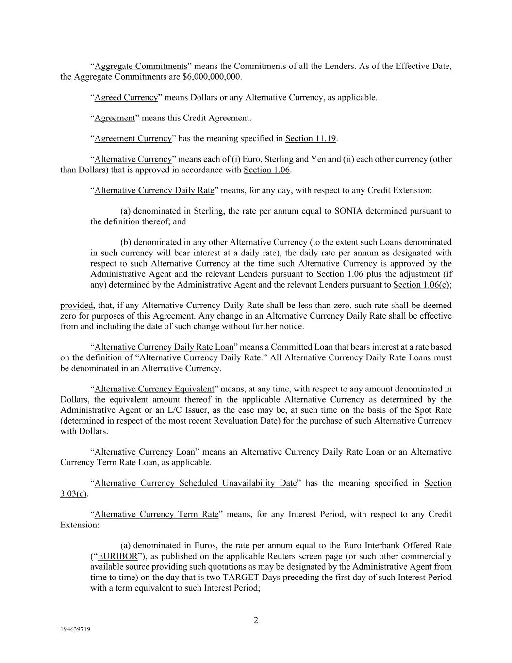 2 194639719 “Aggregate Commitments” means the Commitments of all the Lenders. As of the Effective Date, the Aggregate Commitments are $6,000,000,000. “Agreed Currency” means Dollars or any Alternative Currency, as applicable. “Agreement” means this Credit Agreement. “Agreement Currency” has the meaning specified in Section 11.19. “Alternative Currency” means each of (i) Euro, Sterling and Yen and (ii) each other currency (other than Dollars) that is approved in accordance with Section 1.06. “Alternative Currency Daily Rate” means, for any day, with respect to any Credit Extension: (a) denominated in Sterling, the rate per annum equal to SONIA determined pursuant to the definition thereof; and (b) denominated in any other Alternative Currency (to the extent such Loans denominated in such currency will bear interest at a daily rate), the daily rate per annum as designated with respect to such Alternative Currency at the time such Alternative Currency is approved by the Administrative Agent and the relevant Lenders pursuant to Section 1.06 plus the adjustment (if any) determined by the Administrative Agent and the relevant Lenders pursuant to Section 1.06(c); provided, that, if any Alternative Currency Daily Rate shall be less than zero, such rate shall be deemed zero for purposes of this Agreement. Any change in an Alternative Currency Daily Rate shall be effective from and including the date of such change without further notice. “Alternative Currency Daily Rate Loan” means a Committed Loan that bears interest at a rate based on the definition of “Alternative Currency Daily Rate.” All Alternative Currency Daily Rate Loans must be denominated in an Alternative Currency. “Alternative Currency Equivalent” means, at any time, with respect to any amount denominated in Dollars, the equivalent amount thereof in the applicable Alternative Currency as determined by the Administrative Agent or an L/C Issuer, as the case may be, at such time on the basis of the Spot Rate (determined in respect of the most recent Revaluation Date) for the purchase of such Alternative Currency with Dollars. “Alternative Currency Loan” means an Alternative Currency Daily Rate Loan or an Alternative Currency Term Rate Loan, as applicable. “Alternative Currency Scheduled Unavailability Date” has the meaning specified in Section 3.03(c). “Alternative Currency Term Rate” means, for any Interest Period, with respect to any Credit Extension: (a) denominated in Euros, the rate per annum equal to the Euro Interbank Offered Rate (“EURIBOR”), as published on the applicable Reuters screen page (or such other commercially available source providing such quotations as may be designated by the Administrative Agent from time to time) on the day that is two TARGET Days preceding the first day of such Interest Period with a term equivalent to such Interest Period;
