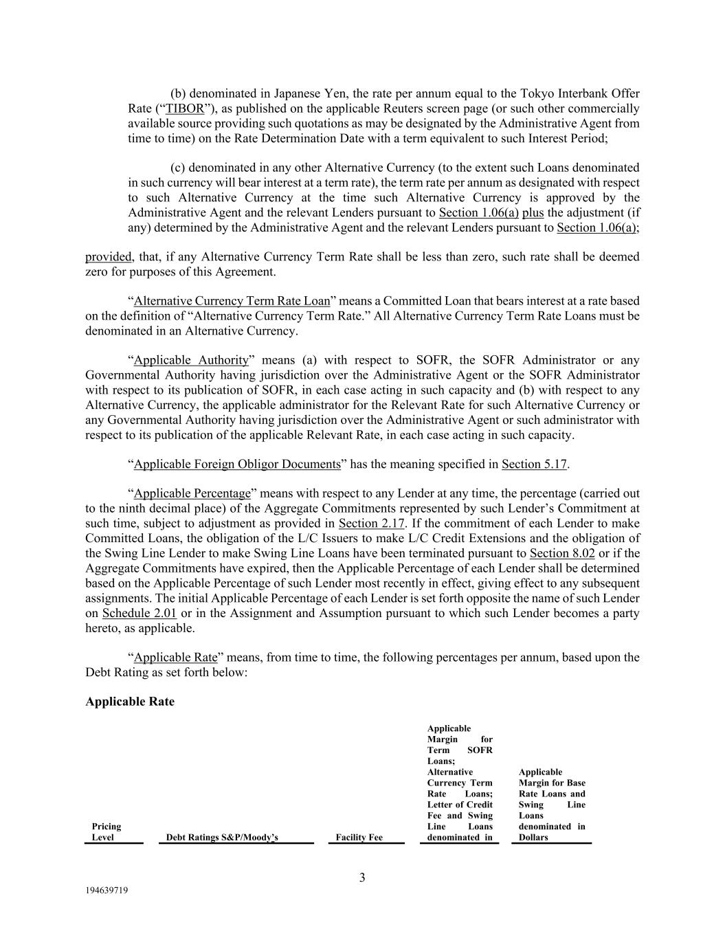 3 194639719 (b) denominated in Japanese Yen, the rate per annum equal to the Tokyo Interbank Offer Rate (“TIBOR”), as published on the applicable Reuters screen page (or such other commercially available source providing such quotations as may be designated by the Administrative Agent from time to time) on the Rate Determination Date with a term equivalent to such Interest Period; (c) denominated in any other Alternative Currency (to the extent such Loans denominated in such currency will bear interest at a term rate), the term rate per annum as designated with respect to such Alternative Currency at the time such Alternative Currency is approved by the Administrative Agent and the relevant Lenders pursuant to Section 1.06(a) plus the adjustment (if any) determined by the Administrative Agent and the relevant Lenders pursuant to Section 1.06(a); provided, that, if any Alternative Currency Term Rate shall be less than zero, such rate shall be deemed zero for purposes of this Agreement. “Alternative Currency Term Rate Loan” means a Committed Loan that bears interest at a rate based on the definition of “Alternative Currency Term Rate.” All Alternative Currency Term Rate Loans must be denominated in an Alternative Currency. “Applicable Authority” means (a) with respect to SOFR, the SOFR Administrator or any Governmental Authority having jurisdiction over the Administrative Agent or the SOFR Administrator with respect to its publication of SOFR, in each case acting in such capacity and (b) with respect to any Alternative Currency, the applicable administrator for the Relevant Rate for such Alternative Currency or any Governmental Authority having jurisdiction over the Administrative Agent or such administrator with respect to its publication of the applicable Relevant Rate, in each case acting in such capacity. “Applicable Foreign Obligor Documents” has the meaning specified in Section 5.17. “Applicable Percentage” means with respect to any Lender at any time, the percentage (carried out to the ninth decimal place) of the Aggregate Commitments represented by such Lender’s Commitment at such time, subject to adjustment as provided in Section 2.17. If the commitment of each Lender to make Committed Loans, the obligation of the L/C Issuers to make L/C Credit Extensions and the obligation of the Swing Line Lender to make Swing Line Loans have been terminated pursuant to Section 8.02 or if the Aggregate Commitments have expired, then the Applicable Percentage of each Lender shall be determined based on the Applicable Percentage of such Lender most recently in effect, giving effect to any subsequent assignments. The initial Applicable Percentage of each Lender is set forth opposite the name of such Lender on Schedule 2.01 or in the Assignment and Assumption pursuant to which such Lender becomes a party hereto, as applicable. “Applicable Rate” means, from time to time, the following percentages per annum, based upon the Debt Rating as set forth below: Applicable Rate Pricing Level Debt Ratings S&P/Moody’s Facility Fee Applicable Margin for Term SOFR Loans; Alternative Currency Term Rate Loans; Letter of Credit Fee and Swing Line Loans denominated in Applicable Margin for Base Rate Loans and Swing Line Loans denominated in Dollars