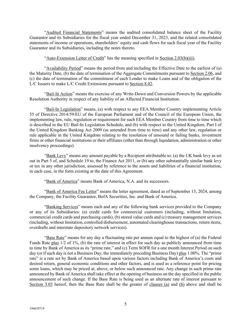 5 194639719 “Audited Financial Statements” means the audited consolidated balance sheet of the Facility Guarantor and its Subsidiaries for the fiscal year ended December 31, 2023, and the related consolidated statements of income or operations, shareholders’ equity and cash flows for such fiscal year of the Facility Guarantor and its Subsidiaries, including the notes thereto. “Auto-Extension Letter of Credit” has the meaning specified in Section 2.03(b)(iii). “Availability Period” means the period from and including the Effective Date to the earliest of (a) the Maturity Date, (b) the date of termination of the Aggregate Commitments pursuant to Section 2.06, and (c) the date of termination of the commitment of each Lender to make Loans and of the obligation of the L/C Issuers to make L/C Credit Extensions pursuant to Section 8.02. “Bail-In Action” means the exercise of any Write-Down and Conversion Powers by the applicable Resolution Authority in respect of any liability of an Affected Financial Institution. “Bail-In Legislation” means, (a) with respect to any EEA Member Country implementing Article 55 of Directive 2014/59/EU of the European Parliament and of the Council of the European Union, the implementing law, rule, regulation or requirement for such EEA Member Country from time to time which is described in the EU Bail-In Legislation Schedule, and (b) with respect to the United Kingdom, Part I of the United Kingdom Banking Act 2009 (as amended from time to time) and any other law, regulation or rule applicable in the United Kingdom relating to the resolution of unsound or failing banks, investment firms or other financial institutions or their affiliates (other than through liquidation, administration or other insolvency proceedings). “Bank Levy” means any amount payable by a Recipient attributable to: (a) the UK bank levy as set out in Part 5 of, and Schedule 19 to, the Finance Act 2011, or (b) any other substantially similar bank levy or tax in any other jurisdiction, assessed by reference to the assets and liabilities of a financial institution, in each case, in the form existing at the date of this Agreement. “Bank of America” means Bank of America, N.A. and its successors. “Bank of America Fee Letter” means the letter agreement, dated as of September 13, 2024, among the Company, the Facility Guarantor, BofA Securities, Inc. and Bank of America. “Banking Services” means each and any of the following bank services provided to the Company or any of its Subsidiaries: (a) credit cards for commercial customers (including, without limitation, commercial credit cards and purchasing cards), (b) stored value cards and (c) treasury management services (including, without limitation, controlled disbursement, automated clearinghouse transactions, return items, overdrafts and interstate depository network services). “Base Rate” means for any day a fluctuating rate per annum equal to the highest of (a) the Federal Funds Rate plus 1/2 of 1%, (b) the rate of interest in effect for such day as publicly announced from time to time by Bank of America as its “prime rate,” and (c) Term SOFR for a one month Interest Period on such day (or if such day is not a Business Day, the immediately preceding Business Day) plus 1.00%. The “prime rate” is a rate set by Bank of America based upon various factors including Bank of America’s costs and desired return, general economic conditions and other factors, and is used as a reference point for pricing some loans, which may be priced at, above, or below such announced rate. Any change in such prime rate announced by Bank of America shall take effect at the opening of business on the day specified in the public announcement of such change. If the Base Rate is being used as an alternate rate of interest pursuant to Section 3.03 hereof, then the Base Rate shall be the greater of clauses (a) and (b) above and shall be