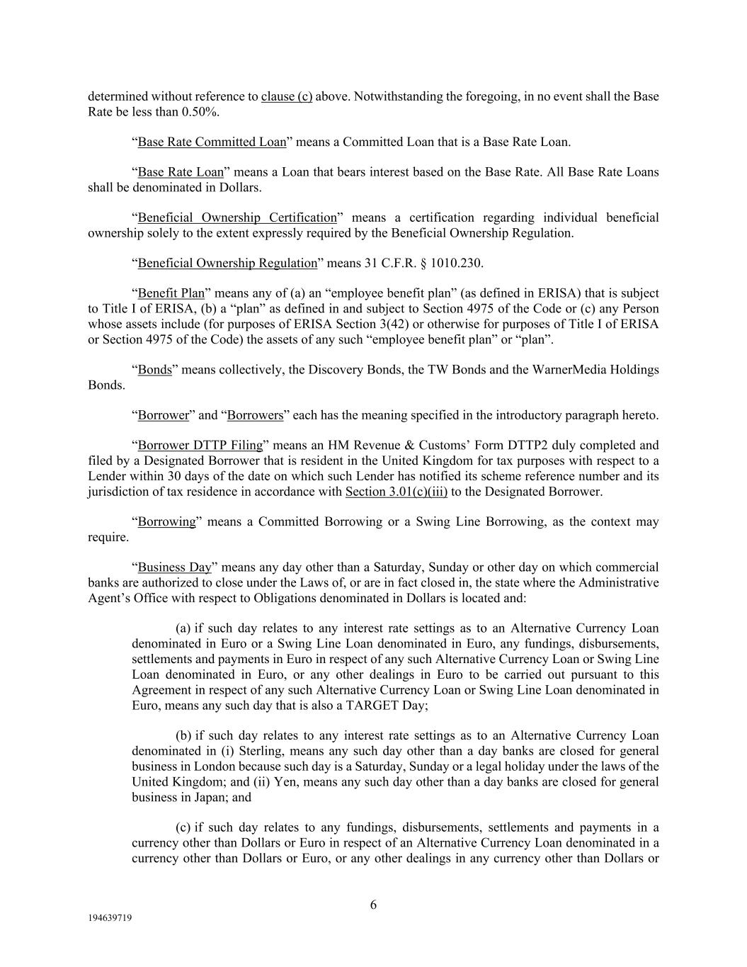 6 194639719 determined without reference to clause (c) above. Notwithstanding the foregoing, in no event shall the Base Rate be less than 0.50%. “Base Rate Committed Loan” means a Committed Loan that is a Base Rate Loan. “Base Rate Loan” means a Loan that bears interest based on the Base Rate. All Base Rate Loans shall be denominated in Dollars. “Beneficial Ownership Certification” means a certification regarding individual beneficial ownership solely to the extent expressly required by the Beneficial Ownership Regulation. “Beneficial Ownership Regulation” means 31 C.F.R. § 1010.230. “Benefit Plan” means any of (a) an “employee benefit plan” (as defined in ERISA) that is subject to Title I of ERISA, (b) a “plan” as defined in and subject to Section 4975 of the Code or (c) any Person whose assets include (for purposes of ERISA Section 3(42) or otherwise for purposes of Title I of ERISA or Section 4975 of the Code) the assets of any such “employee benefit plan” or “plan”. “Bonds” means collectively, the Discovery Bonds, the TW Bonds and the WarnerMedia Holdings Bonds. “Borrower” and “Borrowers” each has the meaning specified in the introductory paragraph hereto. “Borrower DTTP Filing” means an HM Revenue & Customs’ Form DTTP2 duly completed and filed by a Designated Borrower that is resident in the United Kingdom for tax purposes with respect to a Lender within 30 days of the date on which such Lender has notified its scheme reference number and its jurisdiction of tax residence in accordance with Section 3.01(c)(iii) to the Designated Borrower. “Borrowing” means a Committed Borrowing or a Swing Line Borrowing, as the context may require. “Business Day” means any day other than a Saturday, Sunday or other day on which commercial banks are authorized to close under the Laws of, or are in fact closed in, the state where the Administrative Agent’s Office with respect to Obligations denominated in Dollars is located and: (a) if such day relates to any interest rate settings as to an Alternative Currency Loan denominated in Euro or a Swing Line Loan denominated in Euro, any fundings, disbursements, settlements and payments in Euro in respect of any such Alternative Currency Loan or Swing Line Loan denominated in Euro, or any other dealings in Euro to be carried out pursuant to this Agreement in respect of any such Alternative Currency Loan or Swing Line Loan denominated in Euro, means any such day that is also a TARGET Day; (b) if such day relates to any interest rate settings as to an Alternative Currency Loan denominated in (i) Sterling, means any such day other than a day banks are closed for general business in London because such day is a Saturday, Sunday or a legal holiday under the laws of the United Kingdom; and (ii) Yen, means any such day other than a day banks are closed for general business in Japan; and (c) if such day relates to any fundings, disbursements, settlements and payments in a currency other than Dollars or Euro in respect of an Alternative Currency Loan denominated in a currency other than Dollars or Euro, or any other dealings in any currency other than Dollars or
