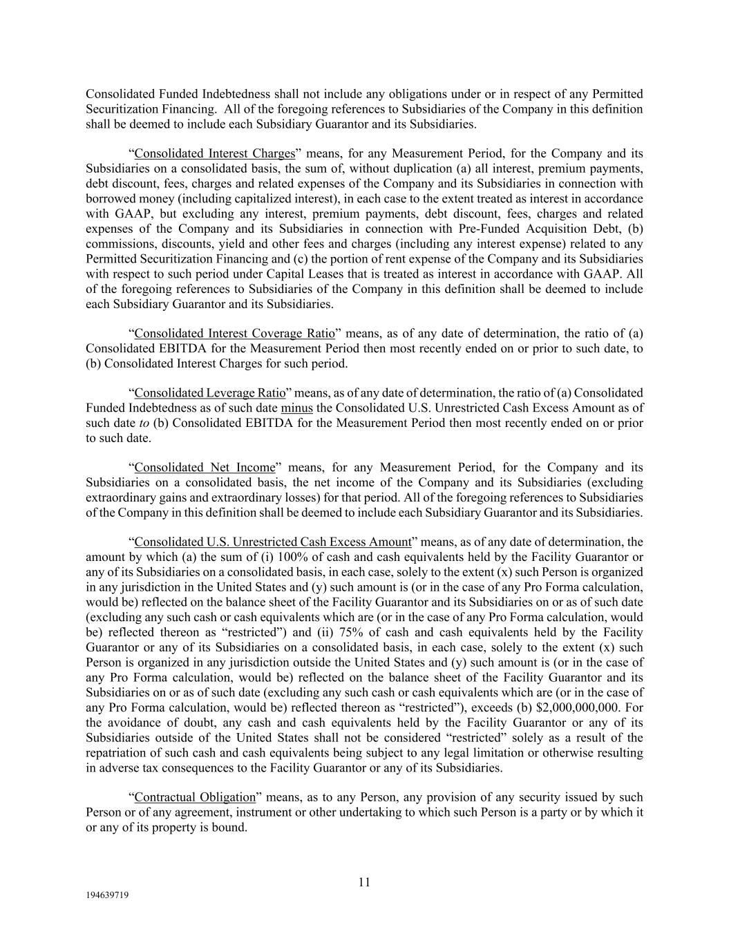 11 194639719 Consolidated Funded Indebtedness shall not include any obligations under or in respect of any Permitted Securitization Financing. All of the foregoing references to Subsidiaries of the Company in this definition shall be deemed to include each Subsidiary Guarantor and its Subsidiaries. “Consolidated Interest Charges” means, for any Measurement Period, for the Company and its Subsidiaries on a consolidated basis, the sum of, without duplication (a) all interest, premium payments, debt discount, fees, charges and related expenses of the Company and its Subsidiaries in connection with borrowed money (including capitalized interest), in each case to the extent treated as interest in accordance with GAAP, but excluding any interest, premium payments, debt discount, fees, charges and related expenses of the Company and its Subsidiaries in connection with Pre-Funded Acquisition Debt, (b) commissions, discounts, yield and other fees and charges (including any interest expense) related to any Permitted Securitization Financing and (c) the portion of rent expense of the Company and its Subsidiaries with respect to such period under Capital Leases that is treated as interest in accordance with GAAP. All of the foregoing references to Subsidiaries of the Company in this definition shall be deemed to include each Subsidiary Guarantor and its Subsidiaries. “Consolidated Interest Coverage Ratio” means, as of any date of determination, the ratio of (a) Consolidated EBITDA for the Measurement Period then most recently ended on or prior to such date, to (b) Consolidated Interest Charges for such period. “Consolidated Leverage Ratio” means, as of any date of determination, the ratio of (a) Consolidated Funded Indebtedness as of such date minus the Consolidated U.S. Unrestricted Cash Excess Amount as of such date to (b) Consolidated EBITDA for the Measurement Period then most recently ended on or prior to such date. “Consolidated Net Income” means, for any Measurement Period, for the Company and its Subsidiaries on a consolidated basis, the net income of the Company and its Subsidiaries (excluding extraordinary gains and extraordinary losses) for that period. All of the foregoing references to Subsidiaries of the Company in this definition shall be deemed to include each Subsidiary Guarantor and its Subsidiaries. “Consolidated U.S. Unrestricted Cash Excess Amount” means, as of any date of determination, the amount by which (a) the sum of (i) 100% of cash and cash equivalents held by the Facility Guarantor or any of its Subsidiaries on a consolidated basis, in each case, solely to the extent (x) such Person is organized in any jurisdiction in the United States and (y) such amount is (or in the case of any Pro Forma calculation, would be) reflected on the balance sheet of the Facility Guarantor and its Subsidiaries on or as of such date (excluding any such cash or cash equivalents which are (or in the case of any Pro Forma calculation, would be) reflected thereon as “restricted”) and (ii) 75% of cash and cash equivalents held by the Facility Guarantor or any of its Subsidiaries on a consolidated basis, in each case, solely to the extent (x) such Person is organized in any jurisdiction outside the United States and (y) such amount is (or in the case of any Pro Forma calculation, would be) reflected on the balance sheet of the Facility Guarantor and its Subsidiaries on or as of such date (excluding any such cash or cash equivalents which are (or in the case of any Pro Forma calculation, would be) reflected thereon as “restricted”), exceeds (b) $2,000,000,000. For the avoidance of doubt, any cash and cash equivalents held by the Facility Guarantor or any of its Subsidiaries outside of the United States shall not be considered “restricted” solely as a result of the repatriation of such cash and cash equivalents being subject to any legal limitation or otherwise resulting in adverse tax consequences to the Facility Guarantor or any of its Subsidiaries. “Contractual Obligation” means, as to any Person, any provision of any security issued by such Person or of any agreement, instrument or other undertaking to which such Person is a party or by which it or any of its property is bound.