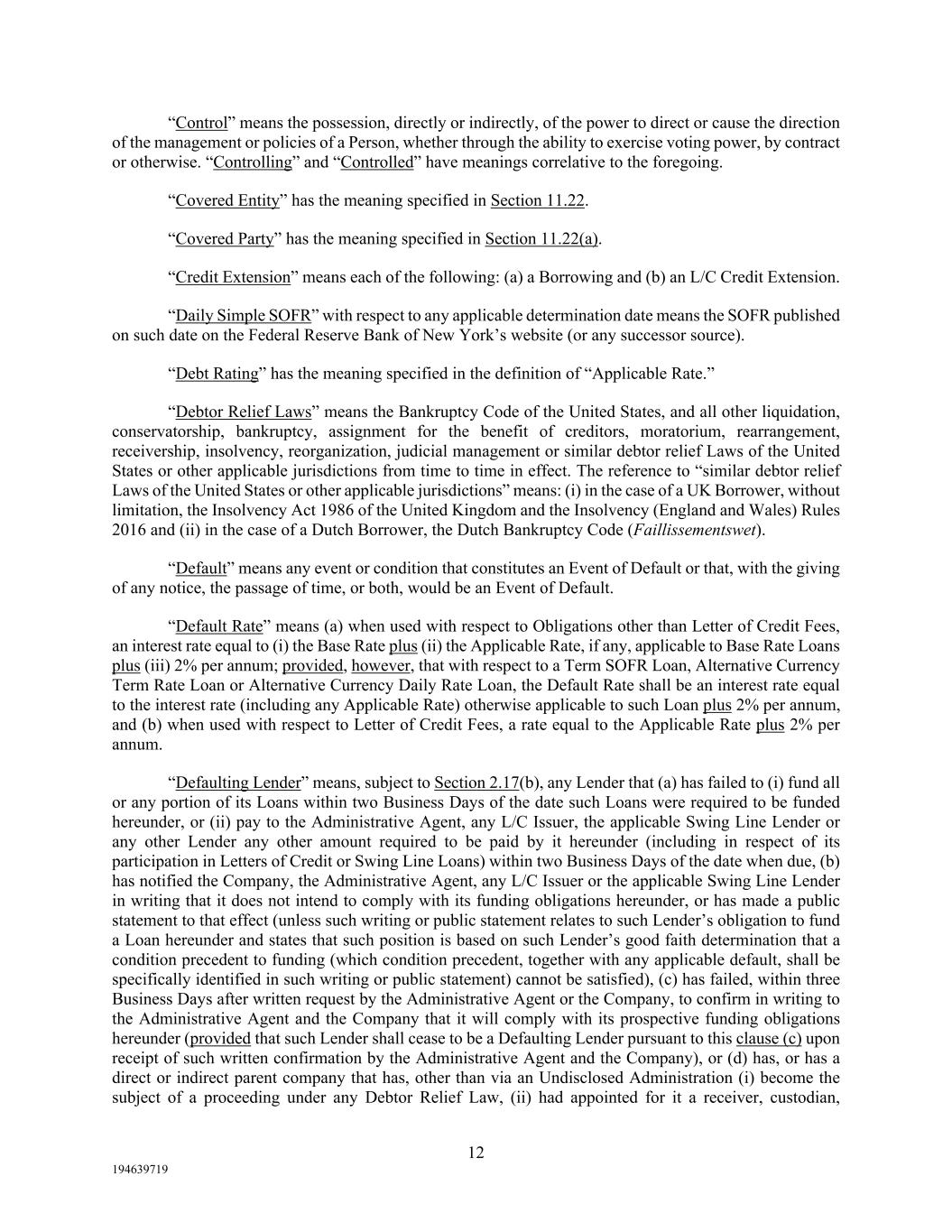 12 194639719 “Control” means the possession, directly or indirectly, of the power to direct or cause the direction of the management or policies of a Person, whether through the ability to exercise voting power, by contract or otherwise. “Controlling” and “Controlled” have meanings correlative to the foregoing. “Covered Entity” has the meaning specified in Section 11.22. “Covered Party” has the meaning specified in Section 11.22(a). “Credit Extension” means each of the following: (a) a Borrowing and (b) an L/C Credit Extension. “Daily Simple SOFR” with respect to any applicable determination date means the SOFR published on such date on the Federal Reserve Bank of New York’s website (or any successor source). “Debt Rating” has the meaning specified in the definition of “Applicable Rate.” “Debtor Relief Laws” means the Bankruptcy Code of the United States, and all other liquidation, conservatorship, bankruptcy, assignment for the benefit of creditors, moratorium, rearrangement, receivership, insolvency, reorganization, judicial management or similar debtor relief Laws of the United States or other applicable jurisdictions from time to time in effect. The reference to “similar debtor relief Laws of the United States or other applicable jurisdictions” means: (i) in the case of a UK Borrower, without limitation, the Insolvency Act 1986 of the United Kingdom and the Insolvency (England and Wales) Rules 2016 and (ii) in the case of a Dutch Borrower, the Dutch Bankruptcy Code (Faillissementswet). “Default” means any event or condition that constitutes an Event of Default or that, with the giving of any notice, the passage of time, or both, would be an Event of Default. “Default Rate” means (a) when used with respect to Obligations other than Letter of Credit Fees, an interest rate equal to (i) the Base Rate plus (ii) the Applicable Rate, if any, applicable to Base Rate Loans plus (iii) 2% per annum; provided, however, that with respect to a Term SOFR Loan, Alternative Currency Term Rate Loan or Alternative Currency Daily Rate Loan, the Default Rate shall be an interest rate equal to the interest rate (including any Applicable Rate) otherwise applicable to such Loan plus 2% per annum, and (b) when used with respect to Letter of Credit Fees, a rate equal to the Applicable Rate plus 2% per annum. “Defaulting Lender” means, subject to Section 2.17(b), any Lender that (a) has failed to (i) fund all or any portion of its Loans within two Business Days of the date such Loans were required to be funded hereunder, or (ii) pay to the Administrative Agent, any L/C Issuer, the applicable Swing Line Lender or any other Lender any other amount required to be paid by it hereunder (including in respect of its participation in Letters of Credit or Swing Line Loans) within two Business Days of the date when due, (b) has notified the Company, the Administrative Agent, any L/C Issuer or the applicable Swing Line Lender in writing that it does not intend to comply with its funding obligations hereunder, or has made a public statement to that effect (unless such writing or public statement relates to such Lender’s obligation to fund a Loan hereunder and states that such position is based on such Lender’s good faith determination that a condition precedent to funding (which condition precedent, together with any applicable default, shall be specifically identified in such writing or public statement) cannot be satisfied), (c) has failed, within three Business Days after written request by the Administrative Agent or the Company, to confirm in writing to the Administrative Agent and the Company that it will comply with its prospective funding obligations hereunder (provided that such Lender shall cease to be a Defaulting Lender pursuant to this clause (c) upon receipt of such written confirmation by the Administrative Agent and the Company), or (d) has, or has a direct or indirect parent company that has, other than via an Undisclosed Administration (i) become the subject of a proceeding under any Debtor Relief Law, (ii) had appointed for it a receiver, custodian,