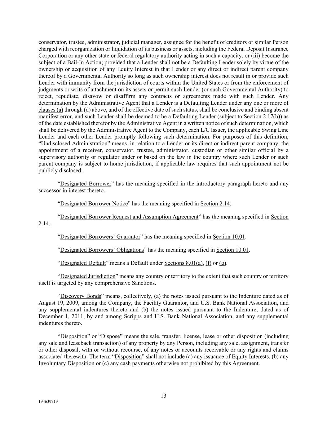 13 194639719 conservator, trustee, administrator, judicial manager, assignee for the benefit of creditors or similar Person charged with reorganization or liquidation of its business or assets, including the Federal Deposit Insurance Corporation or any other state or federal regulatory authority acting in such a capacity, or (iii) become the subject of a Bail-In Action; provided that a Lender shall not be a Defaulting Lender solely by virtue of the ownership or acquisition of any Equity Interest in that Lender or any direct or indirect parent company thereof by a Governmental Authority so long as such ownership interest does not result in or provide such Lender with immunity from the jurisdiction of courts within the United States or from the enforcement of judgments or writs of attachment on its assets or permit such Lender (or such Governmental Authority) to reject, repudiate, disavow or disaffirm any contracts or agreements made with such Lender. Any determination by the Administrative Agent that a Lender is a Defaulting Lender under any one or more of clauses (a) through (d) above, and of the effective date of such status, shall be conclusive and binding absent manifest error, and such Lender shall be deemed to be a Defaulting Lender (subject to Section 2.17(b)) as of the date established therefor by the Administrative Agent in a written notice of such determination, which shall be delivered by the Administrative Agent to the Company, each L/C Issuer, the applicable Swing Line Lender and each other Lender promptly following such determination. For purposes of this definition, “Undisclosed Administration” means, in relation to a Lender or its direct or indirect parent company, the appointment of a receiver, conservator, trustee, administrator, custodian or other similar official by a supervisory authority or regulator under or based on the law in the country where such Lender or such parent company is subject to home jurisdiction, if applicable law requires that such appointment not be publicly disclosed. “Designated Borrower” has the meaning specified in the introductory paragraph hereto and any successor in interest thereto. “Designated Borrower Notice” has the meaning specified in Section 2.14. “Designated Borrower Request and Assumption Agreement” has the meaning specified in Section 2.14. “Designated Borrowers’ Guarantor” has the meaning specified in Section 10.01. “Designated Borrowers’ Obligations” has the meaning specified in Section 10.01. “Designated Default” means a Default under Sections 8.01(a), (f) or (g). “Designated Jurisdiction” means any country or territory to the extent that such country or territory itself is targeted by any comprehensive Sanctions. “Discovery Bonds” means, collectively, (a) the notes issued pursuant to the Indenture dated as of August 19, 2009, among the Company, the Facility Guarantor, and U.S. Bank National Association, and any supplemental indentures thereto and (b) the notes issued pursuant to the Indenture, dated as of December 1, 2011, by and among Scripps and U.S. Bank National Association, and any supplemental indentures thereto. “Disposition” or “Dispose” means the sale, transfer, license, lease or other disposition (including any sale and leaseback transaction) of any property by any Person, including any sale, assignment, transfer or other disposal, with or without recourse, of any notes or accounts receivable or any rights and claims associated therewith. The term “Disposition” shall not include (a) any issuance of Equity Interests, (b) any Involuntary Disposition or (c) any cash payments otherwise not prohibited by this Agreement.