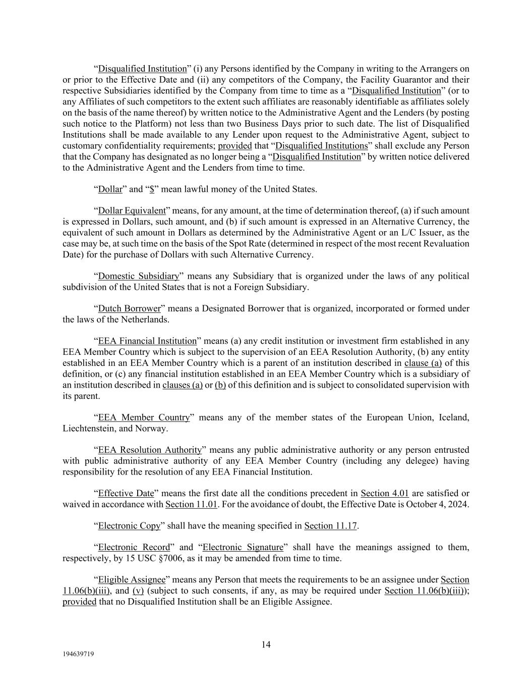 14 194639719 “Disqualified Institution” (i) any Persons identified by the Company in writing to the Arrangers on or prior to the Effective Date and (ii) any competitors of the Company, the Facility Guarantor and their respective Subsidiaries identified by the Company from time to time as a “Disqualified Institution” (or to any Affiliates of such competitors to the extent such affiliates are reasonably identifiable as affiliates solely on the basis of the name thereof) by written notice to the Administrative Agent and the Lenders (by posting such notice to the Platform) not less than two Business Days prior to such date. The list of Disqualified Institutions shall be made available to any Lender upon request to the Administrative Agent, subject to customary confidentiality requirements; provided that “Disqualified Institutions” shall exclude any Person that the Company has designated as no longer being a “Disqualified Institution” by written notice delivered to the Administrative Agent and the Lenders from time to time. “Dollar” and “$” mean lawful money of the United States. “Dollar Equivalent” means, for any amount, at the time of determination thereof, (a) if such amount is expressed in Dollars, such amount, and (b) if such amount is expressed in an Alternative Currency, the equivalent of such amount in Dollars as determined by the Administrative Agent or an L/C Issuer, as the case may be, at such time on the basis of the Spot Rate (determined in respect of the most recent Revaluation Date) for the purchase of Dollars with such Alternative Currency. “Domestic Subsidiary” means any Subsidiary that is organized under the laws of any political subdivision of the United States that is not a Foreign Subsidiary. “Dutch Borrower” means a Designated Borrower that is organized, incorporated or formed under the laws of the Netherlands. “EEA Financial Institution” means (a) any credit institution or investment firm established in any EEA Member Country which is subject to the supervision of an EEA Resolution Authority, (b) any entity established in an EEA Member Country which is a parent of an institution described in clause (a) of this definition, or (c) any financial institution established in an EEA Member Country which is a subsidiary of an institution described in clauses (a) or (b) of this definition and is subject to consolidated supervision with its parent. “EEA Member Country” means any of the member states of the European Union, Iceland, Liechtenstein, and Norway. “EEA Resolution Authority” means any public administrative authority or any person entrusted with public administrative authority of any EEA Member Country (including any delegee) having responsibility for the resolution of any EEA Financial Institution. “Effective Date” means the first date all the conditions precedent in Section 4.01 are satisfied or waived in accordance with Section 11.01. For the avoidance of doubt, the Effective Date is October 4, 2024. “Electronic Copy” shall have the meaning specified in Section 11.17. “Electronic Record” and “Electronic Signature” shall have the meanings assigned to them, respectively, by 15 USC §7006, as it may be amended from time to time. “Eligible Assignee” means any Person that meets the requirements to be an assignee under Section 11.06(b)(iii), and (v) (subject to such consents, if any, as may be required under Section 11.06(b)(iii)); provided that no Disqualified Institution shall be an Eligible Assignee.