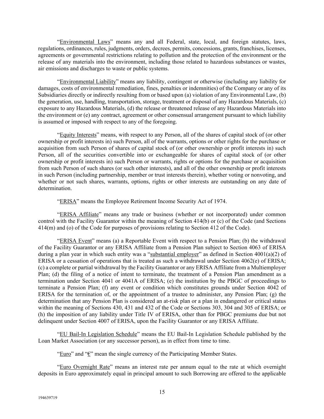 15 194639719 “Environmental Laws” means any and all Federal, state, local, and foreign statutes, laws, regulations, ordinances, rules, judgments, orders, decrees, permits, concessions, grants, franchises, licenses, agreements or governmental restrictions relating to pollution and the protection of the environment or the release of any materials into the environment, including those related to hazardous substances or wastes, air emissions and discharges to waste or public systems. “Environmental Liability” means any liability, contingent or otherwise (including any liability for damages, costs of environmental remediation, fines, penalties or indemnities) of the Company or any of its Subsidiaries directly or indirectly resulting from or based upon (a) violation of any Environmental Law, (b) the generation, use, handling, transportation, storage, treatment or disposal of any Hazardous Materials, (c) exposure to any Hazardous Materials, (d) the release or threatened release of any Hazardous Materials into the environment or (e) any contract, agreement or other consensual arrangement pursuant to which liability is assumed or imposed with respect to any of the foregoing. “Equity Interests” means, with respect to any Person, all of the shares of capital stock of (or other ownership or profit interests in) such Person, all of the warrants, options or other rights for the purchase or acquisition from such Person of shares of capital stock of (or other ownership or profit interests in) such Person, all of the securities convertible into or exchangeable for shares of capital stock of (or other ownership or profit interests in) such Person or warrants, rights or options for the purchase or acquisition from such Person of such shares (or such other interests), and all of the other ownership or profit interests in such Person (including partnership, member or trust interests therein), whether voting or nonvoting, and whether or not such shares, warrants, options, rights or other interests are outstanding on any date of determination. “ERISA” means the Employee Retirement Income Security Act of 1974. “ERISA Affiliate” means any trade or business (whether or not incorporated) under common control with the Facility Guarantor within the meaning of Section 414(b) or (c) of the Code (and Sections 414(m) and (o) of the Code for purposes of provisions relating to Section 412 of the Code). “ERISA Event” means (a) a Reportable Event with respect to a Pension Plan; (b) the withdrawal of the Facility Guarantor or any ERISA Affiliate from a Pension Plan subject to Section 4063 of ERISA during a plan year in which such entity was a “substantial employer” as defined in Section 4001(a)(2) of ERISA or a cessation of operations that is treated as such a withdrawal under Section 4062(e) of ERISA; (c) a complete or partial withdrawal by the Facility Guarantor or any ERISA Affiliate from a Multiemployer Plan; (d) the filing of a notice of intent to terminate, the treatment of a Pension Plan amendment as a termination under Section 4041 or 4041A of ERISA; (e) the institution by the PBGC of proceedings to terminate a Pension Plan; (f) any event or condition which constitutes grounds under Section 4042 of ERISA for the termination of, or the appointment of a trustee to administer, any Pension Plan; (g) the determination that any Pension Plan is considered an at-risk plan or a plan in endangered or critical status within the meaning of Sections 430, 431 and 432 of the Code or Sections 303, 304 and 305 of ERISA; or (h) the imposition of any liability under Title IV of ERISA, other than for PBGC premiums due but not delinquent under Section 4007 of ERISA, upon the Facility Guarantor or any ERISA Affiliate. “EU Bail-In Legislation Schedule” means the EU Bail-In Legislation Schedule published by the Loan Market Association (or any successor person), as in effect from time to time. “Euro” and “€” mean the single currency of the Participating Member States. “Euro Overnight Rate” means an interest rate per annum equal to the rate at which overnight deposits in Euro approximately equal in principal amount to such Borrowing are offered to the applicable