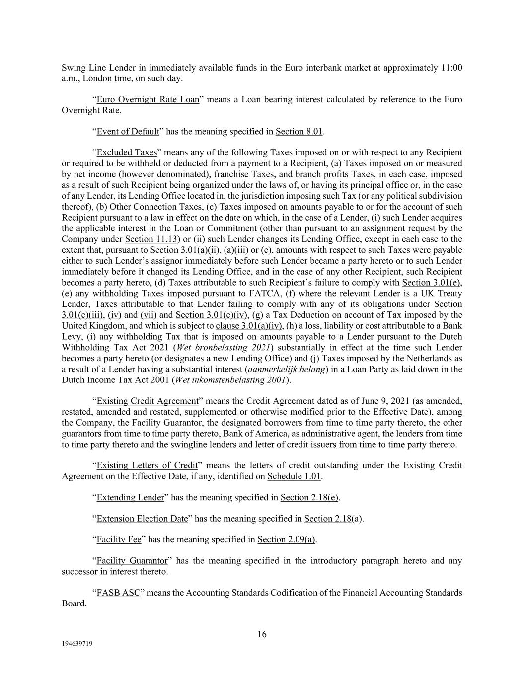 16 194639719 Swing Line Lender in immediately available funds in the Euro interbank market at approximately 11:00 a.m., London time, on such day. “Euro Overnight Rate Loan” means a Loan bearing interest calculated by reference to the Euro Overnight Rate. “Event of Default” has the meaning specified in Section 8.01. “Excluded Taxes” means any of the following Taxes imposed on or with respect to any Recipient or required to be withheld or deducted from a payment to a Recipient, (a) Taxes imposed on or measured by net income (however denominated), franchise Taxes, and branch profits Taxes, in each case, imposed as a result of such Recipient being organized under the laws of, or having its principal office or, in the case of any Lender, its Lending Office located in, the jurisdiction imposing such Tax (or any political subdivision thereof), (b) Other Connection Taxes, (c) Taxes imposed on amounts payable to or for the account of such Recipient pursuant to a law in effect on the date on which, in the case of a Lender, (i) such Lender acquires the applicable interest in the Loan or Commitment (other than pursuant to an assignment request by the Company under Section 11.13) or (ii) such Lender changes its Lending Office, except in each case to the extent that, pursuant to Section 3.01(a)(ii), (a)(iii) or (c), amounts with respect to such Taxes were payable either to such Lender’s assignor immediately before such Lender became a party hereto or to such Lender immediately before it changed its Lending Office, and in the case of any other Recipient, such Recipient becomes a party hereto, (d) Taxes attributable to such Recipient’s failure to comply with Section 3.01(e), (e) any withholding Taxes imposed pursuant to FATCA, (f) where the relevant Lender is a UK Treaty Lender, Taxes attributable to that Lender failing to comply with any of its obligations under Section 3.01(c)(iii), (iv) and (vii) and Section 3.01(e)(iv), (g) a Tax Deduction on account of Tax imposed by the United Kingdom, and which is subject to clause 3.01(a)(iv), (h) a loss, liability or cost attributable to a Bank Levy, (i) any withholding Tax that is imposed on amounts payable to a Lender pursuant to the Dutch Withholding Tax Act 2021 (Wet bronbelasting 2021) substantially in effect at the time such Lender becomes a party hereto (or designates a new Lending Office) and (j) Taxes imposed by the Netherlands as a result of a Lender having a substantial interest (aanmerkelijk belang) in a Loan Party as laid down in the Dutch Income Tax Act 2001 (Wet inkomstenbelasting 2001). “Existing Credit Agreement” means the Credit Agreement dated as of June 9, 2021 (as amended, restated, amended and restated, supplemented or otherwise modified prior to the Effective Date), among the Company, the Facility Guarantor, the designated borrowers from time to time party thereto, the other guarantors from time to time party thereto, Bank of America, as administrative agent, the lenders from time to time party thereto and the swingline lenders and letter of credit issuers from time to time party thereto. “Existing Letters of Credit” means the letters of credit outstanding under the Existing Credit Agreement on the Effective Date, if any, identified on Schedule 1.01. “Extending Lender” has the meaning specified in Section 2.18(e). “Extension Election Date” has the meaning specified in Section 2.18(a). “Facility Fee” has the meaning specified in Section 2.09(a). “Facility Guarantor” has the meaning specified in the introductory paragraph hereto and any successor in interest thereto. “FASB ASC” means the Accounting Standards Codification of the Financial Accounting Standards Board.