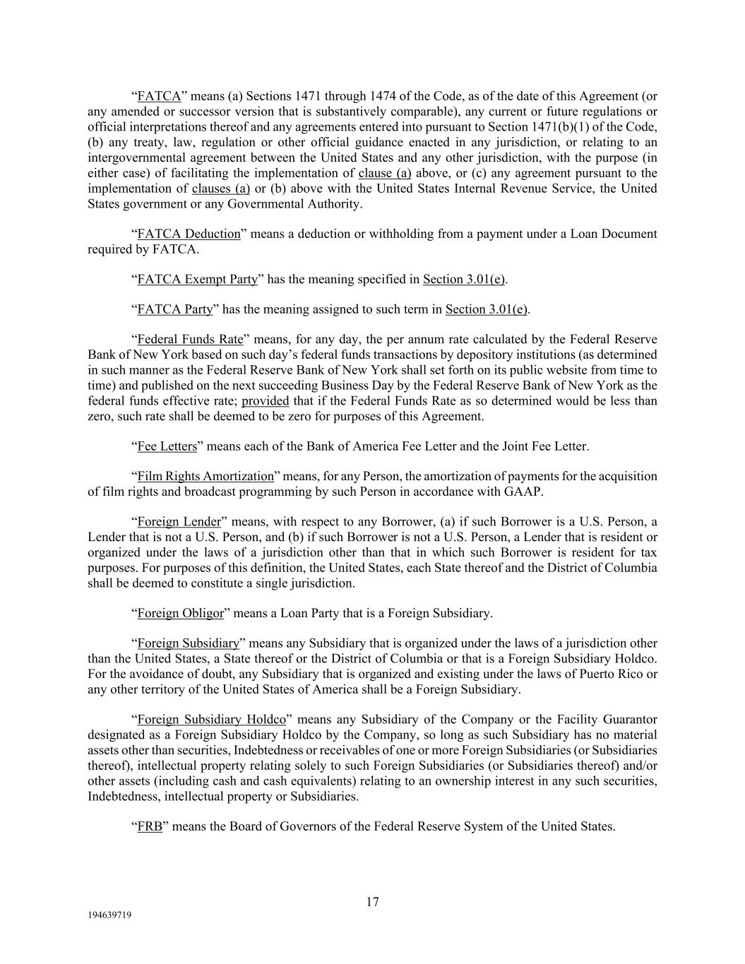 17 194639719 “FATCA” means (a) Sections 1471 through 1474 of the Code, as of the date of this Agreement (or any amended or successor version that is substantively comparable), any current or future regulations or official interpretations thereof and any agreements entered into pursuant to Section 1471(b)(1) of the Code, (b) any treaty, law, regulation or other official guidance enacted in any jurisdiction, or relating to an intergovernmental agreement between the United States and any other jurisdiction, with the purpose (in either case) of facilitating the implementation of clause (a) above, or (c) any agreement pursuant to the implementation of clauses (a) or (b) above with the United States Internal Revenue Service, the United States government or any Governmental Authority. “FATCA Deduction” means a deduction or withholding from a payment under a Loan Document required by FATCA. “FATCA Exempt Party” has the meaning specified in Section 3.01(e). “FATCA Party” has the meaning assigned to such term in Section 3.01(e). “Federal Funds Rate” means, for any day, the per annum rate calculated by the Federal Reserve Bank of New York based on such day’s federal funds transactions by depository institutions (as determined in such manner as the Federal Reserve Bank of New York shall set forth on its public website from time to time) and published on the next succeeding Business Day by the Federal Reserve Bank of New York as the federal funds effective rate; provided that if the Federal Funds Rate as so determined would be less than zero, such rate shall be deemed to be zero for purposes of this Agreement. “Fee Letters” means each of the Bank of America Fee Letter and the Joint Fee Letter. “Film Rights Amortization” means, for any Person, the amortization of payments for the acquisition of film rights and broadcast programming by such Person in accordance with GAAP. “Foreign Lender” means, with respect to any Borrower, (a) if such Borrower is a U.S. Person, a Lender that is not a U.S. Person, and (b) if such Borrower is not a U.S. Person, a Lender that is resident or organized under the laws of a jurisdiction other than that in which such Borrower is resident for tax purposes. For purposes of this definition, the United States, each State thereof and the District of Columbia shall be deemed to constitute a single jurisdiction. “Foreign Obligor” means a Loan Party that is a Foreign Subsidiary. “Foreign Subsidiary” means any Subsidiary that is organized under the laws of a jurisdiction other than the United States, a State thereof or the District of Columbia or that is a Foreign Subsidiary Holdco. For the avoidance of doubt, any Subsidiary that is organized and existing under the laws of Puerto Rico or any other territory of the United States of America shall be a Foreign Subsidiary. “Foreign Subsidiary Holdco” means any Subsidiary of the Company or the Facility Guarantor designated as a Foreign Subsidiary Holdco by the Company, so long as such Subsidiary has no material assets other than securities, Indebtedness or receivables of one or more Foreign Subsidiaries (or Subsidiaries thereof), intellectual property relating solely to such Foreign Subsidiaries (or Subsidiaries thereof) and/or other assets (including cash and cash equivalents) relating to an ownership interest in any such securities, Indebtedness, intellectual property or Subsidiaries. “FRB” means the Board of Governors of the Federal Reserve System of the United States.