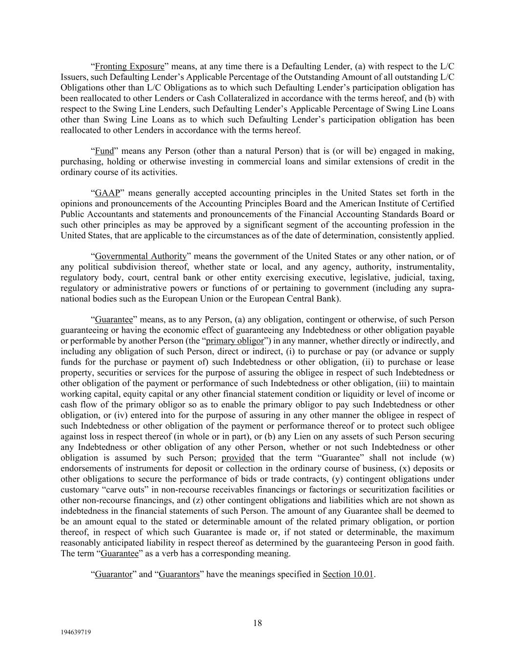 18 194639719 “Fronting Exposure” means, at any time there is a Defaulting Lender, (a) with respect to the L/C Issuers, such Defaulting Lender’s Applicable Percentage of the Outstanding Amount of all outstanding L/C Obligations other than L/C Obligations as to which such Defaulting Lender’s participation obligation has been reallocated to other Lenders or Cash Collateralized in accordance with the terms hereof, and (b) with respect to the Swing Line Lenders, such Defaulting Lender’s Applicable Percentage of Swing Line Loans other than Swing Line Loans as to which such Defaulting Lender’s participation obligation has been reallocated to other Lenders in accordance with the terms hereof. “Fund” means any Person (other than a natural Person) that is (or will be) engaged in making, purchasing, holding or otherwise investing in commercial loans and similar extensions of credit in the ordinary course of its activities. “GAAP” means generally accepted accounting principles in the United States set forth in the opinions and pronouncements of the Accounting Principles Board and the American Institute of Certified Public Accountants and statements and pronouncements of the Financial Accounting Standards Board or such other principles as may be approved by a significant segment of the accounting profession in the United States, that are applicable to the circumstances as of the date of determination, consistently applied. “Governmental Authority” means the government of the United States or any other nation, or of any political subdivision thereof, whether state or local, and any agency, authority, instrumentality, regulatory body, court, central bank or other entity exercising executive, legislative, judicial, taxing, regulatory or administrative powers or functions of or pertaining to government (including any supra- national bodies such as the European Union or the European Central Bank). “Guarantee” means, as to any Person, (a) any obligation, contingent or otherwise, of such Person guaranteeing or having the economic effect of guaranteeing any Indebtedness or other obligation payable or performable by another Person (the “primary obligor”) in any manner, whether directly or indirectly, and including any obligation of such Person, direct or indirect, (i) to purchase or pay (or advance or supply funds for the purchase or payment of) such Indebtedness or other obligation, (ii) to purchase or lease property, securities or services for the purpose of assuring the obligee in respect of such Indebtedness or other obligation of the payment or performance of such Indebtedness or other obligation, (iii) to maintain working capital, equity capital or any other financial statement condition or liquidity or level of income or cash flow of the primary obligor so as to enable the primary obligor to pay such Indebtedness or other obligation, or (iv) entered into for the purpose of assuring in any other manner the obligee in respect of such Indebtedness or other obligation of the payment or performance thereof or to protect such obligee against loss in respect thereof (in whole or in part), or (b) any Lien on any assets of such Person securing any Indebtedness or other obligation of any other Person, whether or not such Indebtedness or other obligation is assumed by such Person; provided that the term “Guarantee” shall not include (w) endorsements of instruments for deposit or collection in the ordinary course of business, (x) deposits or other obligations to secure the performance of bids or trade contracts, (y) contingent obligations under customary “carve outs” in non-recourse receivables financings or factorings or securitization facilities or other non-recourse financings, and (z) other contingent obligations and liabilities which are not shown as indebtedness in the financial statements of such Person. The amount of any Guarantee shall be deemed to be an amount equal to the stated or determinable amount of the related primary obligation, or portion thereof, in respect of which such Guarantee is made or, if not stated or determinable, the maximum reasonably anticipated liability in respect thereof as determined by the guaranteeing Person in good faith. The term “Guarantee” as a verb has a corresponding meaning. “Guarantor” and “Guarantors” have the meanings specified in Section 10.01.