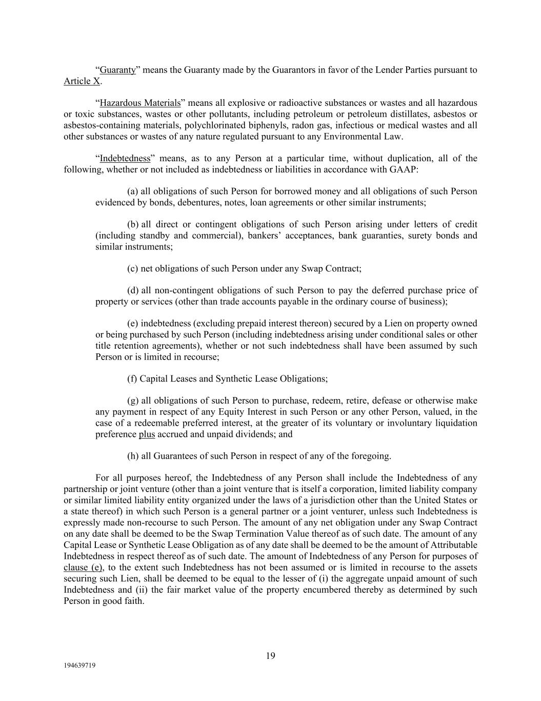 19 194639719 “Guaranty” means the Guaranty made by the Guarantors in favor of the Lender Parties pursuant to Article X. “Hazardous Materials” means all explosive or radioactive substances or wastes and all hazardous or toxic substances, wastes or other pollutants, including petroleum or petroleum distillates, asbestos or asbestos-containing materials, polychlorinated biphenyls, radon gas, infectious or medical wastes and all other substances or wastes of any nature regulated pursuant to any Environmental Law. “Indebtedness” means, as to any Person at a particular time, without duplication, all of the following, whether or not included as indebtedness or liabilities in accordance with GAAP: (a) all obligations of such Person for borrowed money and all obligations of such Person evidenced by bonds, debentures, notes, loan agreements or other similar instruments; (b) all direct or contingent obligations of such Person arising under letters of credit (including standby and commercial), bankers’ acceptances, bank guaranties, surety bonds and similar instruments; (c) net obligations of such Person under any Swap Contract; (d) all non-contingent obligations of such Person to pay the deferred purchase price of property or services (other than trade accounts payable in the ordinary course of business); (e) indebtedness (excluding prepaid interest thereon) secured by a Lien on property owned or being purchased by such Person (including indebtedness arising under conditional sales or other title retention agreements), whether or not such indebtedness shall have been assumed by such Person or is limited in recourse; (f) Capital Leases and Synthetic Lease Obligations; (g) all obligations of such Person to purchase, redeem, retire, defease or otherwise make any payment in respect of any Equity Interest in such Person or any other Person, valued, in the case of a redeemable preferred interest, at the greater of its voluntary or involuntary liquidation preference plus accrued and unpaid dividends; and (h) all Guarantees of such Person in respect of any of the foregoing. For all purposes hereof, the Indebtedness of any Person shall include the Indebtedness of any partnership or joint venture (other than a joint venture that is itself a corporation, limited liability company or similar limited liability entity organized under the laws of a jurisdiction other than the United States or a state thereof) in which such Person is a general partner or a joint venturer, unless such Indebtedness is expressly made non-recourse to such Person. The amount of any net obligation under any Swap Contract on any date shall be deemed to be the Swap Termination Value thereof as of such date. The amount of any Capital Lease or Synthetic Lease Obligation as of any date shall be deemed to be the amount of Attributable Indebtedness in respect thereof as of such date. The amount of Indebtedness of any Person for purposes of clause (e), to the extent such Indebtedness has not been assumed or is limited in recourse to the assets securing such Lien, shall be deemed to be equal to the lesser of (i) the aggregate unpaid amount of such Indebtedness and (ii) the fair market value of the property encumbered thereby as determined by such Person in good faith.