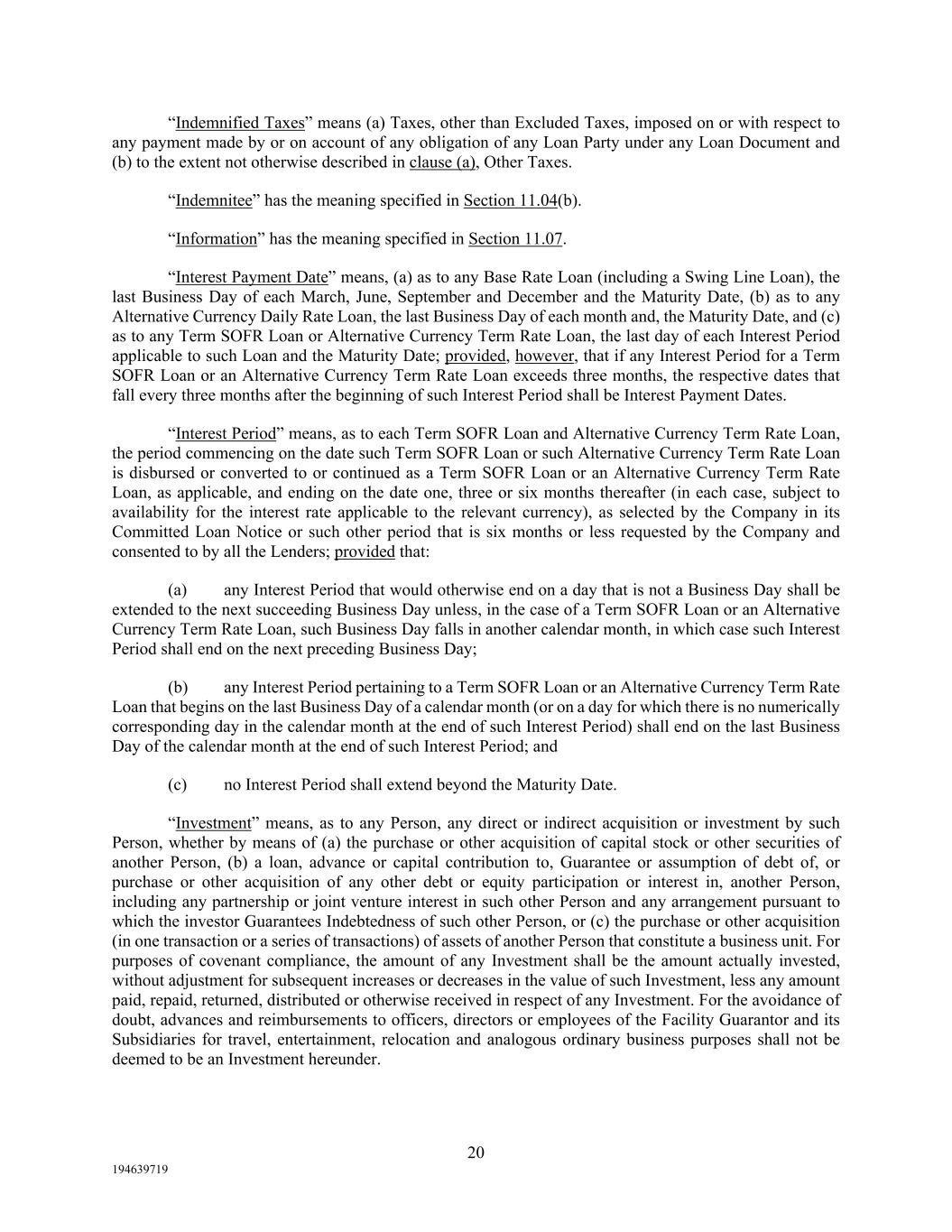 20 194639719 “Indemnified Taxes” means (a) Taxes, other than Excluded Taxes, imposed on or with respect to any payment made by or on account of any obligation of any Loan Party under any Loan Document and (b) to the extent not otherwise described in clause (a), Other Taxes. “Indemnitee” has the meaning specified in Section 11.04(b). “Information” has the meaning specified in Section 11.07. “Interest Payment Date” means, (a) as to any Base Rate Loan (including a Swing Line Loan), the last Business Day of each March, June, September and December and the Maturity Date, (b) as to any Alternative Currency Daily Rate Loan, the last Business Day of each month and, the Maturity Date, and (c) as to any Term SOFR Loan or Alternative Currency Term Rate Loan, the last day of each Interest Period applicable to such Loan and the Maturity Date; provided, however, that if any Interest Period for a Term SOFR Loan or an Alternative Currency Term Rate Loan exceeds three months, the respective dates that fall every three months after the beginning of such Interest Period shall be Interest Payment Dates. “Interest Period” means, as to each Term SOFR Loan and Alternative Currency Term Rate Loan, the period commencing on the date such Term SOFR Loan or such Alternative Currency Term Rate Loan is disbursed or converted to or continued as a Term SOFR Loan or an Alternative Currency Term Rate Loan, as applicable, and ending on the date one, three or six months thereafter (in each case, subject to availability for the interest rate applicable to the relevant currency), as selected by the Company in its Committed Loan Notice or such other period that is six months or less requested by the Company and consented to by all the Lenders; provided that: (a) any Interest Period that would otherwise end on a day that is not a Business Day shall be extended to the next succeeding Business Day unless, in the case of a Term SOFR Loan or an Alternative Currency Term Rate Loan, such Business Day falls in another calendar month, in which case such Interest Period shall end on the next preceding Business Day; (b) any Interest Period pertaining to a Term SOFR Loan or an Alternative Currency Term Rate Loan that begins on the last Business Day of a calendar month (or on a day for which there is no numerically corresponding day in the calendar month at the end of such Interest Period) shall end on the last Business Day of the calendar month at the end of such Interest Period; and (c) no Interest Period shall extend beyond the Maturity Date. “Investment” means, as to any Person, any direct or indirect acquisition or investment by such Person, whether by means of (a) the purchase or other acquisition of capital stock or other securities of another Person, (b) a loan, advance or capital contribution to, Guarantee or assumption of debt of, or purchase or other acquisition of any other debt or equity participation or interest in, another Person, including any partnership or joint venture interest in such other Person and any arrangement pursuant to which the investor Guarantees Indebtedness of such other Person, or (c) the purchase or other acquisition (in one transaction or a series of transactions) of assets of another Person that constitute a business unit. For purposes of covenant compliance, the amount of any Investment shall be the amount actually invested, without adjustment for subsequent increases or decreases in the value of such Investment, less any amount paid, repaid, returned, distributed or otherwise received in respect of any Investment. For the avoidance of doubt, advances and reimbursements to officers, directors or employees of the Facility Guarantor and its Subsidiaries for travel, entertainment, relocation and analogous ordinary business purposes shall not be deemed to be an Investment hereunder.