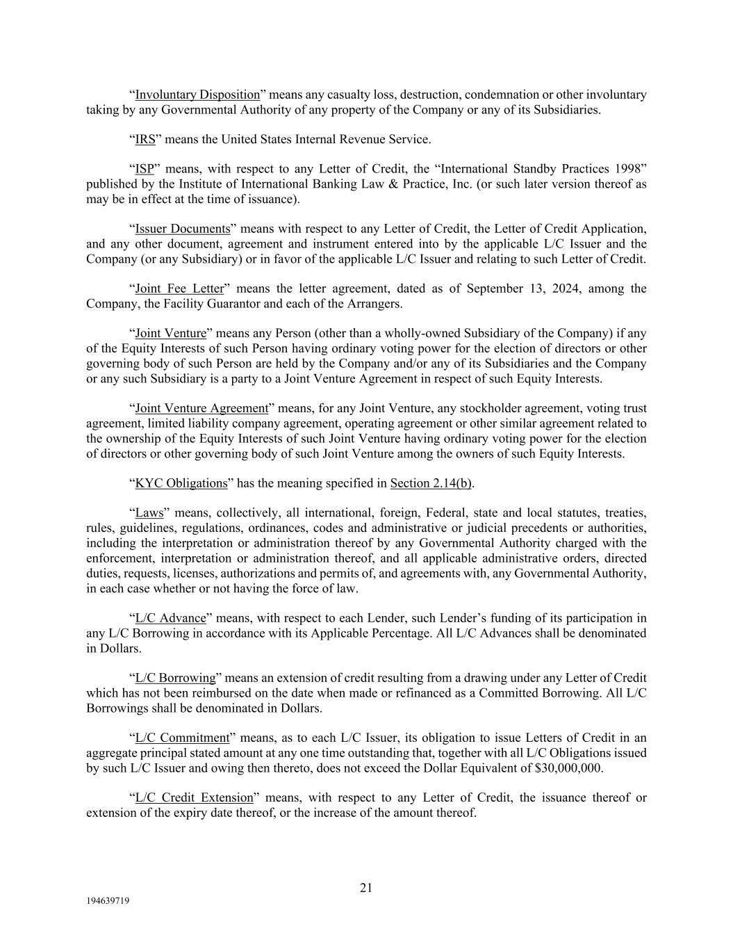21 194639719 “Involuntary Disposition” means any casualty loss, destruction, condemnation or other involuntary taking by any Governmental Authority of any property of the Company or any of its Subsidiaries. “IRS” means the United States Internal Revenue Service. “ISP” means, with respect to any Letter of Credit, the “International Standby Practices 1998” published by the Institute of International Banking Law & Practice, Inc. (or such later version thereof as may be in effect at the time of issuance). “Issuer Documents” means with respect to any Letter of Credit, the Letter of Credit Application, and any other document, agreement and instrument entered into by the applicable L/C Issuer and the Company (or any Subsidiary) or in favor of the applicable L/C Issuer and relating to such Letter of Credit. “Joint Fee Letter” means the letter agreement, dated as of September 13, 2024, among the Company, the Facility Guarantor and each of the Arrangers. “Joint Venture” means any Person (other than a wholly-owned Subsidiary of the Company) if any of the Equity Interests of such Person having ordinary voting power for the election of directors or other governing body of such Person are held by the Company and/or any of its Subsidiaries and the Company or any such Subsidiary is a party to a Joint Venture Agreement in respect of such Equity Interests. “Joint Venture Agreement” means, for any Joint Venture, any stockholder agreement, voting trust agreement, limited liability company agreement, operating agreement or other similar agreement related to the ownership of the Equity Interests of such Joint Venture having ordinary voting power for the election of directors or other governing body of such Joint Venture among the owners of such Equity Interests. “KYC Obligations” has the meaning specified in Section 2.14(b). “Laws” means, collectively, all international, foreign, Federal, state and local statutes, treaties, rules, guidelines, regulations, ordinances, codes and administrative or judicial precedents or authorities, including the interpretation or administration thereof by any Governmental Authority charged with the enforcement, interpretation or administration thereof, and all applicable administrative orders, directed duties, requests, licenses, authorizations and permits of, and agreements with, any Governmental Authority, in each case whether or not having the force of law. “L/C Advance” means, with respect to each Lender, such Lender’s funding of its participation in any L/C Borrowing in accordance with its Applicable Percentage. All L/C Advances shall be denominated in Dollars. “L/C Borrowing” means an extension of credit resulting from a drawing under any Letter of Credit which has not been reimbursed on the date when made or refinanced as a Committed Borrowing. All L/C Borrowings shall be denominated in Dollars. “L/C Commitment” means, as to each L/C Issuer, its obligation to issue Letters of Credit in an aggregate principal stated amount at any one time outstanding that, together with all L/C Obligations issued by such L/C Issuer and owing then thereto, does not exceed the Dollar Equivalent of $30,000,000. “L/C Credit Extension” means, with respect to any Letter of Credit, the issuance thereof or extension of the expiry date thereof, or the increase of the amount thereof.