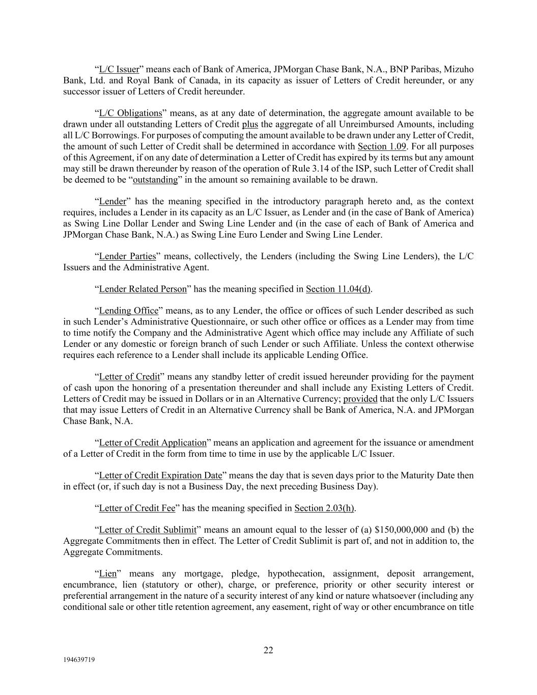 22 194639719 “L/C Issuer” means each of Bank of America, JPMorgan Chase Bank, N.A., BNP Paribas, Mizuho Bank, Ltd. and Royal Bank of Canada, in its capacity as issuer of Letters of Credit hereunder, or any successor issuer of Letters of Credit hereunder. “L/C Obligations” means, as at any date of determination, the aggregate amount available to be drawn under all outstanding Letters of Credit plus the aggregate of all Unreimbursed Amounts, including all L/C Borrowings. For purposes of computing the amount available to be drawn under any Letter of Credit, the amount of such Letter of Credit shall be determined in accordance with Section 1.09. For all purposes of this Agreement, if on any date of determination a Letter of Credit has expired by its terms but any amount may still be drawn thereunder by reason of the operation of Rule 3.14 of the ISP, such Letter of Credit shall be deemed to be “outstanding” in the amount so remaining available to be drawn. “Lender” has the meaning specified in the introductory paragraph hereto and, as the context requires, includes a Lender in its capacity as an L/C Issuer, as Lender and (in the case of Bank of America) as Swing Line Dollar Lender and Swing Line Lender and (in the case of each of Bank of America and JPMorgan Chase Bank, N.A.) as Swing Line Euro Lender and Swing Line Lender. “Lender Parties” means, collectively, the Lenders (including the Swing Line Lenders), the L/C Issuers and the Administrative Agent. “Lender Related Person” has the meaning specified in Section 11.04(d). “Lending Office” means, as to any Lender, the office or offices of such Lender described as such in such Lender’s Administrative Questionnaire, or such other office or offices as a Lender may from time to time notify the Company and the Administrative Agent which office may include any Affiliate of such Lender or any domestic or foreign branch of such Lender or such Affiliate. Unless the context otherwise requires each reference to a Lender shall include its applicable Lending Office. “Letter of Credit” means any standby letter of credit issued hereunder providing for the payment of cash upon the honoring of a presentation thereunder and shall include any Existing Letters of Credit. Letters of Credit may be issued in Dollars or in an Alternative Currency; provided that the only L/C Issuers that may issue Letters of Credit in an Alternative Currency shall be Bank of America, N.A. and JPMorgan Chase Bank, N.A. “Letter of Credit Application” means an application and agreement for the issuance or amendment of a Letter of Credit in the form from time to time in use by the applicable L/C Issuer. “Letter of Credit Expiration Date” means the day that is seven days prior to the Maturity Date then in effect (or, if such day is not a Business Day, the next preceding Business Day). “Letter of Credit Fee” has the meaning specified in Section 2.03(h). “Letter of Credit Sublimit” means an amount equal to the lesser of (a) $150,000,000 and (b) the Aggregate Commitments then in effect. The Letter of Credit Sublimit is part of, and not in addition to, the Aggregate Commitments. “Lien” means any mortgage, pledge, hypothecation, assignment, deposit arrangement, encumbrance, lien (statutory or other), charge, or preference, priority or other security interest or preferential arrangement in the nature of a security interest of any kind or nature whatsoever (including any conditional sale or other title retention agreement, any easement, right of way or other encumbrance on title
