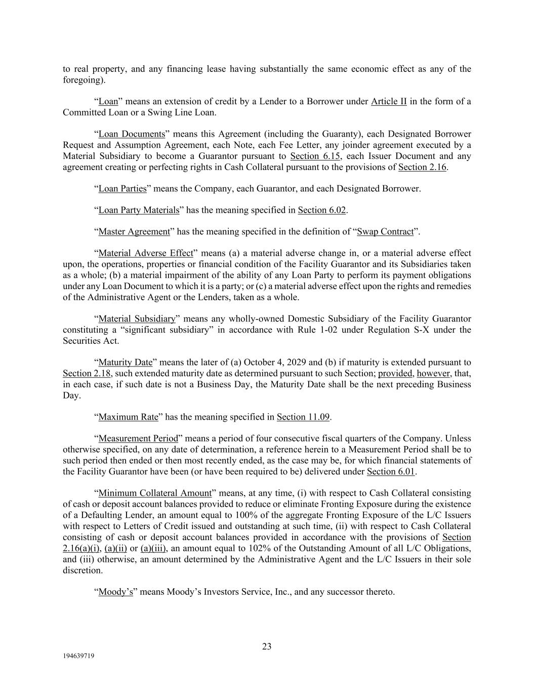 23 194639719 to real property, and any financing lease having substantially the same economic effect as any of the foregoing). “Loan” means an extension of credit by a Lender to a Borrower under Article II in the form of a Committed Loan or a Swing Line Loan. “Loan Documents” means this Agreement (including the Guaranty), each Designated Borrower Request and Assumption Agreement, each Note, each Fee Letter, any joinder agreement executed by a Material Subsidiary to become a Guarantor pursuant to Section 6.15, each Issuer Document and any agreement creating or perfecting rights in Cash Collateral pursuant to the provisions of Section 2.16. “Loan Parties” means the Company, each Guarantor, and each Designated Borrower. “Loan Party Materials” has the meaning specified in Section 6.02. “Master Agreement” has the meaning specified in the definition of “Swap Contract”. “Material Adverse Effect” means (a) a material adverse change in, or a material adverse effect upon, the operations, properties or financial condition of the Facility Guarantor and its Subsidiaries taken as a whole; (b) a material impairment of the ability of any Loan Party to perform its payment obligations under any Loan Document to which it is a party; or (c) a material adverse effect upon the rights and remedies of the Administrative Agent or the Lenders, taken as a whole. “Material Subsidiary” means any wholly-owned Domestic Subsidiary of the Facility Guarantor constituting a “significant subsidiary” in accordance with Rule 1-02 under Regulation S-X under the Securities Act. “Maturity Date” means the later of (a) October 4, 2029 and (b) if maturity is extended pursuant to Section 2.18, such extended maturity date as determined pursuant to such Section; provided, however, that, in each case, if such date is not a Business Day, the Maturity Date shall be the next preceding Business Day. “Maximum Rate” has the meaning specified in Section 11.09. “Measurement Period” means a period of four consecutive fiscal quarters of the Company. Unless otherwise specified, on any date of determination, a reference herein to a Measurement Period shall be to such period then ended or then most recently ended, as the case may be, for which financial statements of the Facility Guarantor have been (or have been required to be) delivered under Section 6.01. “Minimum Collateral Amount” means, at any time, (i) with respect to Cash Collateral consisting of cash or deposit account balances provided to reduce or eliminate Fronting Exposure during the existence of a Defaulting Lender, an amount equal to 100% of the aggregate Fronting Exposure of the L/C Issuers with respect to Letters of Credit issued and outstanding at such time, (ii) with respect to Cash Collateral consisting of cash or deposit account balances provided in accordance with the provisions of Section 2.16(a)(i), (a)(ii) or (a)(iii), an amount equal to 102% of the Outstanding Amount of all L/C Obligations, and (iii) otherwise, an amount determined by the Administrative Agent and the L/C Issuers in their sole discretion. “Moody’s” means Moody’s Investors Service, Inc., and any successor thereto.