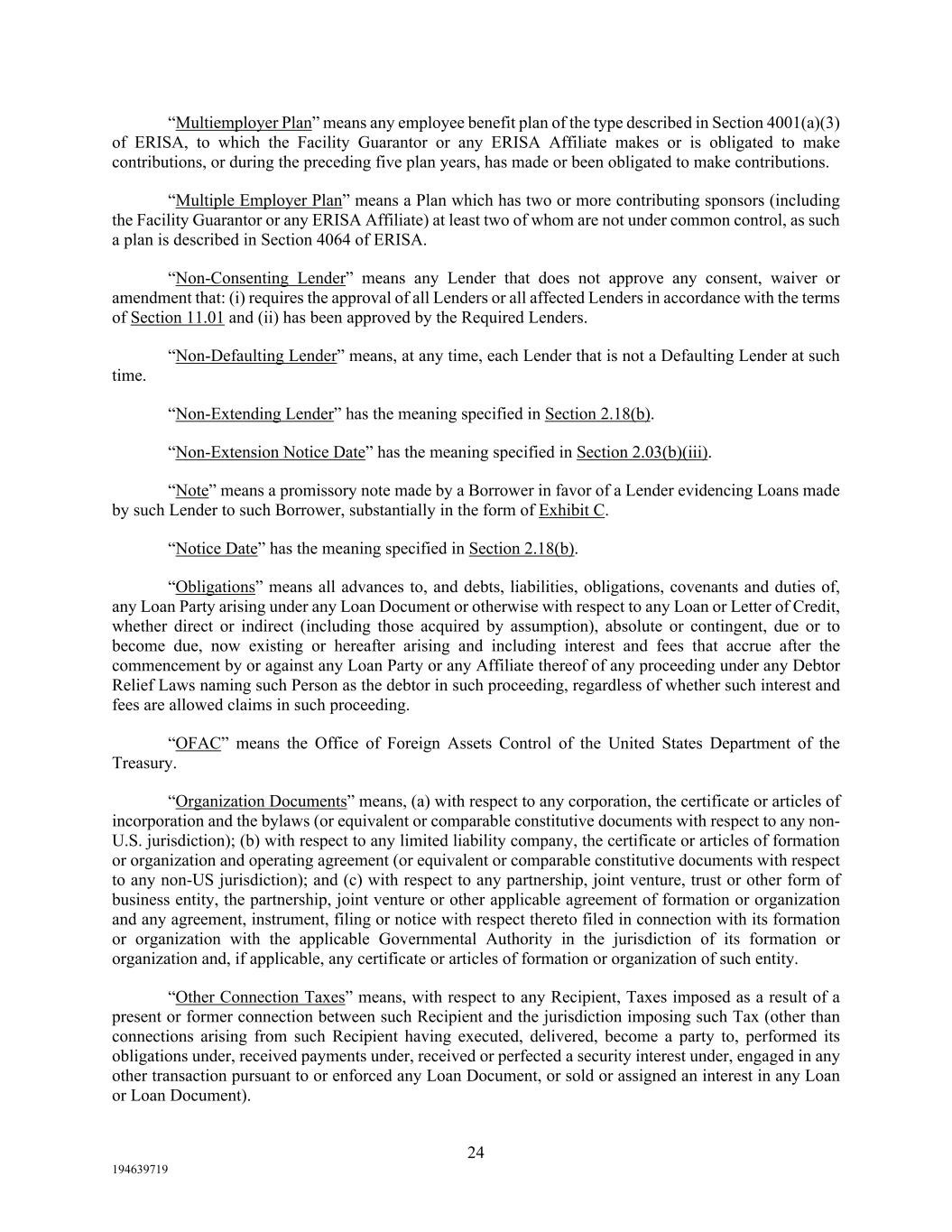 24 194639719 “Multiemployer Plan” means any employee benefit plan of the type described in Section 4001(a)(3) of ERISA, to which the Facility Guarantor or any ERISA Affiliate makes or is obligated to make contributions, or during the preceding five plan years, has made or been obligated to make contributions. “Multiple Employer Plan” means a Plan which has two or more contributing sponsors (including the Facility Guarantor or any ERISA Affiliate) at least two of whom are not under common control, as such a plan is described in Section 4064 of ERISA. “Non-Consenting Lender” means any Lender that does not approve any consent, waiver or amendment that: (i) requires the approval of all Lenders or all affected Lenders in accordance with the terms of Section 11.01 and (ii) has been approved by the Required Lenders. “Non-Defaulting Lender” means, at any time, each Lender that is not a Defaulting Lender at such time. “Non-Extending Lender” has the meaning specified in Section 2.18(b). “Non-Extension Notice Date” has the meaning specified in Section 2.03(b)(iii). “Note” means a promissory note made by a Borrower in favor of a Lender evidencing Loans made by such Lender to such Borrower, substantially in the form of Exhibit C. “Notice Date” has the meaning specified in Section 2.18(b). “Obligations” means all advances to, and debts, liabilities, obligations, covenants and duties of, any Loan Party arising under any Loan Document or otherwise with respect to any Loan or Letter of Credit, whether direct or indirect (including those acquired by assumption), absolute or contingent, due or to become due, now existing or hereafter arising and including interest and fees that accrue after the commencement by or against any Loan Party or any Affiliate thereof of any proceeding under any Debtor Relief Laws naming such Person as the debtor in such proceeding, regardless of whether such interest and fees are allowed claims in such proceeding. “OFAC” means the Office of Foreign Assets Control of the United States Department of the Treasury. “Organization Documents” means, (a) with respect to any corporation, the certificate or articles of incorporation and the bylaws (or equivalent or comparable constitutive documents with respect to any non- U.S. jurisdiction); (b) with respect to any limited liability company, the certificate or articles of formation or organization and operating agreement (or equivalent or comparable constitutive documents with respect to any non-US jurisdiction); and (c) with respect to any partnership, joint venture, trust or other form of business entity, the partnership, joint venture or other applicable agreement of formation or organization and any agreement, instrument, filing or notice with respect thereto filed in connection with its formation or organization with the applicable Governmental Authority in the jurisdiction of its formation or organization and, if applicable, any certificate or articles of formation or organization of such entity. “Other Connection Taxes” means, with respect to any Recipient, Taxes imposed as a result of a present or former connection between such Recipient and the jurisdiction imposing such Tax (other than connections arising from such Recipient having executed, delivered, become a party to, performed its obligations under, received payments under, received or perfected a security interest under, engaged in any other transaction pursuant to or enforced any Loan Document, or sold or assigned an interest in any Loan or Loan Document).