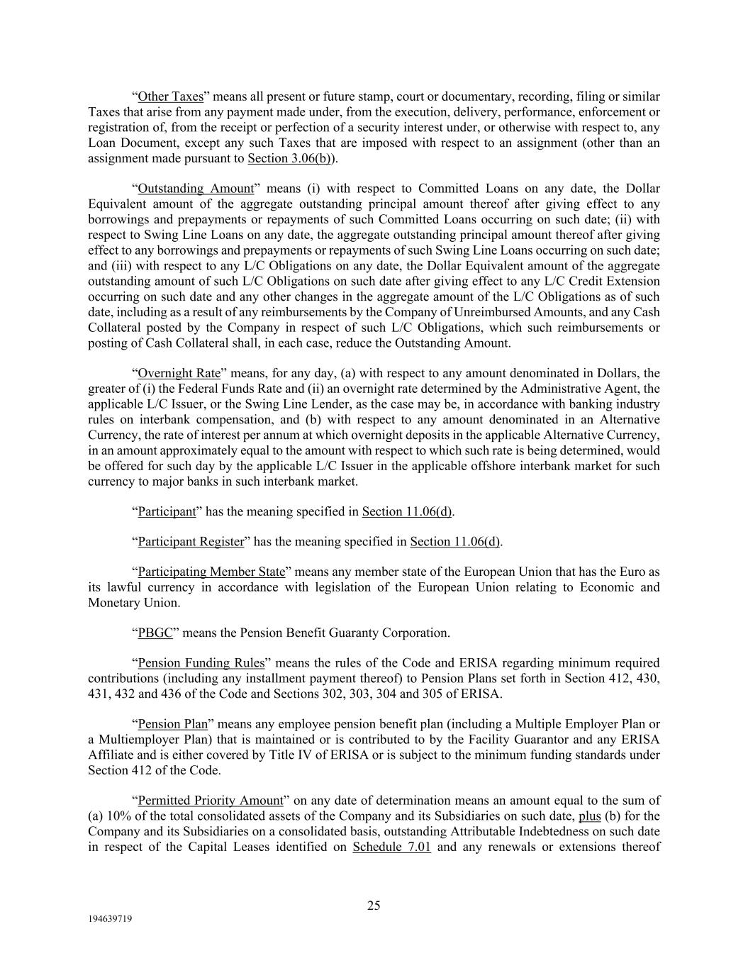 25 194639719 “Other Taxes” means all present or future stamp, court or documentary, recording, filing or similar Taxes that arise from any payment made under, from the execution, delivery, performance, enforcement or registration of, from the receipt or perfection of a security interest under, or otherwise with respect to, any Loan Document, except any such Taxes that are imposed with respect to an assignment (other than an assignment made pursuant to Section 3.06(b)). “Outstanding Amount” means (i) with respect to Committed Loans on any date, the Dollar Equivalent amount of the aggregate outstanding principal amount thereof after giving effect to any borrowings and prepayments or repayments of such Committed Loans occurring on such date; (ii) with respect to Swing Line Loans on any date, the aggregate outstanding principal amount thereof after giving effect to any borrowings and prepayments or repayments of such Swing Line Loans occurring on such date; and (iii) with respect to any L/C Obligations on any date, the Dollar Equivalent amount of the aggregate outstanding amount of such L/C Obligations on such date after giving effect to any L/C Credit Extension occurring on such date and any other changes in the aggregate amount of the L/C Obligations as of such date, including as a result of any reimbursements by the Company of Unreimbursed Amounts, and any Cash Collateral posted by the Company in respect of such L/C Obligations, which such reimbursements or posting of Cash Collateral shall, in each case, reduce the Outstanding Amount. “Overnight Rate” means, for any day, (a) with respect to any amount denominated in Dollars, the greater of (i) the Federal Funds Rate and (ii) an overnight rate determined by the Administrative Agent, the applicable L/C Issuer, or the Swing Line Lender, as the case may be, in accordance with banking industry rules on interbank compensation, and (b) with respect to any amount denominated in an Alternative Currency, the rate of interest per annum at which overnight deposits in the applicable Alternative Currency, in an amount approximately equal to the amount with respect to which such rate is being determined, would be offered for such day by the applicable L/C Issuer in the applicable offshore interbank market for such currency to major banks in such interbank market. “Participant” has the meaning specified in Section 11.06(d). “Participant Register” has the meaning specified in Section 11.06(d). “Participating Member State” means any member state of the European Union that has the Euro as its lawful currency in accordance with legislation of the European Union relating to Economic and Monetary Union. “PBGC” means the Pension Benefit Guaranty Corporation. “Pension Funding Rules” means the rules of the Code and ERISA regarding minimum required contributions (including any installment payment thereof) to Pension Plans set forth in Section 412, 430, 431, 432 and 436 of the Code and Sections 302, 303, 304 and 305 of ERISA. “Pension Plan” means any employee pension benefit plan (including a Multiple Employer Plan or a Multiemployer Plan) that is maintained or is contributed to by the Facility Guarantor and any ERISA Affiliate and is either covered by Title IV of ERISA or is subject to the minimum funding standards under Section 412 of the Code. “Permitted Priority Amount” on any date of determination means an amount equal to the sum of (a) 10% of the total consolidated assets of the Company and its Subsidiaries on such date, plus (b) for the Company and its Subsidiaries on a consolidated basis, outstanding Attributable Indebtedness on such date in respect of the Capital Leases identified on Schedule 7.01 and any renewals or extensions thereof