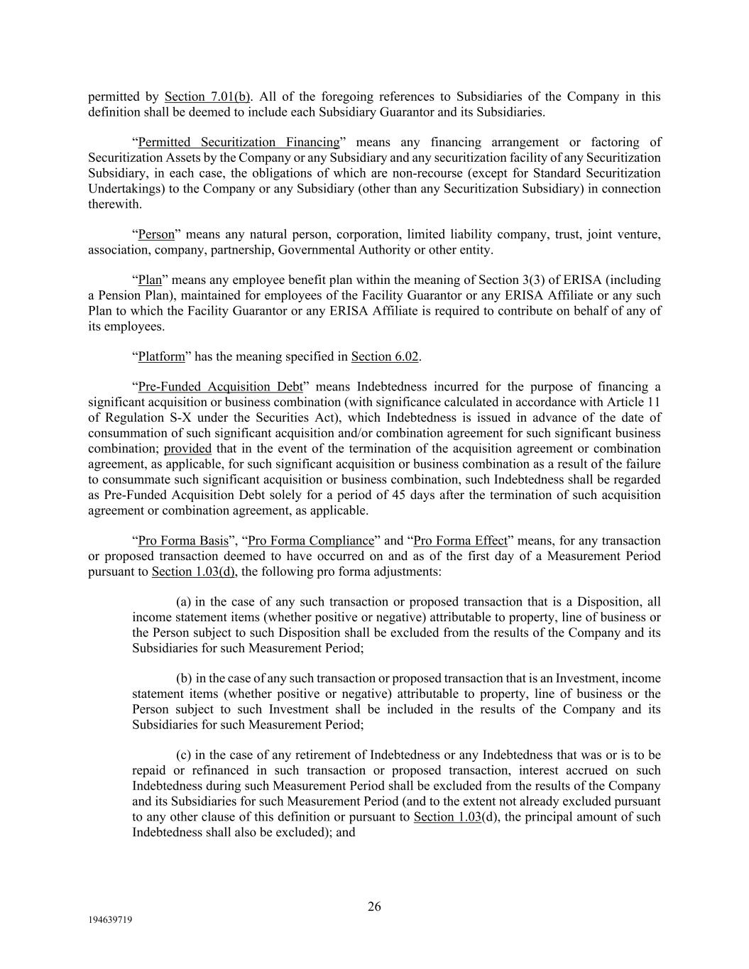 26 194639719 permitted by Section 7.01(b). All of the foregoing references to Subsidiaries of the Company in this definition shall be deemed to include each Subsidiary Guarantor and its Subsidiaries. “Permitted Securitization Financing” means any financing arrangement or factoring of Securitization Assets by the Company or any Subsidiary and any securitization facility of any Securitization Subsidiary, in each case, the obligations of which are non-recourse (except for Standard Securitization Undertakings) to the Company or any Subsidiary (other than any Securitization Subsidiary) in connection therewith. “Person” means any natural person, corporation, limited liability company, trust, joint venture, association, company, partnership, Governmental Authority or other entity. “Plan” means any employee benefit plan within the meaning of Section 3(3) of ERISA (including a Pension Plan), maintained for employees of the Facility Guarantor or any ERISA Affiliate or any such Plan to which the Facility Guarantor or any ERISA Affiliate is required to contribute on behalf of any of its employees. “Platform” has the meaning specified in Section 6.02. “Pre-Funded Acquisition Debt” means Indebtedness incurred for the purpose of financing a significant acquisition or business combination (with significance calculated in accordance with Article 11 of Regulation S-X under the Securities Act), which Indebtedness is issued in advance of the date of consummation of such significant acquisition and/or combination agreement for such significant business combination; provided that in the event of the termination of the acquisition agreement or combination agreement, as applicable, for such significant acquisition or business combination as a result of the failure to consummate such significant acquisition or business combination, such Indebtedness shall be regarded as Pre-Funded Acquisition Debt solely for a period of 45 days after the termination of such acquisition agreement or combination agreement, as applicable. “Pro Forma Basis”, “Pro Forma Compliance” and “Pro Forma Effect” means, for any transaction or proposed transaction deemed to have occurred on and as of the first day of a Measurement Period pursuant to Section 1.03(d), the following pro forma adjustments: (a) in the case of any such transaction or proposed transaction that is a Disposition, all income statement items (whether positive or negative) attributable to property, line of business or the Person subject to such Disposition shall be excluded from the results of the Company and its Subsidiaries for such Measurement Period; (b) in the case of any such transaction or proposed transaction that is an Investment, income statement items (whether positive or negative) attributable to property, line of business or the Person subject to such Investment shall be included in the results of the Company and its Subsidiaries for such Measurement Period; (c) in the case of any retirement of Indebtedness or any Indebtedness that was or is to be repaid or refinanced in such transaction or proposed transaction, interest accrued on such Indebtedness during such Measurement Period shall be excluded from the results of the Company and its Subsidiaries for such Measurement Period (and to the extent not already excluded pursuant to any other clause of this definition or pursuant to Section 1.03(d), the principal amount of such Indebtedness shall also be excluded); and