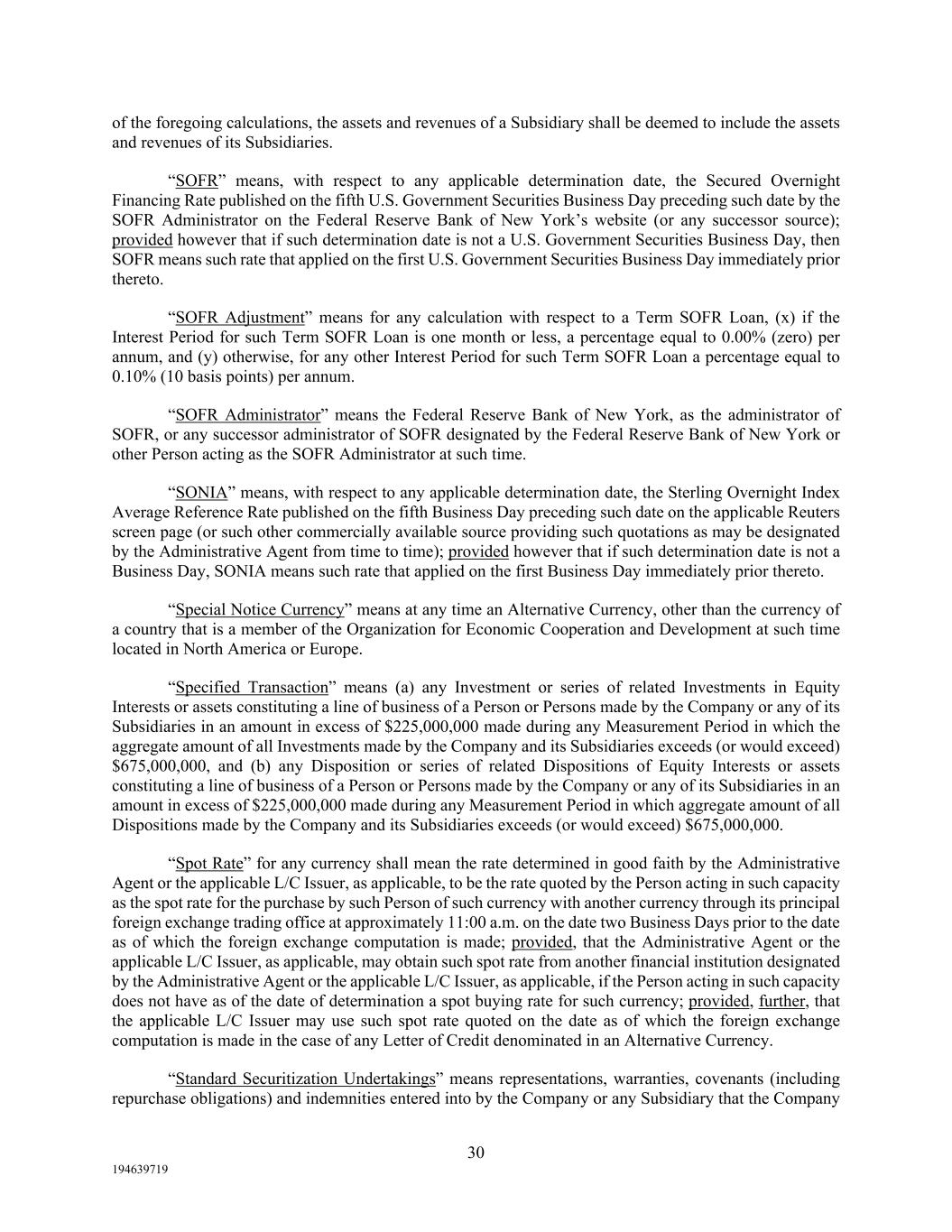 30 194639719 of the foregoing calculations, the assets and revenues of a Subsidiary shall be deemed to include the assets and revenues of its Subsidiaries. “SOFR” means, with respect to any applicable determination date, the Secured Overnight Financing Rate published on the fifth U.S. Government Securities Business Day preceding such date by the SOFR Administrator on the Federal Reserve Bank of New York’s website (or any successor source); provided however that if such determination date is not a U.S. Government Securities Business Day, then SOFR means such rate that applied on the first U.S. Government Securities Business Day immediately prior thereto. “SOFR Adjustment” means for any calculation with respect to a Term SOFR Loan, (x) if the Interest Period for such Term SOFR Loan is one month or less, a percentage equal to 0.00% (zero) per annum, and (y) otherwise, for any other Interest Period for such Term SOFR Loan a percentage equal to 0.10% (10 basis points) per annum. “SOFR Administrator” means the Federal Reserve Bank of New York, as the administrator of SOFR, or any successor administrator of SOFR designated by the Federal Reserve Bank of New York or other Person acting as the SOFR Administrator at such time. “SONIA” means, with respect to any applicable determination date, the Sterling Overnight Index Average Reference Rate published on the fifth Business Day preceding such date on the applicable Reuters screen page (or such other commercially available source providing such quotations as may be designated by the Administrative Agent from time to time); provided however that if such determination date is not a Business Day, SONIA means such rate that applied on the first Business Day immediately prior thereto. “Special Notice Currency” means at any time an Alternative Currency, other than the currency of a country that is a member of the Organization for Economic Cooperation and Development at such time located in North America or Europe. “Specified Transaction” means (a) any Investment or series of related Investments in Equity Interests or assets constituting a line of business of a Person or Persons made by the Company or any of its Subsidiaries in an amount in excess of $225,000,000 made during any Measurement Period in which the aggregate amount of all Investments made by the Company and its Subsidiaries exceeds (or would exceed) $675,000,000, and (b) any Disposition or series of related Dispositions of Equity Interests or assets constituting a line of business of a Person or Persons made by the Company or any of its Subsidiaries in an amount in excess of $225,000,000 made during any Measurement Period in which aggregate amount of all Dispositions made by the Company and its Subsidiaries exceeds (or would exceed) $675,000,000. “Spot Rate” for any currency shall mean the rate determined in good faith by the Administrative Agent or the applicable L/C Issuer, as applicable, to be the rate quoted by the Person acting in such capacity as the spot rate for the purchase by such Person of such currency with another currency through its principal foreign exchange trading office at approximately 11:00 a.m. on the date two Business Days prior to the date as of which the foreign exchange computation is made; provided, that the Administrative Agent or the applicable L/C Issuer, as applicable, may obtain such spot rate from another financial institution designated by the Administrative Agent or the applicable L/C Issuer, as applicable, if the Person acting in such capacity does not have as of the date of determination a spot buying rate for such currency; provided, further, that the applicable L/C Issuer may use such spot rate quoted on the date as of which the foreign exchange computation is made in the case of any Letter of Credit denominated in an Alternative Currency. “Standard Securitization Undertakings” means representations, warranties, covenants (including repurchase obligations) and indemnities entered into by the Company or any Subsidiary that the Company