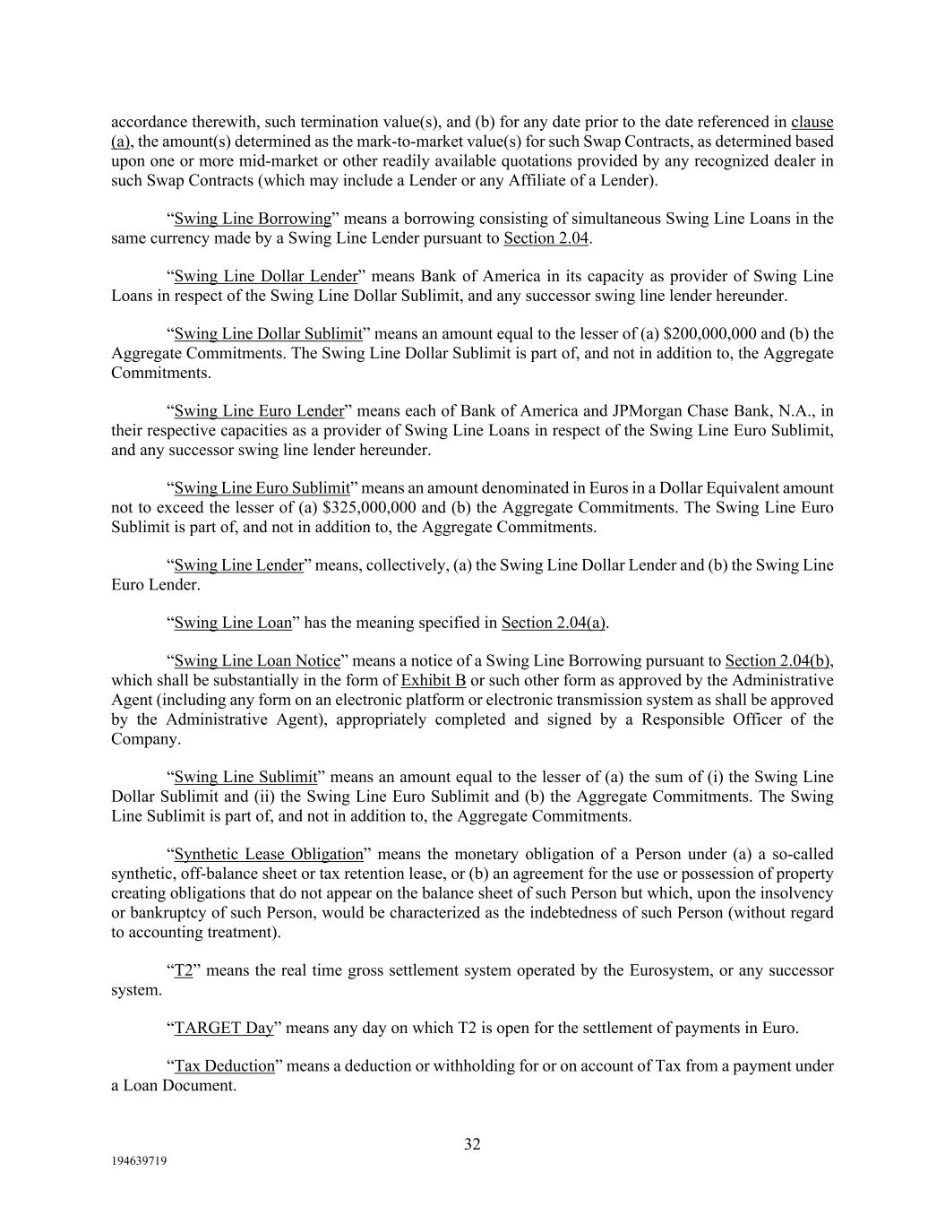32 194639719 accordance therewith, such termination value(s), and (b) for any date prior to the date referenced in clause (a), the amount(s) determined as the mark-to-market value(s) for such Swap Contracts, as determined based upon one or more mid-market or other readily available quotations provided by any recognized dealer in such Swap Contracts (which may include a Lender or any Affiliate of a Lender). “Swing Line Borrowing” means a borrowing consisting of simultaneous Swing Line Loans in the same currency made by a Swing Line Lender pursuant to Section 2.04. “Swing Line Dollar Lender” means Bank of America in its capacity as provider of Swing Line Loans in respect of the Swing Line Dollar Sublimit, and any successor swing line lender hereunder. “Swing Line Dollar Sublimit” means an amount equal to the lesser of (a) $200,000,000 and (b) the Aggregate Commitments. The Swing Line Dollar Sublimit is part of, and not in addition to, the Aggregate Commitments. “Swing Line Euro Lender” means each of Bank of America and JPMorgan Chase Bank, N.A., in their respective capacities as a provider of Swing Line Loans in respect of the Swing Line Euro Sublimit, and any successor swing line lender hereunder. “Swing Line Euro Sublimit” means an amount denominated in Euros in a Dollar Equivalent amount not to exceed the lesser of (a) $325,000,000 and (b) the Aggregate Commitments. The Swing Line Euro Sublimit is part of, and not in addition to, the Aggregate Commitments. “Swing Line Lender” means, collectively, (a) the Swing Line Dollar Lender and (b) the Swing Line Euro Lender. “Swing Line Loan” has the meaning specified in Section 2.04(a). “Swing Line Loan Notice” means a notice of a Swing Line Borrowing pursuant to Section 2.04(b), which shall be substantially in the form of Exhibit B or such other form as approved by the Administrative Agent (including any form on an electronic platform or electronic transmission system as shall be approved by the Administrative Agent), appropriately completed and signed by a Responsible Officer of the Company. “Swing Line Sublimit” means an amount equal to the lesser of (a) the sum of (i) the Swing Line Dollar Sublimit and (ii) the Swing Line Euro Sublimit and (b) the Aggregate Commitments. The Swing Line Sublimit is part of, and not in addition to, the Aggregate Commitments. “Synthetic Lease Obligation” means the monetary obligation of a Person under (a) a so-called synthetic, off-balance sheet or tax retention lease, or (b) an agreement for the use or possession of property creating obligations that do not appear on the balance sheet of such Person but which, upon the insolvency or bankruptcy of such Person, would be characterized as the indebtedness of such Person (without regard to accounting treatment). “T2” means the real time gross settlement system operated by the Eurosystem, or any successor system. “TARGET Day” means any day on which T2 is open for the settlement of payments in Euro. “Tax Deduction” means a deduction or withholding for or on account of Tax from a payment under a Loan Document.