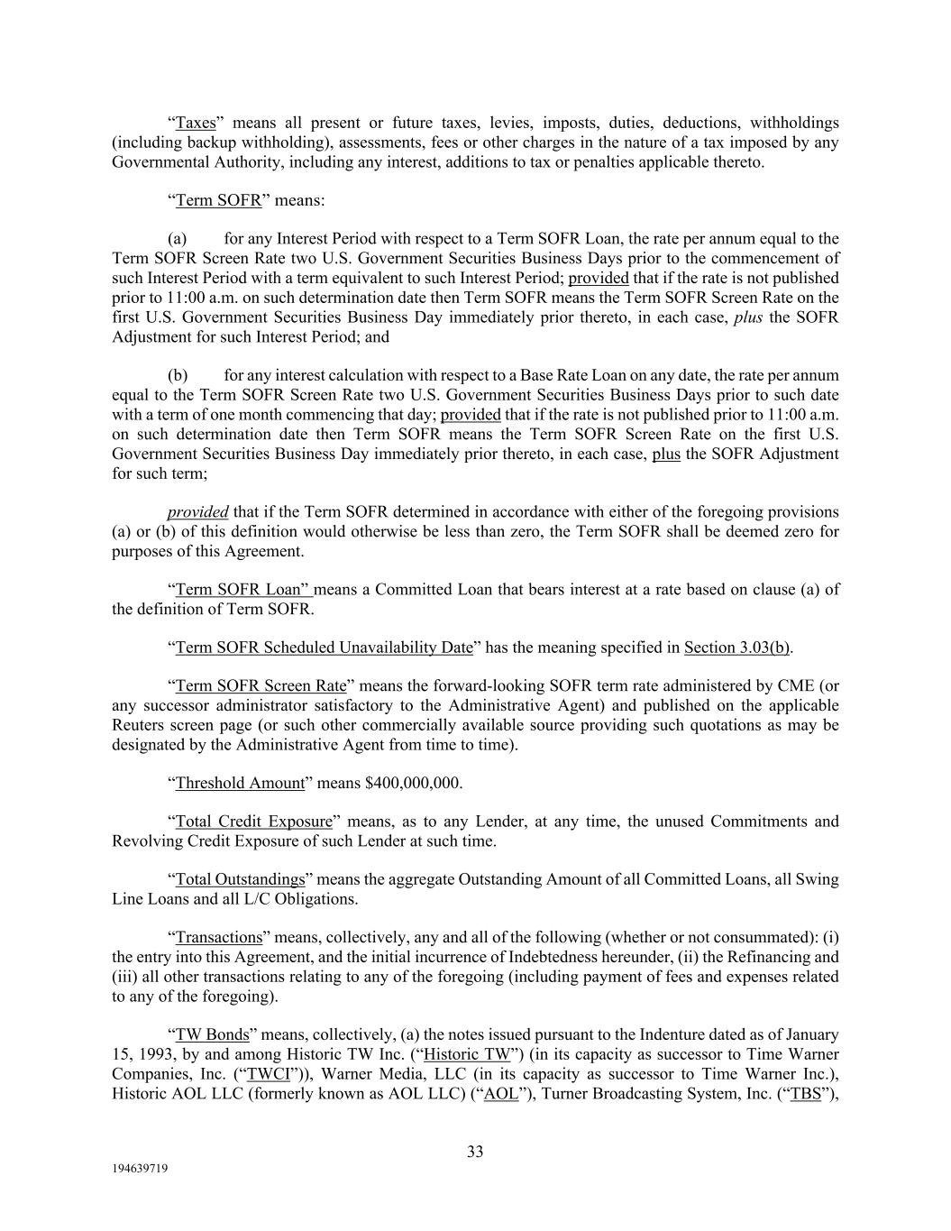 33 194639719 “Taxes” means all present or future taxes, levies, imposts, duties, deductions, withholdings (including backup withholding), assessments, fees or other charges in the nature of a tax imposed by any Governmental Authority, including any interest, additions to tax or penalties applicable thereto. “Term SOFR” means: (a) for any Interest Period with respect to a Term SOFR Loan, the rate per annum equal to the Term SOFR Screen Rate two U.S. Government Securities Business Days prior to the commencement of such Interest Period with a term equivalent to such Interest Period; provided that if the rate is not published prior to 11:00 a.m. on such determination date then Term SOFR means the Term SOFR Screen Rate on the first U.S. Government Securities Business Day immediately prior thereto, in each case, plus the SOFR Adjustment for such Interest Period; and (b) for any interest calculation with respect to a Base Rate Loan on any date, the rate per annum equal to the Term SOFR Screen Rate two U.S. Government Securities Business Days prior to such date with a term of one month commencing that day; provided that if the rate is not published prior to 11:00 a.m. on such determination date then Term SOFR means the Term SOFR Screen Rate on the first U.S. Government Securities Business Day immediately prior thereto, in each case, plus the SOFR Adjustment for such term; provided that if the Term SOFR determined in accordance with either of the foregoing provisions (a) or (b) of this definition would otherwise be less than zero, the Term SOFR shall be deemed zero for purposes of this Agreement. “Term SOFR Loan” means a Committed Loan that bears interest at a rate based on clause (a) of the definition of Term SOFR. “Term SOFR Scheduled Unavailability Date” has the meaning specified in Section 3.03(b). “Term SOFR Screen Rate” means the forward-looking SOFR term rate administered by CME (or any successor administrator satisfactory to the Administrative Agent) and published on the applicable Reuters screen page (or such other commercially available source providing such quotations as may be designated by the Administrative Agent from time to time). “Threshold Amount” means $400,000,000. “Total Credit Exposure” means, as to any Lender, at any time, the unused Commitments and Revolving Credit Exposure of such Lender at such time. “Total Outstandings” means the aggregate Outstanding Amount of all Committed Loans, all Swing Line Loans and all L/C Obligations. “Transactions” means, collectively, any and all of the following (whether or not consummated): (i) the entry into this Agreement, and the initial incurrence of Indebtedness hereunder, (ii) the Refinancing and (iii) all other transactions relating to any of the foregoing (including payment of fees and expenses related to any of the foregoing). “TW Bonds” means, collectively, (a) the notes issued pursuant to the Indenture dated as of January 15, 1993, by and among Historic TW Inc. (“Historic TW”) (in its capacity as successor to Time Warner Companies, Inc. (“TWCI”)), Warner Media, LLC (in its capacity as successor to Time Warner Inc.), Historic AOL LLC (formerly known as AOL LLC) (“AOL”), Turner Broadcasting System, Inc. (“TBS”),