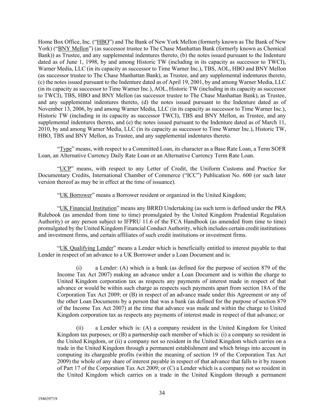 34 194639719 Home Box Office, Inc. (“HBO”) and The Bank of New York Mellon (formerly known as The Bank of New York) (“BNY Mellon”) (as successor trustee to The Chase Manhattan Bank (formerly known as Chemical Bank)) as Trustee, and any supplemental indentures thereto, (b) the notes issued pursuant to the Indenture dated as of June 1, 1998, by and among Historic TW (including in its capacity as successor to TWCI), Warner Media, LLC (in its capacity as successor to Time Warner Inc.), TBS, AOL, HBO and BNY Mellon (as successor trustee to The Chase Manhattan Bank), as Trustee, and any supplemental indentures thereto, (c) the notes issued pursuant to the Indenture dated as of April 19, 2001, by and among Warner Media, LLC (in its capacity as successor to Time Warner Inc.), AOL, Historic TW (including in its capacity as successor to TWCI), TBS, HBO and BNY Mellon (as successor trustee to The Chase Manhattan Bank), as Trustee, and any supplemental indentures thereto, (d) the notes issued pursuant to the Indenture dated as of November 13, 2006, by and among Warner Media, LLC (in its capacity as successor to Time Warner Inc.), Historic TW (including in its capacity as successor TWCI), TBS and BNY Mellon, as Trustee, and any supplemental indentures thereto, and (e) the notes issued pursuant to the Indenture dated as of March 11, 2010, by and among Warner Media, LLC (in its capacity as successor to Time Warner Inc.), Historic TW, HBO, TBS and BNY Mellon, as Trustee, and any supplemental indentures thereto. “Type” means, with respect to a Committed Loan, its character as a Base Rate Loan, a Term SOFR Loan, an Alternative Currency Daily Rate Loan or an Alternative Currency Term Rate Loan. “UCP” means, with respect to any Letter of Credit, the Uniform Customs and Practice for Documentary Credits, International Chamber of Commerce (“ICC”) Publication No. 600 (or such later version thereof as may be in effect at the time of issuance). “UK Borrower” means a Borrower resident or organized in the United Kingdom; “UK Financial Institution” means any BRRD Undertaking (as such term is defined under the PRA Rulebook (as amended from time to time) promulgated by the United Kingdom Prudential Regulation Authority) or any person subject to IFPRU 11.6 of the FCA Handbook (as amended from time to time) promulgated by the United Kingdom Financial Conduct Authority, which includes certain credit institutions and investment firms, and certain affiliates of such credit institutions or investment firms. “UK Qualifying Lender” means a Lender which is beneficially entitled to interest payable to that Lender in respect of an advance to a UK Borrower under a Loan Document and is: (i) a Lender: (A) which is a bank (as defined for the purpose of section 879 of the Income Tax Act 2007) making an advance under a Loan Document and is within the charge to United Kingdom corporation tax as respects any payments of interest made in respect of that advance or would be within such charge as respects such payments apart from section 18A of the Corporation Tax Act 2009; or (B) in respect of an advance made under this Agreement or any of the other Loan Documents by a person that was a bank (as defined for the purpose of section 879 of the Income Tax Act 2007) at the time that advance was made and within the charge to United Kingdom corporation tax as respects any payments of interest made in respect of that advance; or (ii) a Lender which is: (A) a company resident in the United Kingdom for United Kingdom tax purposes; or (B) a partnership each member of which is: (i) a company so resident in the United Kingdom, or (ii) a company not so resident in the United Kingdom which carries on a trade in the United Kingdom through a permanent establishment and which brings into account in computing its chargeable profits (within the meaning of section 19 of the Corporation Tax Act 2009) the whole of any share of interest payable in respect of that advance that falls to it by reason of Part 17 of the Corporation Tax Act 2009; or (C) a Lender which is a company not so resident in the United Kingdom which carries on a trade in the United Kingdom through a permanent
