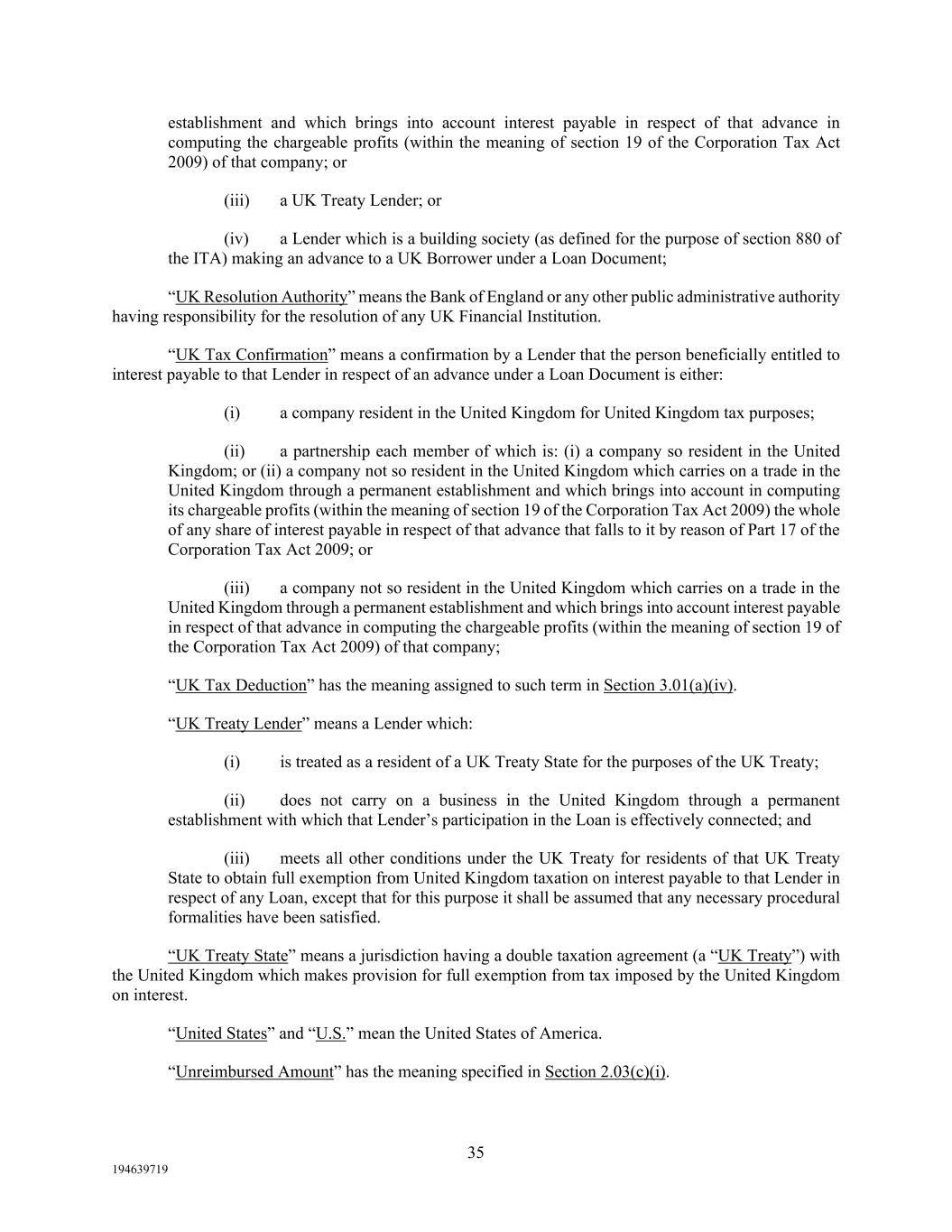 35 194639719 establishment and which brings into account interest payable in respect of that advance in computing the chargeable profits (within the meaning of section 19 of the Corporation Tax Act 2009) of that company; or (iii) a UK Treaty Lender; or (iv) a Lender which is a building society (as defined for the purpose of section 880 of the ITA) making an advance to a UK Borrower under a Loan Document; “UK Resolution Authority” means the Bank of England or any other public administrative authority having responsibility for the resolution of any UK Financial Institution. “UK Tax Confirmation” means a confirmation by a Lender that the person beneficially entitled to interest payable to that Lender in respect of an advance under a Loan Document is either: (i) a company resident in the United Kingdom for United Kingdom tax purposes; (ii) a partnership each member of which is: (i) a company so resident in the United Kingdom; or (ii) a company not so resident in the United Kingdom which carries on a trade in the United Kingdom through a permanent establishment and which brings into account in computing its chargeable profits (within the meaning of section 19 of the Corporation Tax Act 2009) the whole of any share of interest payable in respect of that advance that falls to it by reason of Part 17 of the Corporation Tax Act 2009; or (iii) a company not so resident in the United Kingdom which carries on a trade in the United Kingdom through a permanent establishment and which brings into account interest payable in respect of that advance in computing the chargeable profits (within the meaning of section 19 of the Corporation Tax Act 2009) of that company; “UK Tax Deduction” has the meaning assigned to such term in Section 3.01(a)(iv). “UK Treaty Lender” means a Lender which: (i) is treated as a resident of a UK Treaty State for the purposes of the UK Treaty; (ii) does not carry on a business in the United Kingdom through a permanent establishment with which that Lender’s participation in the Loan is effectively connected; and (iii) meets all other conditions under the UK Treaty for residents of that UK Treaty State to obtain full exemption from United Kingdom taxation on interest payable to that Lender in respect of any Loan, except that for this purpose it shall be assumed that any necessary procedural formalities have been satisfied. “UK Treaty State” means a jurisdiction having a double taxation agreement (a “UK Treaty”) with the United Kingdom which makes provision for full exemption from tax imposed by the United Kingdom on interest. “United States” and “U.S.” mean the United States of America. “Unreimbursed Amount” has the meaning specified in Section 2.03(c)(i).
