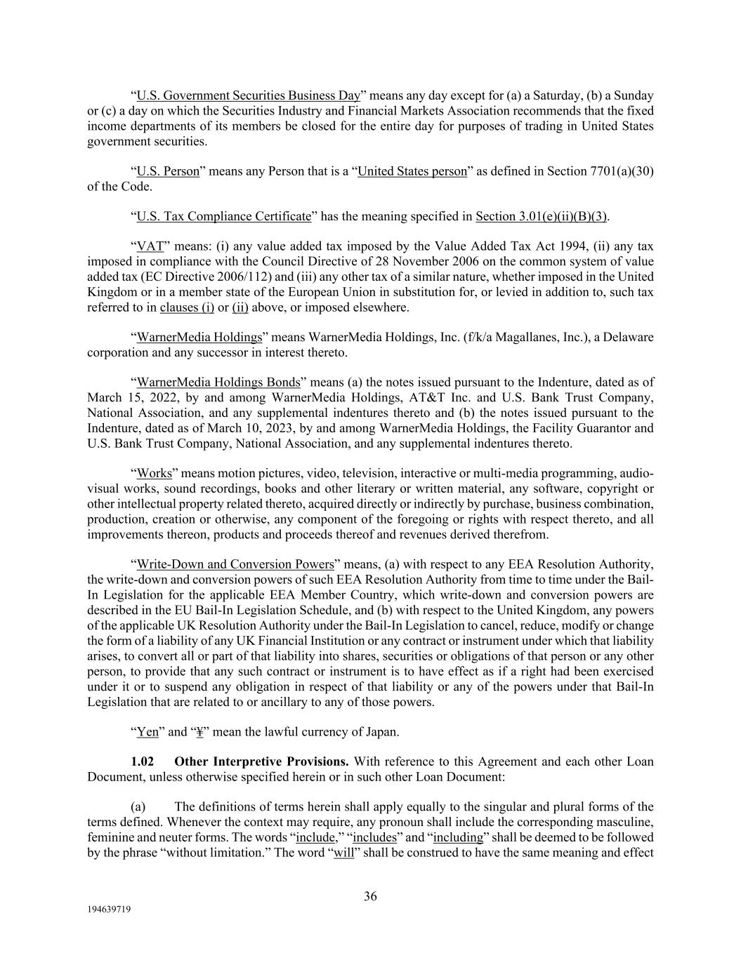 36 194639719 “U.S. Government Securities Business Day” means any day except for (a) a Saturday, (b) a Sunday or (c) a day on which the Securities Industry and Financial Markets Association recommends that the fixed income departments of its members be closed for the entire day for purposes of trading in United States government securities. “U.S. Person” means any Person that is a “United States person” as defined in Section 7701(a)(30) of the Code. “U.S. Tax Compliance Certificate” has the meaning specified in Section 3.01(e)(ii)(B)(3). “VAT” means: (i) any value added tax imposed by the Value Added Tax Act 1994, (ii) any tax imposed in compliance with the Council Directive of 28 November 2006 on the common system of value added tax (EC Directive 2006/112) and (iii) any other tax of a similar nature, whether imposed in the United Kingdom or in a member state of the European Union in substitution for, or levied in addition to, such tax referred to in clauses (i) or (ii) above, or imposed elsewhere. “WarnerMedia Holdings” means WarnerMedia Holdings, Inc. (f/k/a Magallanes, Inc.), a Delaware corporation and any successor in interest thereto. “WarnerMedia Holdings Bonds” means (a) the notes issued pursuant to the Indenture, dated as of March 15, 2022, by and among WarnerMedia Holdings, AT&T Inc. and U.S. Bank Trust Company, National Association, and any supplemental indentures thereto and (b) the notes issued pursuant to the Indenture, dated as of March 10, 2023, by and among WarnerMedia Holdings, the Facility Guarantor and U.S. Bank Trust Company, National Association, and any supplemental indentures thereto. “Works” means motion pictures, video, television, interactive or multi-media programming, audio- visual works, sound recordings, books and other literary or written material, any software, copyright or other intellectual property related thereto, acquired directly or indirectly by purchase, business combination, production, creation or otherwise, any component of the foregoing or rights with respect thereto, and all improvements thereon, products and proceeds thereof and revenues derived therefrom. “Write-Down and Conversion Powers” means, (a) with respect to any EEA Resolution Authority, the write-down and conversion powers of such EEA Resolution Authority from time to time under the Bail- In Legislation for the applicable EEA Member Country, which write-down and conversion powers are described in the EU Bail-In Legislation Schedule, and (b) with respect to the United Kingdom, any powers of the applicable UK Resolution Authority under the Bail-In Legislation to cancel, reduce, modify or change the form of a liability of any UK Financial Institution or any contract or instrument under which that liability arises, to convert all or part of that liability into shares, securities or obligations of that person or any other person, to provide that any such contract or instrument is to have effect as if a right had been exercised under it or to suspend any obligation in respect of that liability or any of the powers under that Bail-In Legislation that are related to or ancillary to any of those powers. “Yen” and “¥” mean the lawful currency of Japan. 1.02 Other Interpretive Provisions. With reference to this Agreement and each other Loan Document, unless otherwise specified herein or in such other Loan Document: (a) The definitions of terms herein shall apply equally to the singular and plural forms of the terms defined. Whenever the context may require, any pronoun shall include the corresponding masculine, feminine and neuter forms. The words “include,” “includes” and “including” shall be deemed to be followed by the phrase “without limitation.” The word “will” shall be construed to have the same meaning and effect