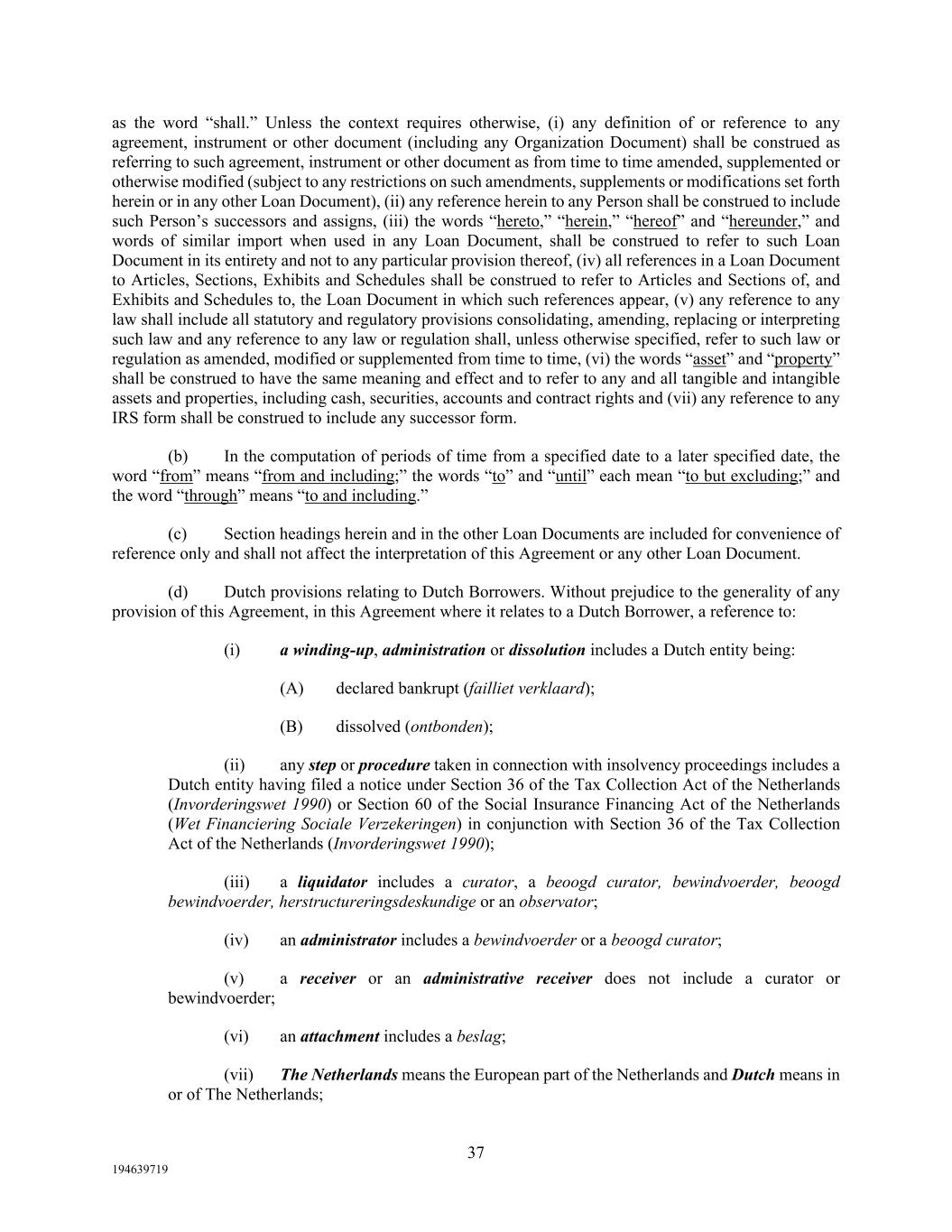 37 194639719 as the word “shall.” Unless the context requires otherwise, (i) any definition of or reference to any agreement, instrument or other document (including any Organization Document) shall be construed as referring to such agreement, instrument or other document as from time to time amended, supplemented or otherwise modified (subject to any restrictions on such amendments, supplements or modifications set forth herein or in any other Loan Document), (ii) any reference herein to any Person shall be construed to include such Person’s successors and assigns, (iii) the words “hereto,” “herein,” “hereof” and “hereunder,” and words of similar import when used in any Loan Document, shall be construed to refer to such Loan Document in its entirety and not to any particular provision thereof, (iv) all references in a Loan Document to Articles, Sections, Exhibits and Schedules shall be construed to refer to Articles and Sections of, and Exhibits and Schedules to, the Loan Document in which such references appear, (v) any reference to any law shall include all statutory and regulatory provisions consolidating, amending, replacing or interpreting such law and any reference to any law or regulation shall, unless otherwise specified, refer to such law or regulation as amended, modified or supplemented from time to time, (vi) the words “asset” and “property” shall be construed to have the same meaning and effect and to refer to any and all tangible and intangible assets and properties, including cash, securities, accounts and contract rights and (vii) any reference to any IRS form shall be construed to include any successor form. (b) In the computation of periods of time from a specified date to a later specified date, the word “from” means “from and including;” the words “to” and “until” each mean “to but excluding;” and the word “through” means “to and including.” (c) Section headings herein and in the other Loan Documents are included for convenience of reference only and shall not affect the interpretation of this Agreement or any other Loan Document. (d) Dutch provisions relating to Dutch Borrowers. Without prejudice to the generality of any provision of this Agreement, in this Agreement where it relates to a Dutch Borrower, a reference to: (i) a winding-up, administration or dissolution includes a Dutch entity being: (A) declared bankrupt (failliet verklaard); (B) dissolved (ontbonden); (ii) any step or procedure taken in connection with insolvency proceedings includes a Dutch entity having filed a notice under Section 36 of the Tax Collection Act of the Netherlands (Invorderingswet 1990) or Section 60 of the Social Insurance Financing Act of the Netherlands (Wet Financiering Sociale Verzekeringen) in conjunction with Section 36 of the Tax Collection Act of the Netherlands (Invorderingswet 1990); (iii) a liquidator includes a curator, a beoogd curator, bewindvoerder, beoogd bewindvoerder, herstructureringsdeskundige or an observator; (iv) an administrator includes a bewindvoerder or a beoogd curator; (v) a receiver or an administrative receiver does not include a curator or bewindvoerder; (vi) an attachment includes a beslag; (vii) The Netherlands means the European part of the Netherlands and Dutch means in or of The Netherlands;