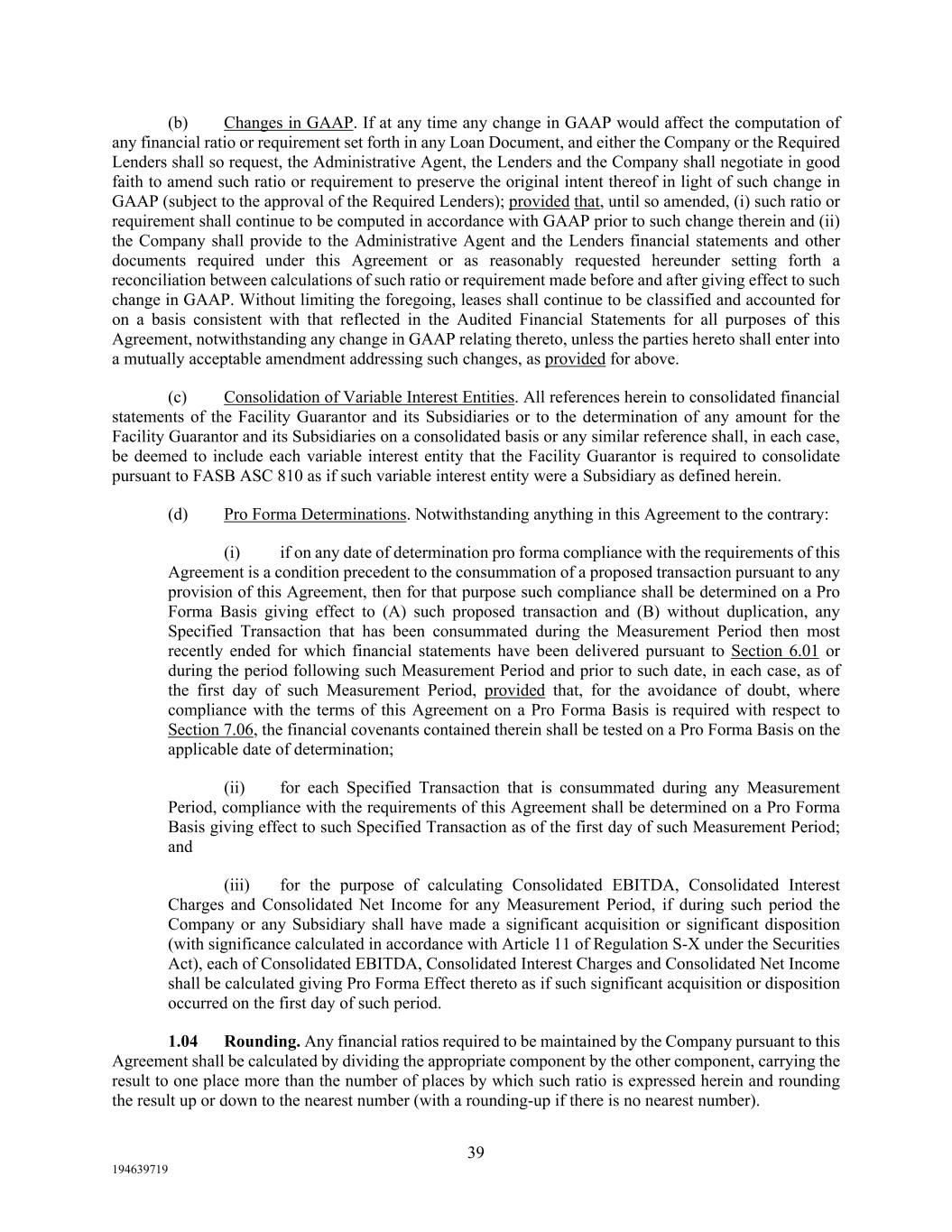 39 194639719 (b) Changes in GAAP. If at any time any change in GAAP would affect the computation of any financial ratio or requirement set forth in any Loan Document, and either the Company or the Required Lenders shall so request, the Administrative Agent, the Lenders and the Company shall negotiate in good faith to amend such ratio or requirement to preserve the original intent thereof in light of such change in GAAP (subject to the approval of the Required Lenders); provided that, until so amended, (i) such ratio or requirement shall continue to be computed in accordance with GAAP prior to such change therein and (ii) the Company shall provide to the Administrative Agent and the Lenders financial statements and other documents required under this Agreement or as reasonably requested hereunder setting forth a reconciliation between calculations of such ratio or requirement made before and after giving effect to such change in GAAP. Without limiting the foregoing, leases shall continue to be classified and accounted for on a basis consistent with that reflected in the Audited Financial Statements for all purposes of this Agreement, notwithstanding any change in GAAP relating thereto, unless the parties hereto shall enter into a mutually acceptable amendment addressing such changes, as provided for above. (c) Consolidation of Variable Interest Entities. All references herein to consolidated financial statements of the Facility Guarantor and its Subsidiaries or to the determination of any amount for the Facility Guarantor and its Subsidiaries on a consolidated basis or any similar reference shall, in each case, be deemed to include each variable interest entity that the Facility Guarantor is required to consolidate pursuant to FASB ASC 810 as if such variable interest entity were a Subsidiary as defined herein. (d) Pro Forma Determinations. Notwithstanding anything in this Agreement to the contrary: (i) if on any date of determination pro forma compliance with the requirements of this Agreement is a condition precedent to the consummation of a proposed transaction pursuant to any provision of this Agreement, then for that purpose such compliance shall be determined on a Pro Forma Basis giving effect to (A) such proposed transaction and (B) without duplication, any Specified Transaction that has been consummated during the Measurement Period then most recently ended for which financial statements have been delivered pursuant to Section 6.01 or during the period following such Measurement Period and prior to such date, in each case, as of the first day of such Measurement Period, provided that, for the avoidance of doubt, where compliance with the terms of this Agreement on a Pro Forma Basis is required with respect to Section 7.06, the financial covenants contained therein shall be tested on a Pro Forma Basis on the applicable date of determination; (ii) for each Specified Transaction that is consummated during any Measurement Period, compliance with the requirements of this Agreement shall be determined on a Pro Forma Basis giving effect to such Specified Transaction as of the first day of such Measurement Period; and (iii) for the purpose of calculating Consolidated EBITDA, Consolidated Interest Charges and Consolidated Net Income for any Measurement Period, if during such period the Company or any Subsidiary shall have made a significant acquisition or significant disposition (with significance calculated in accordance with Article 11 of Regulation S-X under the Securities Act), each of Consolidated EBITDA, Consolidated Interest Charges and Consolidated Net Income shall be calculated giving Pro Forma Effect thereto as if such significant acquisition or disposition occurred on the first day of such period. 1.04 Rounding. Any financial ratios required to be maintained by the Company pursuant to this Agreement shall be calculated by dividing the appropriate component by the other component, carrying the result to one place more than the number of places by which such ratio is expressed herein and rounding the result up or down to the nearest number (with a rounding-up if there is no nearest number).