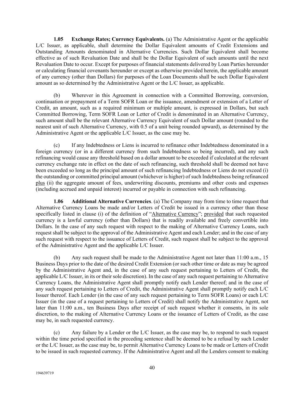 40 194639719 1.05 Exchange Rates; Currency Equivalents. (a) The Administrative Agent or the applicable L/C Issuer, as applicable, shall determine the Dollar Equivalent amounts of Credit Extensions and Outstanding Amounts denominated in Alternative Currencies. Such Dollar Equivalent shall become effective as of such Revaluation Date and shall be the Dollar Equivalent of such amounts until the next Revaluation Date to occur. Except for purposes of financial statements delivered by Loan Parties hereunder or calculating financial covenants hereunder or except as otherwise provided herein, the applicable amount of any currency (other than Dollars) for purposes of the Loan Documents shall be such Dollar Equivalent amount as so determined by the Administrative Agent or the L/C Issuer, as applicable. (b) Wherever in this Agreement in connection with a Committed Borrowing, conversion, continuation or prepayment of a Term SOFR Loan or the issuance, amendment or extension of a Letter of Credit, an amount, such as a required minimum or multiple amount, is expressed in Dollars, but such Committed Borrowing, Term SOFR Loan or Letter of Credit is denominated in an Alternative Currency, such amount shall be the relevant Alternative Currency Equivalent of such Dollar amount (rounded to the nearest unit of such Alternative Currency, with 0.5 of a unit being rounded upward), as determined by the Administrative Agent or the applicable L/C Issuer, as the case may be. (c) If any Indebtedness or Liens is incurred to refinance other Indebtedness denominated in a foreign currency (or in a different currency from such Indebtedness so being incurred), and any such refinancing would cause any threshold based on a dollar amount to be exceeded if calculated at the relevant currency exchange rate in effect on the date of such refinancing, such threshold shall be deemed not have been exceeded so long as the principal amount of such refinancing Indebtedness or Liens do not exceed (i) the outstanding or committed principal amount (whichever is higher) of such Indebtedness being refinanced plus (ii) the aggregate amount of fees, underwriting discounts, premiums and other costs and expenses (including accrued and unpaid interest) incurred or payable in connection with such refinancing. 1.06 Additional Alternative Currencies. (a) The Company may from time to time request that Alternative Currency Loans be made and/or Letters of Credit be issued in a currency other than those specifically listed in clause (i) of the definition of “Alternative Currency”; provided that such requested currency is a lawful currency (other than Dollars) that is readily available and freely convertible into Dollars. In the case of any such request with respect to the making of Alternative Currency Loans, such request shall be subject to the approval of the Administrative Agent and each Lender; and in the case of any such request with respect to the issuance of Letters of Credit, such request shall be subject to the approval of the Administrative Agent and the applicable L/C Issuer. (b) Any such request shall be made to the Administrative Agent not later than 11:00 a.m., 15 Business Days prior to the date of the desired Credit Extension (or such other time or date as may be agreed by the Administrative Agent and, in the case of any such request pertaining to Letters of Credit, the applicable L/C Issuer, in its or their sole discretion). In the case of any such request pertaining to Alternative Currency Loans, the Administrative Agent shall promptly notify each Lender thereof; and in the case of any such request pertaining to Letters of Credit, the Administrative Agent shall promptly notify each L/C Issuer thereof. Each Lender (in the case of any such request pertaining to Term SOFR Loans) or each L/C Issuer (in the case of a request pertaining to Letters of Credit) shall notify the Administrative Agent, not later than 11:00 a.m., ten Business Days after receipt of such request whether it consents, in its sole discretion, to the making of Alternative Currency Loans or the issuance of Letters of Credit, as the case may be, in such requested currency. (c) Any failure by a Lender or the L/C Issuer, as the case may be, to respond to such request within the time period specified in the preceding sentence shall be deemed to be a refusal by such Lender or the L/C Issuer, as the case may be, to permit Alternative Currency Loans to be made or Letters of Credit to be issued in such requested currency. If the Administrative Agent and all the Lenders consent to making