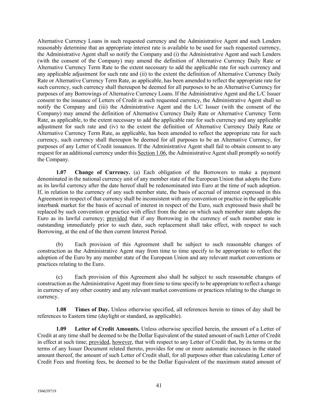 41 194639719 Alternative Currency Loans in such requested currency and the Administrative Agent and such Lenders reasonably determine that an appropriate interest rate is available to be used for such requested currency, the Administrative Agent shall so notify the Company and (i) the Administrative Agent and such Lenders (with the consent of the Company) may amend the definition of Alternative Currency Daily Rate or Alternative Currency Term Rate to the extent necessary to add the applicable rate for such currency and any applicable adjustment for such rate and (ii) to the extent the definition of Alternative Currency Daily Rate or Alternative Currency Term Rate, as applicable, has been amended to reflect the appropriate rate for such currency, such currency shall thereupon be deemed for all purposes to be an Alternative Currency for purposes of any Borrowings of Alternative Currency Loans. If the Administrative Agent and the L/C Issuer consent to the issuance of Letters of Credit in such requested currency, the Administrative Agent shall so notify the Company and (iii) the Administrative Agent and the L/C Issuer (with the consent of the Company) may amend the definition of Alternative Currency Daily Rate or Alternative Currency Term Rate, as applicable, to the extent necessary to add the applicable rate for such currency and any applicable adjustment for such rate and (iv) to the extent the definition of Alternative Currency Daily Rate or Alternative Currency Term Rate, as applicable, has been amended to reflect the appropriate rate for such currency, such currency shall thereupon be deemed for all purposes to be an Alternative Currency, for purposes of any Letter of Credit issuances. If the Administrative Agent shall fail to obtain consent to any request for an additional currency under this Section 1.06, the Administrative Agent shall promptly so notify the Company. 1.07 Change of Currency. (a) Each obligation of the Borrowers to make a payment denominated in the national currency unit of any member state of the European Union that adopts the Euro as its lawful currency after the date hereof shall be redenominated into Euro at the time of such adoption. If, in relation to the currency of any such member state, the basis of accrual of interest expressed in this Agreement in respect of that currency shall be inconsistent with any convention or practice in the applicable interbank market for the basis of accrual of interest in respect of the Euro, such expressed basis shall be replaced by such convention or practice with effect from the date on which such member state adopts the Euro as its lawful currency; provided that if any Borrowing in the currency of such member state is outstanding immediately prior to such date, such replacement shall take effect, with respect to such Borrowing, at the end of the then current Interest Period. (b) Each provision of this Agreement shall be subject to such reasonable changes of construction as the Administrative Agent may from time to time specify to be appropriate to reflect the adoption of the Euro by any member state of the European Union and any relevant market conventions or practices relating to the Euro. (c) Each provision of this Agreement also shall be subject to such reasonable changes of construction as the Administrative Agent may from time to time specify to be appropriate to reflect a change in currency of any other country and any relevant market conventions or practices relating to the change in currency. 1.08 Times of Day. Unless otherwise specified, all references herein to times of day shall be references to Eastern time (daylight or standard, as applicable). 1.09 Letter of Credit Amounts. Unless otherwise specified herein, the amount of a Letter of Credit at any time shall be deemed to be the Dollar Equivalent of the stated amount of such Letter of Credit in effect at such time; provided, however, that with respect to any Letter of Credit that, by its terms or the terms of any Issuer Document related thereto, provides for one or more automatic increases in the stated amount thereof, the amount of such Letter of Credit shall, for all purposes other than calculating Letter of Credit Fees and fronting fees, be deemed to be the Dollar Equivalent of the maximum stated amount of
