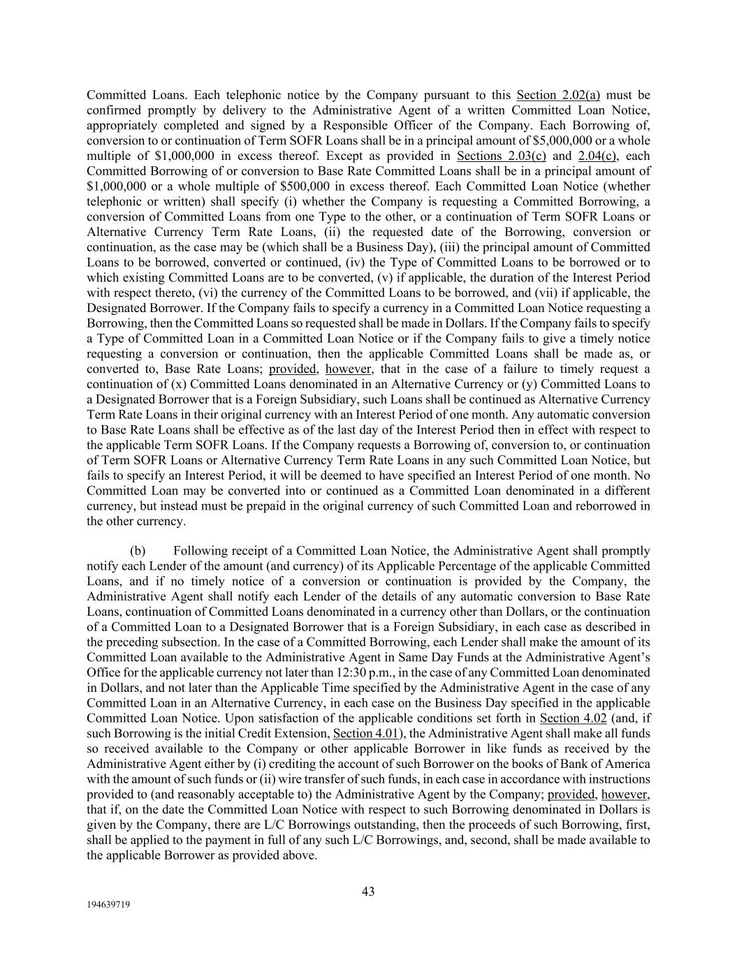 43 194639719 Committed Loans. Each telephonic notice by the Company pursuant to this Section 2.02(a) must be confirmed promptly by delivery to the Administrative Agent of a written Committed Loan Notice, appropriately completed and signed by a Responsible Officer of the Company. Each Borrowing of, conversion to or continuation of Term SOFR Loans shall be in a principal amount of $5,000,000 or a whole multiple of $1,000,000 in excess thereof. Except as provided in Sections 2.03(c) and 2.04(c), each Committed Borrowing of or conversion to Base Rate Committed Loans shall be in a principal amount of $1,000,000 or a whole multiple of $500,000 in excess thereof. Each Committed Loan Notice (whether telephonic or written) shall specify (i) whether the Company is requesting a Committed Borrowing, a conversion of Committed Loans from one Type to the other, or a continuation of Term SOFR Loans or Alternative Currency Term Rate Loans, (ii) the requested date of the Borrowing, conversion or continuation, as the case may be (which shall be a Business Day), (iii) the principal amount of Committed Loans to be borrowed, converted or continued, (iv) the Type of Committed Loans to be borrowed or to which existing Committed Loans are to be converted, (v) if applicable, the duration of the Interest Period with respect thereto, (vi) the currency of the Committed Loans to be borrowed, and (vii) if applicable, the Designated Borrower. If the Company fails to specify a currency in a Committed Loan Notice requesting a Borrowing, then the Committed Loans so requested shall be made in Dollars. If the Company fails to specify a Type of Committed Loan in a Committed Loan Notice or if the Company fails to give a timely notice requesting a conversion or continuation, then the applicable Committed Loans shall be made as, or converted to, Base Rate Loans; provided, however, that in the case of a failure to timely request a continuation of (x) Committed Loans denominated in an Alternative Currency or (y) Committed Loans to a Designated Borrower that is a Foreign Subsidiary, such Loans shall be continued as Alternative Currency Term Rate Loans in their original currency with an Interest Period of one month. Any automatic conversion to Base Rate Loans shall be effective as of the last day of the Interest Period then in effect with respect to the applicable Term SOFR Loans. If the Company requests a Borrowing of, conversion to, or continuation of Term SOFR Loans or Alternative Currency Term Rate Loans in any such Committed Loan Notice, but fails to specify an Interest Period, it will be deemed to have specified an Interest Period of one month. No Committed Loan may be converted into or continued as a Committed Loan denominated in a different currency, but instead must be prepaid in the original currency of such Committed Loan and reborrowed in the other currency. (b) Following receipt of a Committed Loan Notice, the Administrative Agent shall promptly notify each Lender of the amount (and currency) of its Applicable Percentage of the applicable Committed Loans, and if no timely notice of a conversion or continuation is provided by the Company, the Administrative Agent shall notify each Lender of the details of any automatic conversion to Base Rate Loans, continuation of Committed Loans denominated in a currency other than Dollars, or the continuation of a Committed Loan to a Designated Borrower that is a Foreign Subsidiary, in each case as described in the preceding subsection. In the case of a Committed Borrowing, each Lender shall make the amount of its Committed Loan available to the Administrative Agent in Same Day Funds at the Administrative Agent’s Office for the applicable currency not later than 12:30 p.m., in the case of any Committed Loan denominated in Dollars, and not later than the Applicable Time specified by the Administrative Agent in the case of any Committed Loan in an Alternative Currency, in each case on the Business Day specified in the applicable Committed Loan Notice. Upon satisfaction of the applicable conditions set forth in Section 4.02 (and, if such Borrowing is the initial Credit Extension, Section 4.01), the Administrative Agent shall make all funds so received available to the Company or other applicable Borrower in like funds as received by the Administrative Agent either by (i) crediting the account of such Borrower on the books of Bank of America with the amount of such funds or (ii) wire transfer of such funds, in each case in accordance with instructions provided to (and reasonably acceptable to) the Administrative Agent by the Company; provided, however, that if, on the date the Committed Loan Notice with respect to such Borrowing denominated in Dollars is given by the Company, there are L/C Borrowings outstanding, then the proceeds of such Borrowing, first, shall be applied to the payment in full of any such L/C Borrowings, and, second, shall be made available to the applicable Borrower as provided above.