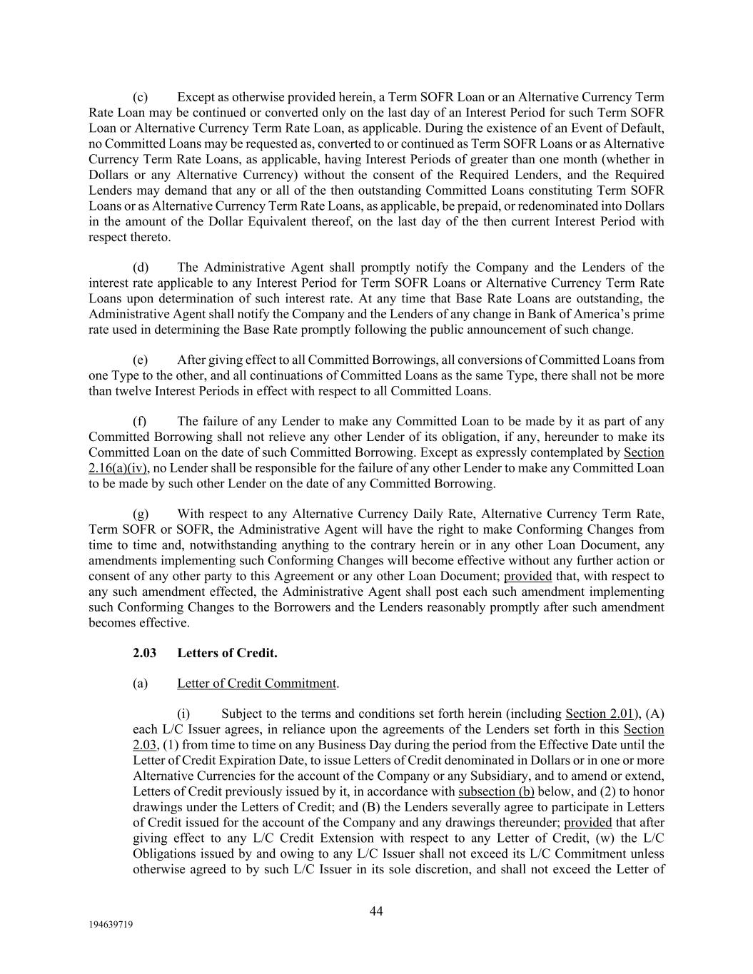 44 194639719 (c) Except as otherwise provided herein, a Term SOFR Loan or an Alternative Currency Term Rate Loan may be continued or converted only on the last day of an Interest Period for such Term SOFR Loan or Alternative Currency Term Rate Loan, as applicable. During the existence of an Event of Default, no Committed Loans may be requested as, converted to or continued as Term SOFR Loans or as Alternative Currency Term Rate Loans, as applicable, having Interest Periods of greater than one month (whether in Dollars or any Alternative Currency) without the consent of the Required Lenders, and the Required Lenders may demand that any or all of the then outstanding Committed Loans constituting Term SOFR Loans or as Alternative Currency Term Rate Loans, as applicable, be prepaid, or redenominated into Dollars in the amount of the Dollar Equivalent thereof, on the last day of the then current Interest Period with respect thereto. (d) The Administrative Agent shall promptly notify the Company and the Lenders of the interest rate applicable to any Interest Period for Term SOFR Loans or Alternative Currency Term Rate Loans upon determination of such interest rate. At any time that Base Rate Loans are outstanding, the Administrative Agent shall notify the Company and the Lenders of any change in Bank of America’s prime rate used in determining the Base Rate promptly following the public announcement of such change. (e) After giving effect to all Committed Borrowings, all conversions of Committed Loans from one Type to the other, and all continuations of Committed Loans as the same Type, there shall not be more than twelve Interest Periods in effect with respect to all Committed Loans. (f) The failure of any Lender to make any Committed Loan to be made by it as part of any Committed Borrowing shall not relieve any other Lender of its obligation, if any, hereunder to make its Committed Loan on the date of such Committed Borrowing. Except as expressly contemplated by Section 2.16(a)(iv), no Lender shall be responsible for the failure of any other Lender to make any Committed Loan to be made by such other Lender on the date of any Committed Borrowing. (g) With respect to any Alternative Currency Daily Rate, Alternative Currency Term Rate, Term SOFR or SOFR, the Administrative Agent will have the right to make Conforming Changes from time to time and, notwithstanding anything to the contrary herein or in any other Loan Document, any amendments implementing such Conforming Changes will become effective without any further action or consent of any other party to this Agreement or any other Loan Document; provided that, with respect to any such amendment effected, the Administrative Agent shall post each such amendment implementing such Conforming Changes to the Borrowers and the Lenders reasonably promptly after such amendment becomes effective. 2.03 Letters of Credit. (a) Letter of Credit Commitment. (i) Subject to the terms and conditions set forth herein (including Section 2.01), (A) each L/C Issuer agrees, in reliance upon the agreements of the Lenders set forth in this Section 2.03, (1) from time to time on any Business Day during the period from the Effective Date until the Letter of Credit Expiration Date, to issue Letters of Credit denominated in Dollars or in one or more Alternative Currencies for the account of the Company or any Subsidiary, and to amend or extend, Letters of Credit previously issued by it, in accordance with subsection (b) below, and (2) to honor drawings under the Letters of Credit; and (B) the Lenders severally agree to participate in Letters of Credit issued for the account of the Company and any drawings thereunder; provided that after giving effect to any L/C Credit Extension with respect to any Letter of Credit, (w) the L/C Obligations issued by and owing to any L/C Issuer shall not exceed its L/C Commitment unless otherwise agreed to by such L/C Issuer in its sole discretion, and shall not exceed the Letter of
