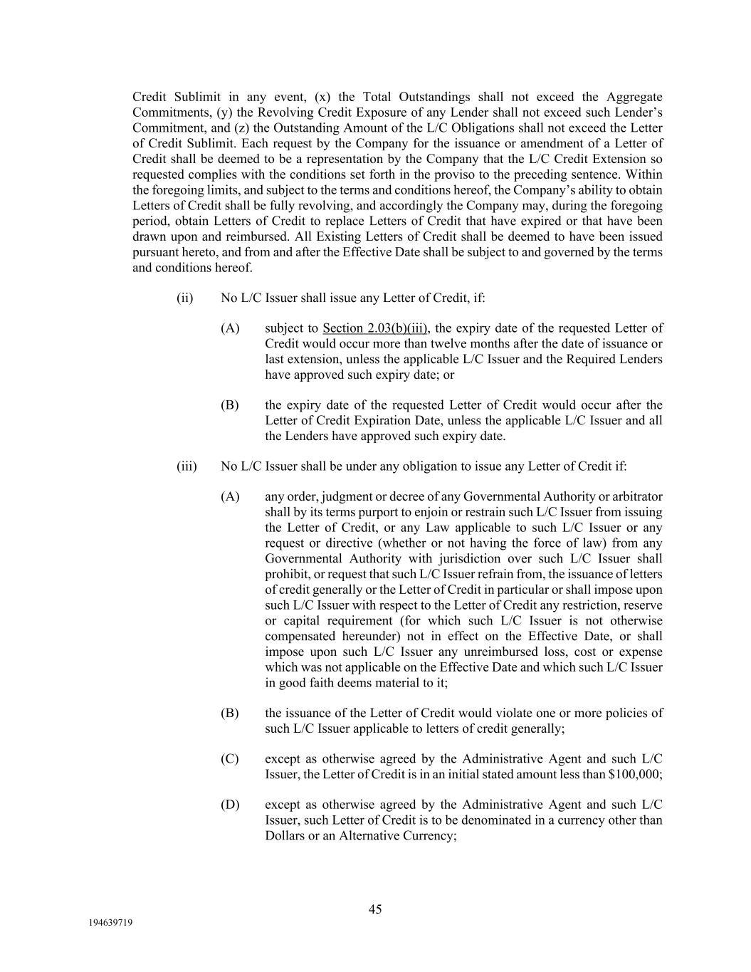 45 194639719 Credit Sublimit in any event, (x) the Total Outstandings shall not exceed the Aggregate Commitments, (y) the Revolving Credit Exposure of any Lender shall not exceed such Lender’s Commitment, and (z) the Outstanding Amount of the L/C Obligations shall not exceed the Letter of Credit Sublimit. Each request by the Company for the issuance or amendment of a Letter of Credit shall be deemed to be a representation by the Company that the L/C Credit Extension so requested complies with the conditions set forth in the proviso to the preceding sentence. Within the foregoing limits, and subject to the terms and conditions hereof, the Company’s ability to obtain Letters of Credit shall be fully revolving, and accordingly the Company may, during the foregoing period, obtain Letters of Credit to replace Letters of Credit that have expired or that have been drawn upon and reimbursed. All Existing Letters of Credit shall be deemed to have been issued pursuant hereto, and from and after the Effective Date shall be subject to and governed by the terms and conditions hereof. (ii) No L/C Issuer shall issue any Letter of Credit, if: (A) subject to Section 2.03(b)(iii), the expiry date of the requested Letter of Credit would occur more than twelve months after the date of issuance or last extension, unless the applicable L/C Issuer and the Required Lenders have approved such expiry date; or (B) the expiry date of the requested Letter of Credit would occur after the Letter of Credit Expiration Date, unless the applicable L/C Issuer and all the Lenders have approved such expiry date. (iii) No L/C Issuer shall be under any obligation to issue any Letter of Credit if: (A) any order, judgment or decree of any Governmental Authority or arbitrator shall by its terms purport to enjoin or restrain such L/C Issuer from issuing the Letter of Credit, or any Law applicable to such L/C Issuer or any request or directive (whether or not having the force of law) from any Governmental Authority with jurisdiction over such L/C Issuer shall prohibit, or request that such L/C Issuer refrain from, the issuance of letters of credit generally or the Letter of Credit in particular or shall impose upon such L/C Issuer with respect to the Letter of Credit any restriction, reserve or capital requirement (for which such L/C Issuer is not otherwise compensated hereunder) not in effect on the Effective Date, or shall impose upon such L/C Issuer any unreimbursed loss, cost or expense which was not applicable on the Effective Date and which such L/C Issuer in good faith deems material to it; (B) the issuance of the Letter of Credit would violate one or more policies of such L/C Issuer applicable to letters of credit generally; (C) except as otherwise agreed by the Administrative Agent and such L/C Issuer, the Letter of Credit is in an initial stated amount less than $100,000; (D) except as otherwise agreed by the Administrative Agent and such L/C Issuer, such Letter of Credit is to be denominated in a currency other than Dollars or an Alternative Currency;