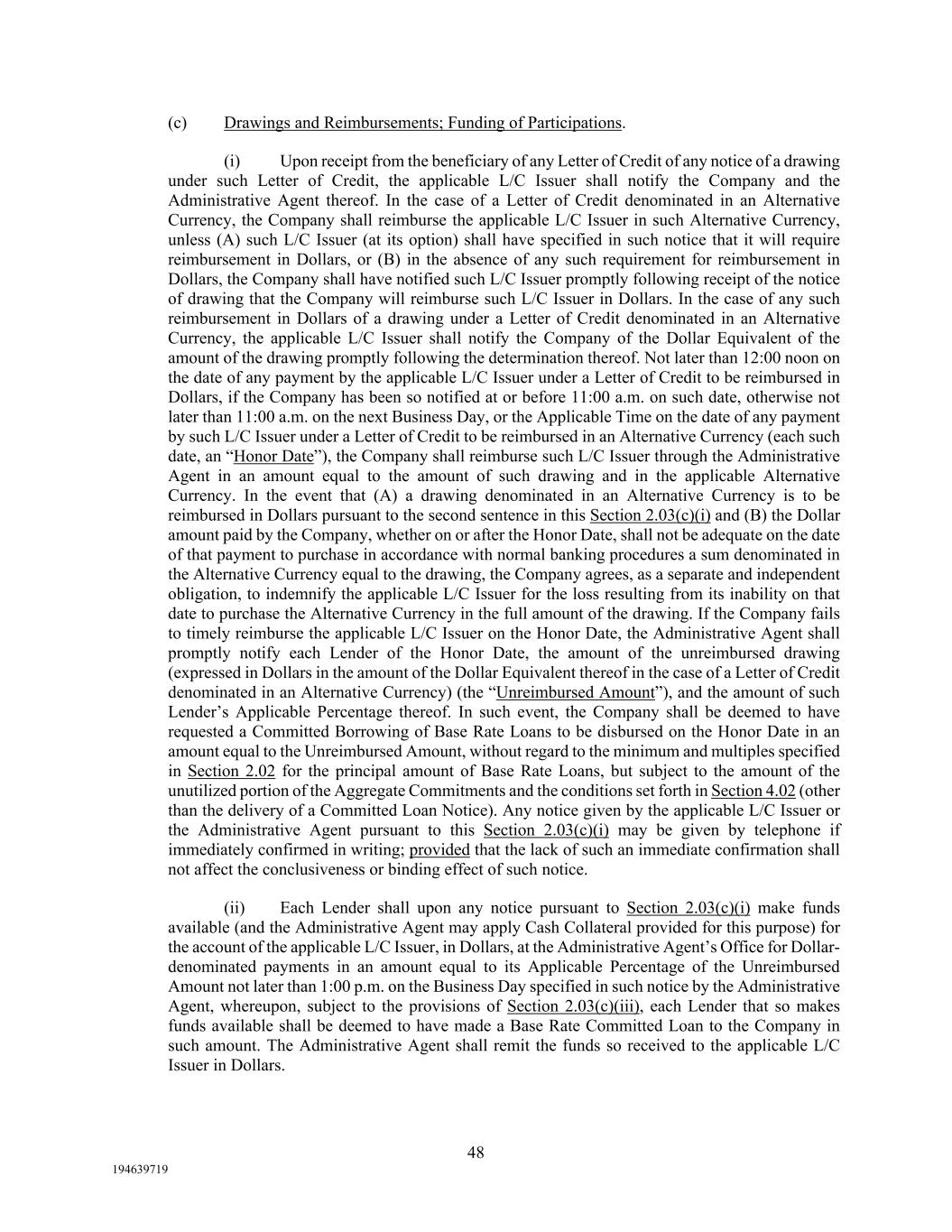 48 194639719 (c) Drawings and Reimbursements; Funding of Participations. (i) Upon receipt from the beneficiary of any Letter of Credit of any notice of a drawing under such Letter of Credit, the applicable L/C Issuer shall notify the Company and the Administrative Agent thereof. In the case of a Letter of Credit denominated in an Alternative Currency, the Company shall reimburse the applicable L/C Issuer in such Alternative Currency, unless (A) such L/C Issuer (at its option) shall have specified in such notice that it will require reimbursement in Dollars, or (B) in the absence of any such requirement for reimbursement in Dollars, the Company shall have notified such L/C Issuer promptly following receipt of the notice of drawing that the Company will reimburse such L/C Issuer in Dollars. In the case of any such reimbursement in Dollars of a drawing under a Letter of Credit denominated in an Alternative Currency, the applicable L/C Issuer shall notify the Company of the Dollar Equivalent of the amount of the drawing promptly following the determination thereof. Not later than 12:00 noon on the date of any payment by the applicable L/C Issuer under a Letter of Credit to be reimbursed in Dollars, if the Company has been so notified at or before 11:00 a.m. on such date, otherwise not later than 11:00 a.m. on the next Business Day, or the Applicable Time on the date of any payment by such L/C Issuer under a Letter of Credit to be reimbursed in an Alternative Currency (each such date, an “Honor Date”), the Company shall reimburse such L/C Issuer through the Administrative Agent in an amount equal to the amount of such drawing and in the applicable Alternative Currency. In the event that (A) a drawing denominated in an Alternative Currency is to be reimbursed in Dollars pursuant to the second sentence in this Section 2.03(c)(i) and (B) the Dollar amount paid by the Company, whether on or after the Honor Date, shall not be adequate on the date of that payment to purchase in accordance with normal banking procedures a sum denominated in the Alternative Currency equal to the drawing, the Company agrees, as a separate and independent obligation, to indemnify the applicable L/C Issuer for the loss resulting from its inability on that date to purchase the Alternative Currency in the full amount of the drawing. If the Company fails to timely reimburse the applicable L/C Issuer on the Honor Date, the Administrative Agent shall promptly notify each Lender of the Honor Date, the amount of the unreimbursed drawing (expressed in Dollars in the amount of the Dollar Equivalent thereof in the case of a Letter of Credit denominated in an Alternative Currency) (the “Unreimbursed Amount”), and the amount of such Lender’s Applicable Percentage thereof. In such event, the Company shall be deemed to have requested a Committed Borrowing of Base Rate Loans to be disbursed on the Honor Date in an amount equal to the Unreimbursed Amount, without regard to the minimum and multiples specified in Section 2.02 for the principal amount of Base Rate Loans, but subject to the amount of the unutilized portion of the Aggregate Commitments and the conditions set forth in Section 4.02 (other than the delivery of a Committed Loan Notice). Any notice given by the applicable L/C Issuer or the Administrative Agent pursuant to this Section 2.03(c)(i) may be given by telephone if immediately confirmed in writing; provided that the lack of such an immediate confirmation shall not affect the conclusiveness or binding effect of such notice. (ii) Each Lender shall upon any notice pursuant to Section 2.03(c)(i) make funds available (and the Administrative Agent may apply Cash Collateral provided for this purpose) for the account of the applicable L/C Issuer, in Dollars, at the Administrative Agent’s Office for Dollar- denominated payments in an amount equal to its Applicable Percentage of the Unreimbursed Amount not later than 1:00 p.m. on the Business Day specified in such notice by the Administrative Agent, whereupon, subject to the provisions of Section 2.03(c)(iii), each Lender that so makes funds available shall be deemed to have made a Base Rate Committed Loan to the Company in such amount. The Administrative Agent shall remit the funds so received to the applicable L/C Issuer in Dollars.