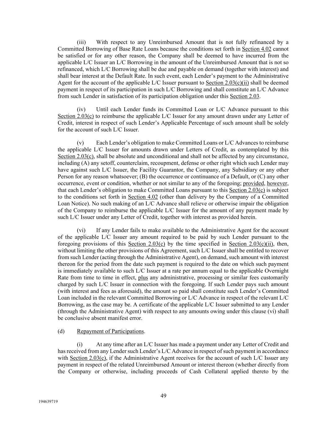 49 194639719 (iii) With respect to any Unreimbursed Amount that is not fully refinanced by a Committed Borrowing of Base Rate Loans because the conditions set forth in Section 4.02 cannot be satisfied or for any other reason, the Company shall be deemed to have incurred from the applicable L/C Issuer an L/C Borrowing in the amount of the Unreimbursed Amount that is not so refinanced, which L/C Borrowing shall be due and payable on demand (together with interest) and shall bear interest at the Default Rate. In such event, each Lender’s payment to the Administrative Agent for the account of the applicable L/C Issuer pursuant to Section 2.03(c)(ii) shall be deemed payment in respect of its participation in such L/C Borrowing and shall constitute an L/C Advance from such Lender in satisfaction of its participation obligation under this Section 2.03. (iv) Until each Lender funds its Committed Loan or L/C Advance pursuant to this Section 2.03(c) to reimburse the applicable L/C Issuer for any amount drawn under any Letter of Credit, interest in respect of such Lender’s Applicable Percentage of such amount shall be solely for the account of such L/C Issuer. (v) Each Lender’s obligation to make Committed Loans or L/C Advances to reimburse the applicable L/C Issuer for amounts drawn under Letters of Credit, as contemplated by this Section 2.03(c), shall be absolute and unconditional and shall not be affected by any circumstance, including (A) any setoff, counterclaim, recoupment, defense or other right which such Lender may have against such L/C Issuer, the Facility Guarantor, the Company, any Subsidiary or any other Person for any reason whatsoever; (B) the occurrence or continuance of a Default, or (C) any other occurrence, event or condition, whether or not similar to any of the foregoing; provided, however, that each Lender’s obligation to make Committed Loans pursuant to this Section 2.03(c) is subject to the conditions set forth in Section 4.02 (other than delivery by the Company of a Committed Loan Notice). No such making of an L/C Advance shall relieve or otherwise impair the obligation of the Company to reimburse the applicable L/C Issuer for the amount of any payment made by such L/C Issuer under any Letter of Credit, together with interest as provided herein. (vi) If any Lender fails to make available to the Administrative Agent for the account of the applicable L/C Issuer any amount required to be paid by such Lender pursuant to the foregoing provisions of this Section 2.03(c) by the time specified in Section 2.03(c)(ii), then, without limiting the other provisions of this Agreement, such L/C Issuer shall be entitled to recover from such Lender (acting through the Administrative Agent), on demand, such amount with interest thereon for the period from the date such payment is required to the date on which such payment is immediately available to such L/C Issuer at a rate per annum equal to the applicable Overnight Rate from time to time in effect, plus any administrative, processing or similar fees customarily charged by such L/C Issuer in connection with the foregoing. If such Lender pays such amount (with interest and fees as aforesaid), the amount so paid shall constitute such Lender’s Committed Loan included in the relevant Committed Borrowing or L/C Advance in respect of the relevant L/C Borrowing, as the case may be. A certificate of the applicable L/C Issuer submitted to any Lender (through the Administrative Agent) with respect to any amounts owing under this clause (vi) shall be conclusive absent manifest error. (d) Repayment of Participations. (i) At any time after an L/C Issuer has made a payment under any Letter of Credit and has received from any Lender such Lender’s L/C Advance in respect of such payment in accordance with Section 2.03(c), if the Administrative Agent receives for the account of such L/C Issuer any payment in respect of the related Unreimbursed Amount or interest thereon (whether directly from the Company or otherwise, including proceeds of Cash Collateral applied thereto by the