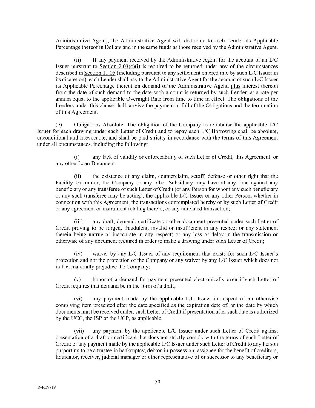 50 194639719 Administrative Agent), the Administrative Agent will distribute to such Lender its Applicable Percentage thereof in Dollars and in the same funds as those received by the Administrative Agent. (ii) If any payment received by the Administrative Agent for the account of an L/C Issuer pursuant to Section 2.03(c)(i) is required to be returned under any of the circumstances described in Section 11.05 (including pursuant to any settlement entered into by such L/C Issuer in its discretion), each Lender shall pay to the Administrative Agent for the account of such L/C Issuer its Applicable Percentage thereof on demand of the Administrative Agent, plus interest thereon from the date of such demand to the date such amount is returned by such Lender, at a rate per annum equal to the applicable Overnight Rate from time to time in effect. The obligations of the Lenders under this clause shall survive the payment in full of the Obligations and the termination of this Agreement. (e) Obligations Absolute. The obligation of the Company to reimburse the applicable L/C Issuer for each drawing under each Letter of Credit and to repay each L/C Borrowing shall be absolute, unconditional and irrevocable, and shall be paid strictly in accordance with the terms of this Agreement under all circumstances, including the following: (i) any lack of validity or enforceability of such Letter of Credit, this Agreement, or any other Loan Document; (ii) the existence of any claim, counterclaim, setoff, defense or other right that the Facility Guarantor, the Company or any other Subsidiary may have at any time against any beneficiary or any transferee of such Letter of Credit (or any Person for whom any such beneficiary or any such transferee may be acting), the applicable L/C Issuer or any other Person, whether in connection with this Agreement, the transactions contemplated hereby or by such Letter of Credit or any agreement or instrument relating thereto, or any unrelated transaction; (iii) any draft, demand, certificate or other document presented under such Letter of Credit proving to be forged, fraudulent, invalid or insufficient in any respect or any statement therein being untrue or inaccurate in any respect; or any loss or delay in the transmission or otherwise of any document required in order to make a drawing under such Letter of Credit; (iv) waiver by any L/C Issuer of any requirement that exists for such L/C Issuer’s protection and not the protection of the Company or any waiver by any L/C Issuer which does not in fact materially prejudice the Company; (v) honor of a demand for payment presented electronically even if such Letter of Credit requires that demand be in the form of a draft; (vi) any payment made by the applicable L/C Issuer in respect of an otherwise complying item presented after the date specified as the expiration date of, or the date by which documents must be received under, such Letter of Credit if presentation after such date is authorized by the UCC, the ISP or the UCP, as applicable; (vii) any payment by the applicable L/C Issuer under such Letter of Credit against presentation of a draft or certificate that does not strictly comply with the terms of such Letter of Credit; or any payment made by the applicable L/C Issuer under such Letter of Credit to any Person purporting to be a trustee in bankruptcy, debtor-in-possession, assignee for the benefit of creditors, liquidator, receiver, judicial manager or other representative of or successor to any beneficiary or