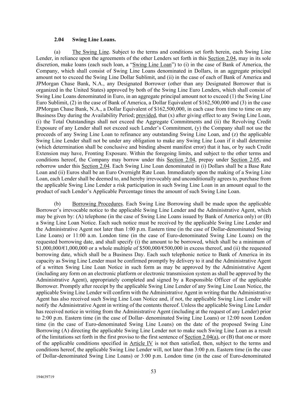 53 194639719 2.04 Swing Line Loans. (a) The Swing Line. Subject to the terms and conditions set forth herein, each Swing Line Lender, in reliance upon the agreements of the other Lenders set forth in this Section 2.04, may in its sole discretion, make loans (each such loan, a “Swing Line Loan”) to (i) in the case of Bank of America, the Company, which shall consist of Swing Line Loans denominated in Dollars, in an aggregate principal amount not to exceed the Swing Line Dollar Sublimit, and (ii) in the case of each of Bank of America and JPMorgan Chase Bank, N.A., any Designated Borrower (other than any Designated Borrower that is organized in the United States) approved by both of the Swing Line Euro Lenders, which shall consist of Swing Line Loans denominated in Euro, in an aggregate principal amount not to exceed (1) the Swing Line Euro Sublimit, (2) in the case of Bank of America, a Dollar Equivalent of $162,500,000 and (3) in the case JPMorgan Chase Bank, N.A., a Dollar Equivalent of $162,500,000, in each case from time to time on any Business Day during the Availability Period; provided, that (x) after giving effect to any Swing Line Loan, (i) the Total Outstandings shall not exceed the Aggregate Commitments and (ii) the Revolving Credit Exposure of any Lender shall not exceed such Lender’s Commitment, (y) the Company shall not use the proceeds of any Swing Line Loan to refinance any outstanding Swing Line Loan, and (z) the applicable Swing Line Lender shall not be under any obligation to make any Swing Line Loan if it shall determine (which determination shall be conclusive and binding absent manifest error) that it has, or by such Credit Extension may have, Fronting Exposure. Within the foregoing limits, and subject to the other terms and conditions hereof, the Company may borrow under this Section 2.04, prepay under Section 2.05, and reborrow under this Section 2.04. Each Swing Line Loan denominated in (i) Dollars shall be a Base Rate Loan and (ii) Euros shall be an Euro Overnight Rate Loan. Immediately upon the making of a Swing Line Loan, each Lender shall be deemed to, and hereby irrevocably and unconditionally agrees to, purchase from the applicable Swing Line Lender a risk participation in such Swing Line Loan in an amount equal to the product of such Lender’s Applicable Percentage times the amount of such Swing Line Loan. (b) Borrowing Procedures. Each Swing Line Borrowing shall be made upon the applicable Borrower’s irrevocable notice to the applicable Swing Line Lender and the Administrative Agent, which may be given by: (A) telephone (in the case of Swing Line Loans issued by Bank of America only) or (B) a Swing Line Loan Notice. Each such notice must be received by the applicable Swing Line Lender and the Administrative Agent not later than 1:00 p.m. Eastern time (in the case of Dollar-denominated Swing Line Loans) or 11:00 a.m. London time (in the case of Euro-denominated Swing Line Loans) on the requested borrowing date, and shall specify (i) the amount to be borrowed, which shall be a minimum of $1,000,000/€1,000,000 or a whole multiple of $500,000/€500,000 in excess thereof, and (ii) the requested borrowing date, which shall be a Business Day. Each such telephonic notice to Bank of America in its capacity as Swing Line Lender must be confirmed promptly by delivery to it and the Administrative Agent of a written Swing Line Loan Notice in such form as may be approved by the Administrative Agent (including any form on an electronic platform or electronic transmission system as shall be approved by the Administrative Agent), appropriately completed and signed by a Responsible Officer of the applicable Borrower. Promptly after receipt by the applicable Swing Line Lender of any Swing Line Loan Notice, the applicable Swing Line Lender will confirm with the Administrative Agent in writing that the Administrative Agent has also received such Swing Line Loan Notice and, if not, the applicable Swing Line Lender will notify the Administrative Agent in writing of the contents thereof. Unless the applicable Swing Line Lender has received notice in writing from the Administrative Agent (including at the request of any Lender) prior to 2:00 p.m. Eastern time (in the case of Dollar- denominated Swing Line Loans) or 12:00 noon London time (in the case of Euro-denominated Swing Line Loans) on the date of the proposed Swing Line Borrowing (A) directing the applicable Swing Line Lender not to make such Swing Line Loan as a result of the limitations set forth in the first proviso to the first sentence of Section 2.04(a), or (B) that one or more of the applicable conditions specified in Article IV is not then satisfied, then, subject to the terms and conditions hereof, the applicable Swing Line Lender will, not later than 3:00 p.m. Eastern time (in the case of Dollar-denominated Swing Line Loans) or 3:00 p.m. London time (in the case of Euro-denominated