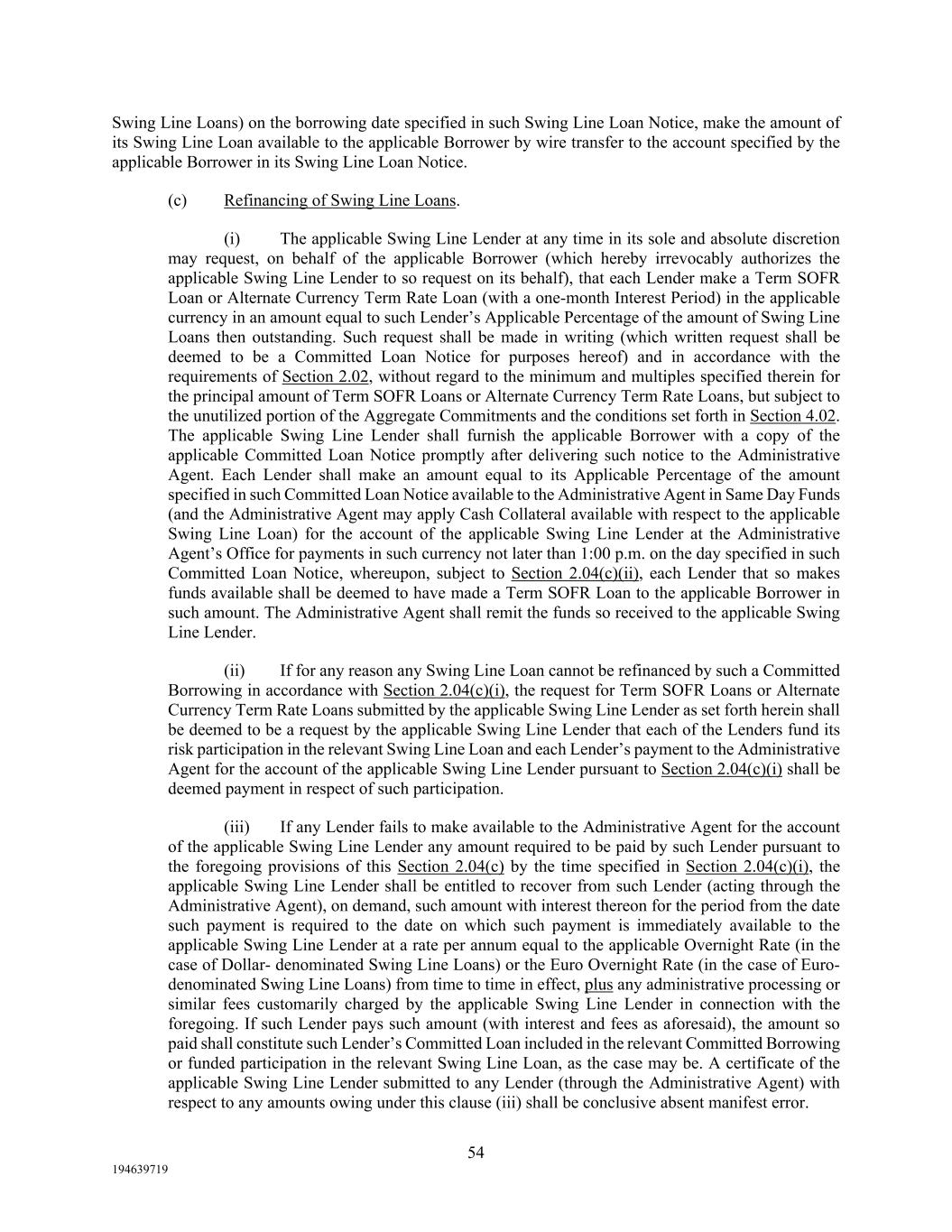 54 194639719 Swing Line Loans) on the borrowing date specified in such Swing Line Loan Notice, make the amount of its Swing Line Loan available to the applicable Borrower by wire transfer to the account specified by the applicable Borrower in its Swing Line Loan Notice. (c) Refinancing of Swing Line Loans. (i) The applicable Swing Line Lender at any time in its sole and absolute discretion may request, on behalf of the applicable Borrower (which hereby irrevocably authorizes the applicable Swing Line Lender to so request on its behalf), that each Lender make a Term SOFR Loan or Alternate Currency Term Rate Loan (with a one-month Interest Period) in the applicable currency in an amount equal to such Lender’s Applicable Percentage of the amount of Swing Line Loans then outstanding. Such request shall be made in writing (which written request shall be deemed to be a Committed Loan Notice for purposes hereof) and in accordance with the requirements of Section 2.02, without regard to the minimum and multiples specified therein for the principal amount of Term SOFR Loans or Alternate Currency Term Rate Loans, but subject to the unutilized portion of the Aggregate Commitments and the conditions set forth in Section 4.02. The applicable Swing Line Lender shall furnish the applicable Borrower with a copy of the applicable Committed Loan Notice promptly after delivering such notice to the Administrative Agent. Each Lender shall make an amount equal to its Applicable Percentage of the amount specified in such Committed Loan Notice available to the Administrative Agent in Same Day Funds (and the Administrative Agent may apply Cash Collateral available with respect to the applicable Swing Line Loan) for the account of the applicable Swing Line Lender at the Administrative Agent’s Office for payments in such currency not later than 1:00 p.m. on the day specified in such Committed Loan Notice, whereupon, subject to Section 2.04(c)(ii), each Lender that so makes funds available shall be deemed to have made a Term SOFR Loan to the applicable Borrower in such amount. The Administrative Agent shall remit the funds so received to the applicable Swing Line Lender. (ii) If for any reason any Swing Line Loan cannot be refinanced by such a Committed Borrowing in accordance with Section 2.04(c)(i), the request for Term SOFR Loans or Alternate Currency Term Rate Loans submitted by the applicable Swing Line Lender as set forth herein shall be deemed to be a request by the applicable Swing Line Lender that each of the Lenders fund its risk participation in the relevant Swing Line Loan and each Lender’s payment to the Administrative Agent for the account of the applicable Swing Line Lender pursuant to Section 2.04(c)(i) shall be deemed payment in respect of such participation. (iii) If any Lender fails to make available to the Administrative Agent for the account of the applicable Swing Line Lender any amount required to be paid by such Lender pursuant to the foregoing provisions of this Section 2.04(c) by the time specified in Section 2.04(c)(i), the applicable Swing Line Lender shall be entitled to recover from such Lender (acting through the Administrative Agent), on demand, such amount with interest thereon for the period from the date such payment is required to the date on which such payment is immediately available to the applicable Swing Line Lender at a rate per annum equal to the applicable Overnight Rate (in the case of Dollar- denominated Swing Line Loans) or the Euro Overnight Rate (in the case of Euro- denominated Swing Line Loans) from time to time in effect, plus any administrative processing or similar fees customarily charged by the applicable Swing Line Lender in connection with the foregoing. If such Lender pays such amount (with interest and fees as aforesaid), the amount so paid shall constitute such Lender’s Committed Loan included in the relevant Committed Borrowing or funded participation in the relevant Swing Line Loan, as the case may be. A certificate of the applicable Swing Line Lender submitted to any Lender (through the Administrative Agent) with respect to any amounts owing under this clause (iii) shall be conclusive absent manifest error.