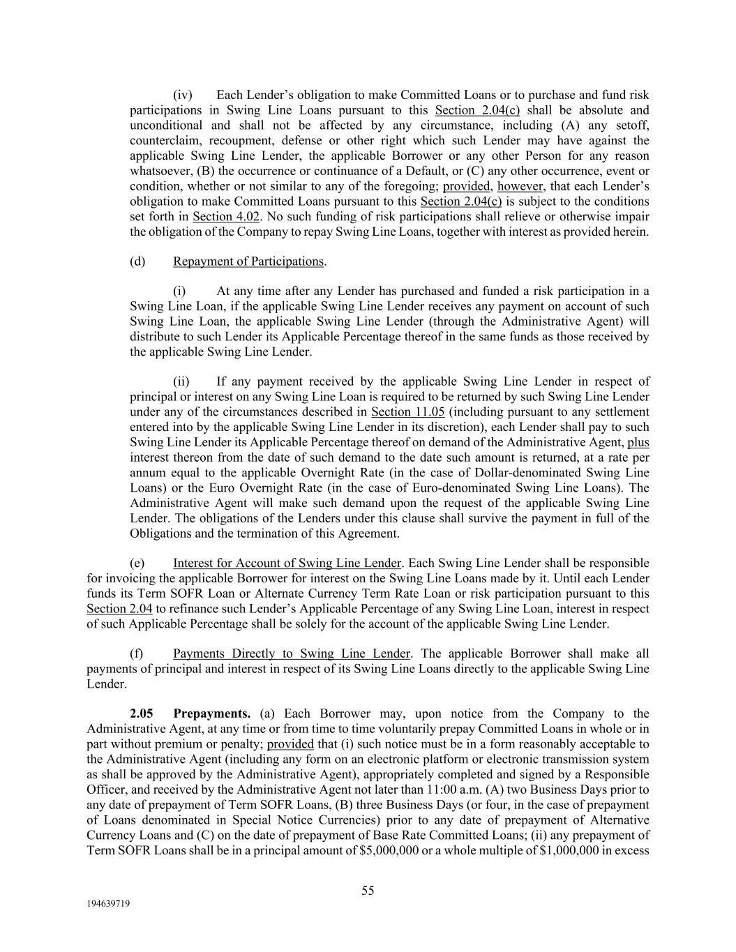 55 194639719 (iv) Each Lender’s obligation to make Committed Loans or to purchase and fund risk participations in Swing Line Loans pursuant to this Section 2.04(c) shall be absolute and unconditional and shall not be affected by any circumstance, including (A) any setoff, counterclaim, recoupment, defense or other right which such Lender may have against the applicable Swing Line Lender, the applicable Borrower or any other Person for any reason whatsoever, (B) the occurrence or continuance of a Default, or (C) any other occurrence, event or condition, whether or not similar to any of the foregoing; provided, however, that each Lender’s obligation to make Committed Loans pursuant to this Section 2.04(c) is subject to the conditions set forth in Section 4.02. No such funding of risk participations shall relieve or otherwise impair the obligation of the Company to repay Swing Line Loans, together with interest as provided herein. (d) Repayment of Participations. (i) At any time after any Lender has purchased and funded a risk participation in a Swing Line Loan, if the applicable Swing Line Lender receives any payment on account of such Swing Line Loan, the applicable Swing Line Lender (through the Administrative Agent) will distribute to such Lender its Applicable Percentage thereof in the same funds as those received by the applicable Swing Line Lender. (ii) If any payment received by the applicable Swing Line Lender in respect of principal or interest on any Swing Line Loan is required to be returned by such Swing Line Lender under any of the circumstances described in Section 11.05 (including pursuant to any settlement entered into by the applicable Swing Line Lender in its discretion), each Lender shall pay to such Swing Line Lender its Applicable Percentage thereof on demand of the Administrative Agent, plus interest thereon from the date of such demand to the date such amount is returned, at a rate per annum equal to the applicable Overnight Rate (in the case of Dollar-denominated Swing Line Loans) or the Euro Overnight Rate (in the case of Euro-denominated Swing Line Loans). The Administrative Agent will make such demand upon the request of the applicable Swing Line Lender. The obligations of the Lenders under this clause shall survive the payment in full of the Obligations and the termination of this Agreement. (e) Interest for Account of Swing Line Lender. Each Swing Line Lender shall be responsible for invoicing the applicable Borrower for interest on the Swing Line Loans made by it. Until each Lender funds its Term SOFR Loan or Alternate Currency Term Rate Loan or risk participation pursuant to this Section 2.04 to refinance such Lender’s Applicable Percentage of any Swing Line Loan, interest in respect of such Applicable Percentage shall be solely for the account of the applicable Swing Line Lender. (f) Payments Directly to Swing Line Lender. The applicable Borrower shall make all payments of principal and interest in respect of its Swing Line Loans directly to the applicable Swing Line Lender. 2.05 Prepayments. (a) Each Borrower may, upon notice from the Company to the Administrative Agent, at any time or from time to time voluntarily prepay Committed Loans in whole or in part without premium or penalty; provided that (i) such notice must be in a form reasonably acceptable to the Administrative Agent (including any form on an electronic platform or electronic transmission system as shall be approved by the Administrative Agent), appropriately completed and signed by a Responsible Officer, and received by the Administrative Agent not later than 11:00 a.m. (A) two Business Days prior to any date of prepayment of Term SOFR Loans, (B) three Business Days (or four, in the case of prepayment of Loans denominated in Special Notice Currencies) prior to any date of prepayment of Alternative Currency Loans and (C) on the date of prepayment of Base Rate Committed Loans; (ii) any prepayment of Term SOFR Loans shall be in a principal amount of $5,000,000 or a whole multiple of $1,000,000 in excess