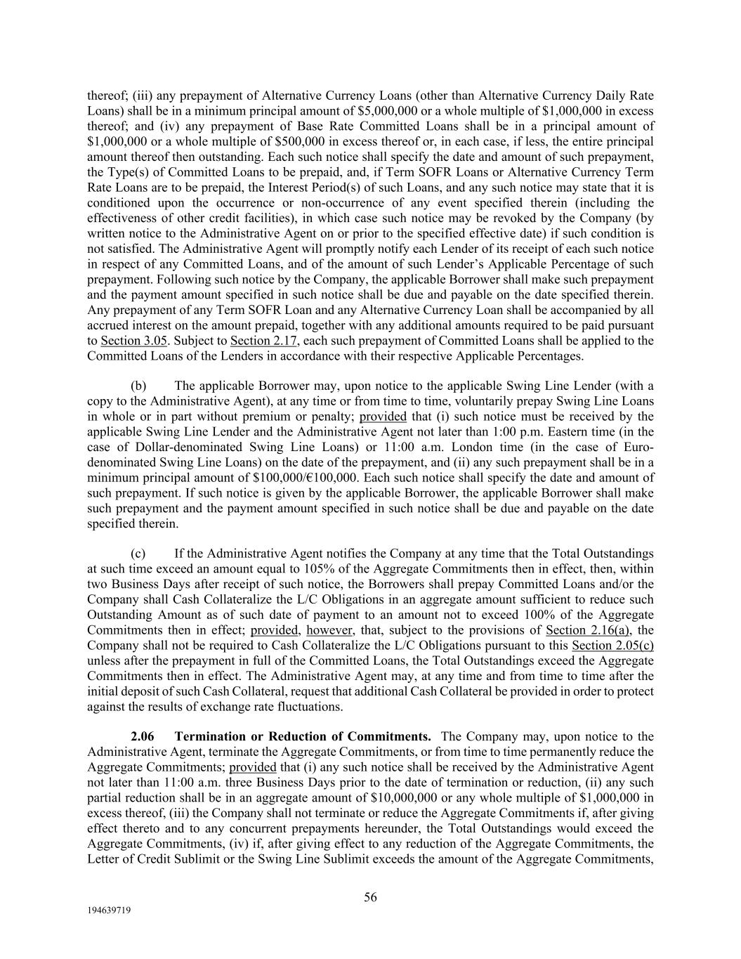 56 194639719 thereof; (iii) any prepayment of Alternative Currency Loans (other than Alternative Currency Daily Rate Loans) shall be in a minimum principal amount of $5,000,000 or a whole multiple of $1,000,000 in excess thereof; and (iv) any prepayment of Base Rate Committed Loans shall be in a principal amount of $1,000,000 or a whole multiple of $500,000 in excess thereof or, in each case, if less, the entire principal amount thereof then outstanding. Each such notice shall specify the date and amount of such prepayment, the Type(s) of Committed Loans to be prepaid, and, if Term SOFR Loans or Alternative Currency Term Rate Loans are to be prepaid, the Interest Period(s) of such Loans, and any such notice may state that it is conditioned upon the occurrence or non-occurrence of any event specified therein (including the effectiveness of other credit facilities), in which case such notice may be revoked by the Company (by written notice to the Administrative Agent on or prior to the specified effective date) if such condition is not satisfied. The Administrative Agent will promptly notify each Lender of its receipt of each such notice in respect of any Committed Loans, and of the amount of such Lender’s Applicable Percentage of such prepayment. Following such notice by the Company, the applicable Borrower shall make such prepayment and the payment amount specified in such notice shall be due and payable on the date specified therein. Any prepayment of any Term SOFR Loan and any Alternative Currency Loan shall be accompanied by all accrued interest on the amount prepaid, together with any additional amounts required to be paid pursuant to Section 3.05. Subject to Section 2.17, each such prepayment of Committed Loans shall be applied to the Committed Loans of the Lenders in accordance with their respective Applicable Percentages. (b) The applicable Borrower may, upon notice to the applicable Swing Line Lender (with a copy to the Administrative Agent), at any time or from time to time, voluntarily prepay Swing Line Loans in whole or in part without premium or penalty; provided that (i) such notice must be received by the applicable Swing Line Lender and the Administrative Agent not later than 1:00 p.m. Eastern time (in the case of Dollar-denominated Swing Line Loans) or 11:00 a.m. London time (in the case of Euro- denominated Swing Line Loans) on the date of the prepayment, and (ii) any such prepayment shall be in a minimum principal amount of $100,000/€100,000. Each such notice shall specify the date and amount of such prepayment. If such notice is given by the applicable Borrower, the applicable Borrower shall make such prepayment and the payment amount specified in such notice shall be due and payable on the date specified therein. (c) If the Administrative Agent notifies the Company at any time that the Total Outstandings at such time exceed an amount equal to 105% of the Aggregate Commitments then in effect, then, within two Business Days after receipt of such notice, the Borrowers shall prepay Committed Loans and/or the Company shall Cash Collateralize the L/C Obligations in an aggregate amount sufficient to reduce such Outstanding Amount as of such date of payment to an amount not to exceed 100% of the Aggregate Commitments then in effect; provided, however, that, subject to the provisions of Section 2.16(a), the Company shall not be required to Cash Collateralize the L/C Obligations pursuant to this Section 2.05(c) unless after the prepayment in full of the Committed Loans, the Total Outstandings exceed the Aggregate Commitments then in effect. The Administrative Agent may, at any time and from time to time after the initial deposit of such Cash Collateral, request that additional Cash Collateral be provided in order to protect against the results of exchange rate fluctuations. 2.06 Termination or Reduction of Commitments. The Company may, upon notice to the Administrative Agent, terminate the Aggregate Commitments, or from time to time permanently reduce the Aggregate Commitments; provided that (i) any such notice shall be received by the Administrative Agent not later than 11:00 a.m. three Business Days prior to the date of termination or reduction, (ii) any such partial reduction shall be in an aggregate amount of $10,000,000 or any whole multiple of $1,000,000 in excess thereof, (iii) the Company shall not terminate or reduce the Aggregate Commitments if, after giving effect thereto and to any concurrent prepayments hereunder, the Total Outstandings would exceed the Aggregate Commitments, (iv) if, after giving effect to any reduction of the Aggregate Commitments, the Letter of Credit Sublimit or the Swing Line Sublimit exceeds the amount of the Aggregate Commitments,