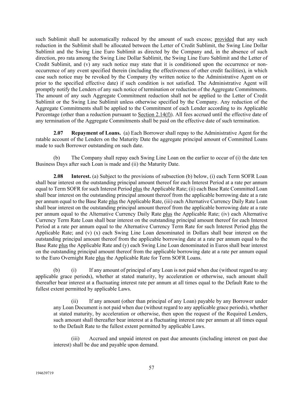 57 194639719 such Sublimit shall be automatically reduced by the amount of such excess; provided that any such reduction in the Sublimit shall be allocated between the Letter of Credit Sublimit, the Swing Line Dollar Sublimit and the Swing Line Euro Sublimit as directed by the Company and, in the absence of such direction, pro rata among the Swing Line Dollar Sublimit, the Swing Line Euro Sublimit and the Letter of Credit Sublimit, and (v) any such notice may state that it is conditioned upon the occurrence or non- occurrence of any event specified therein (including the effectiveness of other credit facilities), in which case such notice may be revoked by the Company (by written notice to the Administrative Agent on or prior to the specified effective date) if such condition is not satisfied. The Administrative Agent will promptly notify the Lenders of any such notice of termination or reduction of the Aggregate Commitments. The amount of any such Aggregate Commitment reduction shall not be applied to the Letter of Credit Sublimit or the Swing Line Sublimit unless otherwise specified by the Company. Any reduction of the Aggregate Commitments shall be applied to the Commitment of each Lender according to its Applicable Percentage (other than a reduction pursuant to Section 2.14(f)). All fees accrued until the effective date of any termination of the Aggregate Commitments shall be paid on the effective date of such termination. 2.07 Repayment of Loans. (a) Each Borrower shall repay to the Administrative Agent for the ratable account of the Lenders on the Maturity Date the aggregate principal amount of Committed Loans made to such Borrower outstanding on such date. (b) The Company shall repay each Swing Line Loan on the earlier to occur of (i) the date ten Business Days after such Loan is made and (ii) the Maturity Date. 2.08 Interest. (a) Subject to the provisions of subsection (b) below, (i) each Term SOFR Loan shall bear interest on the outstanding principal amount thereof for each Interest Period at a rate per annum equal to Term SOFR for such Interest Period plus the Applicable Rate; (ii) each Base Rate Committed Loan shall bear interest on the outstanding principal amount thereof from the applicable borrowing date at a rate per annum equal to the Base Rate plus the Applicable Rate, (iii) each Alternative Currency Daily Rate Loan shall bear interest on the outstanding principal amount thereof from the applicable borrowing date at a rate per annum equal to the Alternative Currency Daily Rate plus the Applicable Rate; (iv) each Alternative Currency Term Rate Loan shall bear interest on the outstanding principal amount thereof for each Interest Period at a rate per annum equal to the Alternative Currency Term Rate for such Interest Period plus the Applicable Rate; and (v) (x) each Swing Line Loan denominated in Dollars shall bear interest on the outstanding principal amount thereof from the applicable borrowing date at a rate per annum equal to the Base Rate plus the Applicable Rate and (y) each Swing Line Loan denominated in Euros shall bear interest on the outstanding principal amount thereof from the applicable borrowing date at a rate per annum equal to the Euro Overnight Rate plus the Applicable Rate for Term SOFR Loans. (b) (i) If any amount of principal of any Loan is not paid when due (without regard to any applicable grace periods), whether at stated maturity, by acceleration or otherwise, such amount shall thereafter bear interest at a fluctuating interest rate per annum at all times equal to the Default Rate to the fullest extent permitted by applicable Laws. (ii) If any amount (other than principal of any Loan) payable by any Borrower under any Loan Document is not paid when due (without regard to any applicable grace periods), whether at stated maturity, by acceleration or otherwise, then upon the request of the Required Lenders, such amount shall thereafter bear interest at a fluctuating interest rate per annum at all times equal to the Default Rate to the fullest extent permitted by applicable Laws. (iii) Accrued and unpaid interest on past due amounts (including interest on past due interest) shall be due and payable upon demand.