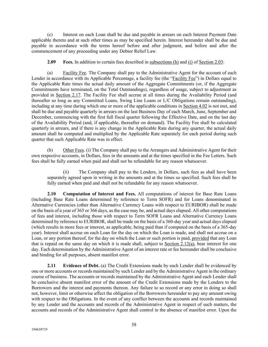 58 194639719 (c) Interest on each Loan shall be due and payable in arrears on each Interest Payment Date applicable thereto and at such other times as may be specified herein. Interest hereunder shall be due and payable in accordance with the terms hereof before and after judgment, and before and after the commencement of any proceeding under any Debtor Relief Law. 2.09 Fees. In addition to certain fees described in subsections (h) and (i) of Section 2.03: (a) Facility Fee. The Company shall pay to the Administrative Agent for the account of each Lender in accordance with its Applicable Percentage, a facility fee (the “Facility Fee”) in Dollars equal to the Applicable Rate times the actual daily amount of the Aggregate Commitments (or, if the Aggregate Commitments have terminated, on the Total Outstandings), regardless of usage, subject to adjustment as provided in Section 2.17. The Facility Fee shall accrue at all times during the Availability Period (and thereafter so long as any Committed Loans, Swing Line Loans or L/C Obligations remain outstanding), including at any time during which one or more of the applicable conditions in Section 4.02 is not met, and shall be due and payable quarterly in arrears on the last Business Day of each March, June, September and December, commencing with the first full fiscal quarter following the Effective Date, and on the last day of the Availability Period (and, if applicable, thereafter on demand). The Facility Fee shall be calculated quarterly in arrears, and if there is any change in the Applicable Rate during any quarter, the actual daily amount shall be computed and multiplied by the Applicable Rate separately for each period during such quarter that such Applicable Rate was in effect. (b) Other Fees. (i) The Company shall pay to the Arrangers and Administrative Agent for their own respective accounts, in Dollars, fees in the amounts and at the times specified in the Fee Letters. Such fees shall be fully earned when paid and shall not be refundable for any reason whatsoever. (ii) The Company shall pay to the Lenders, in Dollars, such fees as shall have been separately agreed upon in writing in the amounts and at the times so specified. Such fees shall be fully earned when paid and shall not be refundable for any reason whatsoever. 2.10 Computation of Interest and Fees. All computations of interest for Base Rate Loans (including Base Rate Loans determined by reference to Term SOFR) and for Loans denominated in Alternative Currencies (other than Alternative Currency Loans with respect to EURIBOR) shall be made on the basis of a year of 365 or 366 days, as the case may be, and actual days elapsed. All other computations of fees and interest, including those with respect to Term SOFR Loans and Alternative Currency Loans determined by reference to EURIBOR, shall be made on the basis of a 360-day year and actual days elapsed (which results in more fees or interest, as applicable, being paid than if computed on the basis of a 365-day year). Interest shall accrue on each Loan for the day on which the Loan is made, and shall not accrue on a Loan, or any portion thereof, for the day on which the Loan or such portion is paid, provided that any Loan that is repaid on the same day on which it is made shall, subject to Section 2.12(a), bear interest for one day. Each determination by the Administrative Agent of an interest rate or fee hereunder shall be conclusive and binding for all purposes, absent manifest error. 2.11 Evidence of Debt. (a) The Credit Extensions made by each Lender shall be evidenced by one or more accounts or records maintained by such Lender and by the Administrative Agent in the ordinary course of business. The accounts or records maintained by the Administrative Agent and each Lender shall be conclusive absent manifest error of the amount of the Credit Extensions made by the Lenders to the Borrowers and the interest and payments thereon. Any failure to so record or any error in doing so shall not, however, limit or otherwise affect the obligation of the Borrowers hereunder to pay any amount owing with respect to the Obligations. In the event of any conflict between the accounts and records maintained by any Lender and the accounts and records of the Administrative Agent in respect of such matters, the accounts and records of the Administrative Agent shall control in the absence of manifest error. Upon the